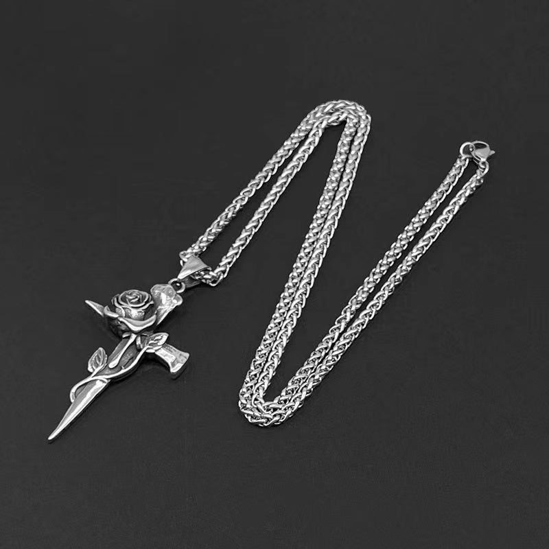 Men's Titanium Steel Chain Cross Rose Pendant Necklace Vintage Sweater Chain