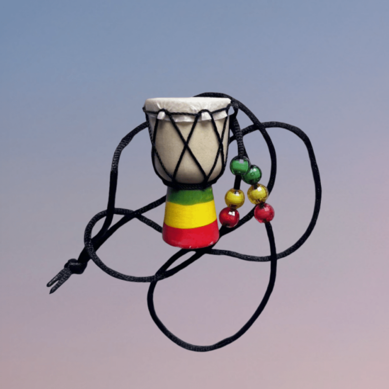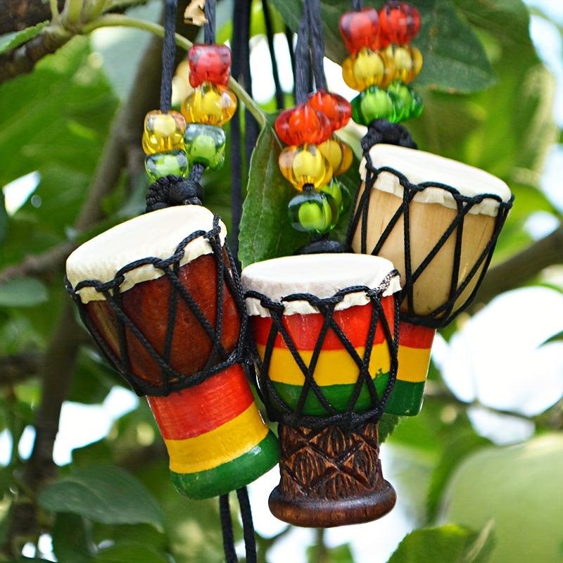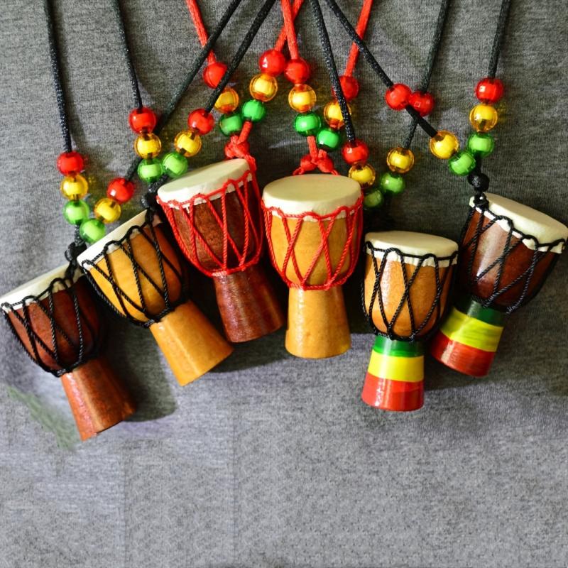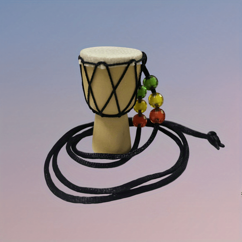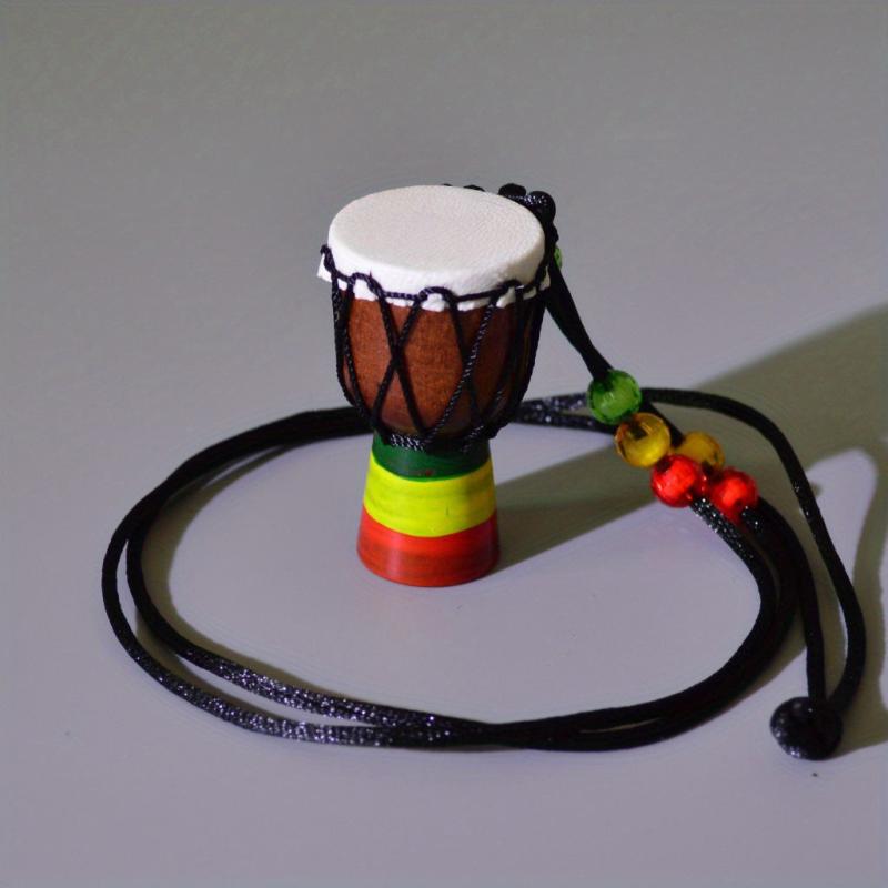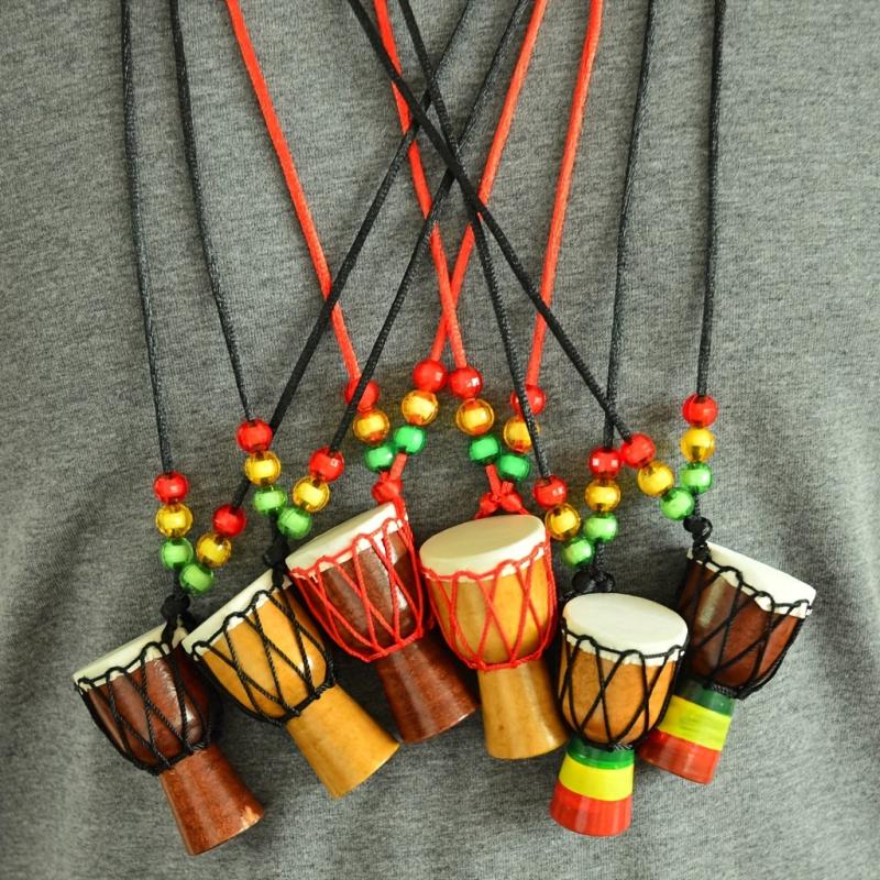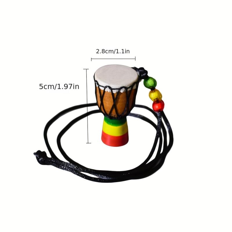This mini African hand drum pendant necklace is a unique piece of jewelry that showcases the beauty of African crafts. The hand drum pendant can be beat like a real drum, adding to its charm.