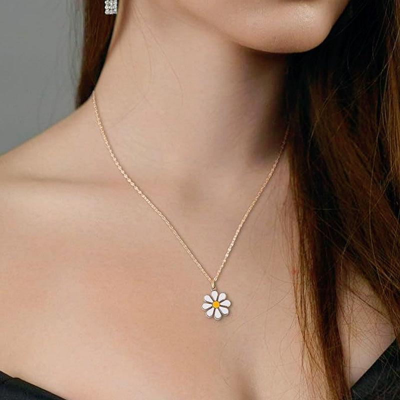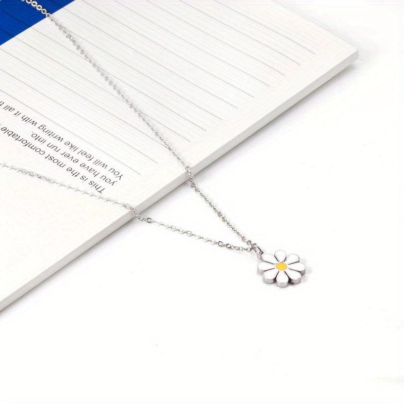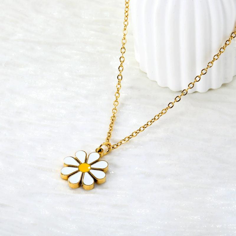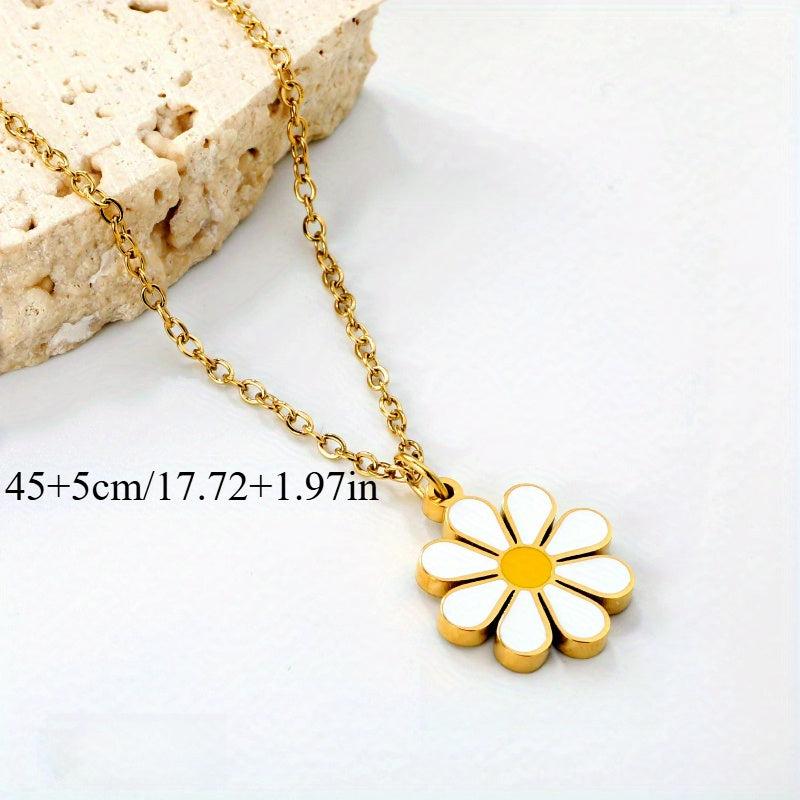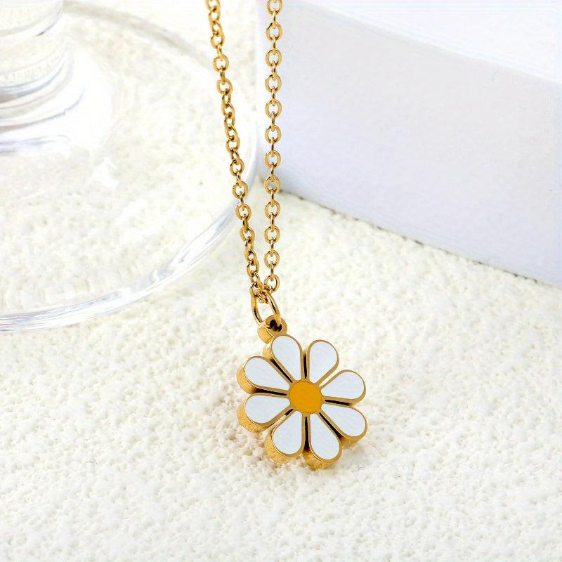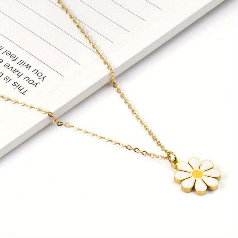 Elegant golden daisy pendant necklace with stainless steel enamel flower charm on a brown chain. Ideal for daily wear or gifting as an everyday accessory.