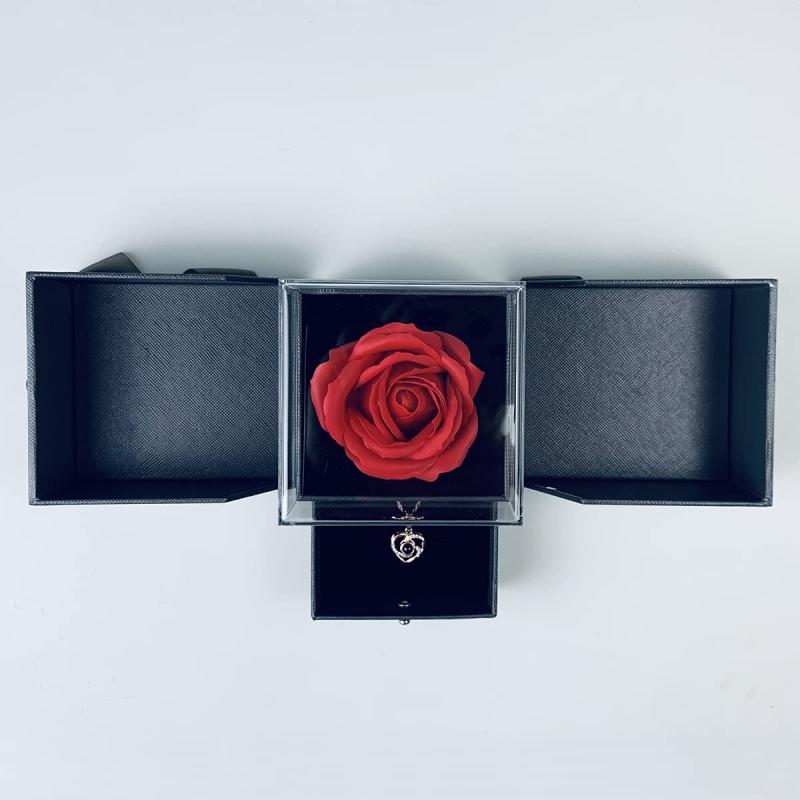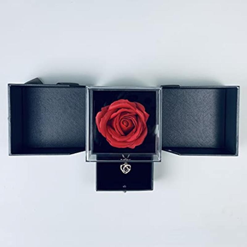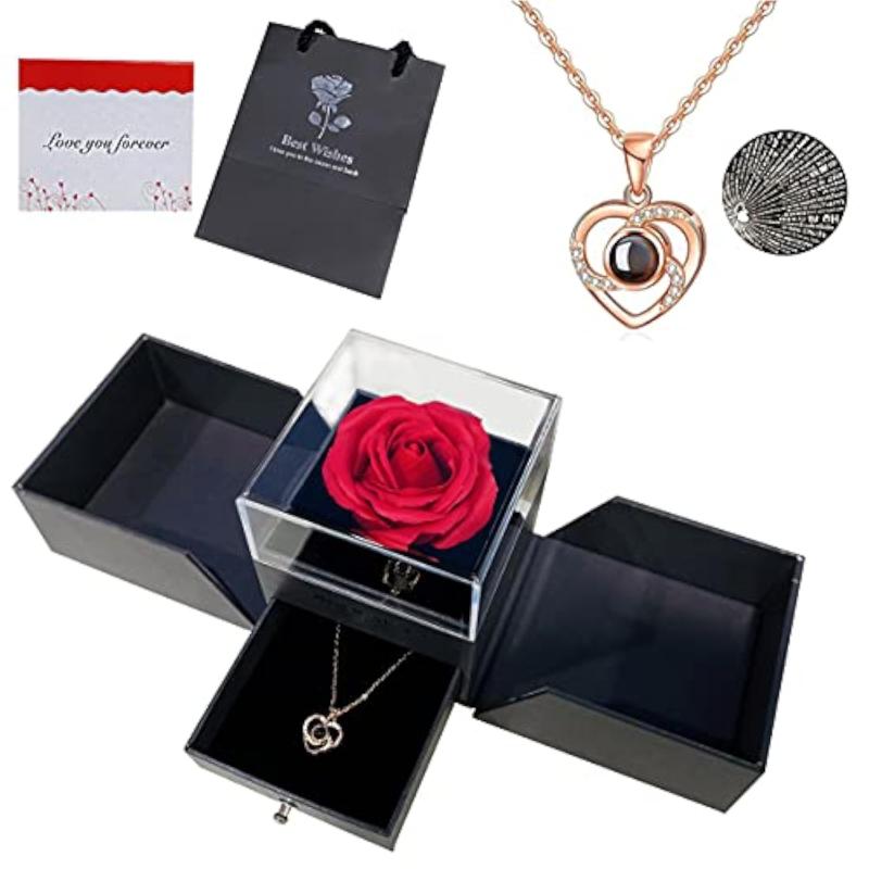 This eternal flower gift set includes a real red rose and a delicate 'I Love You' necklace, perfect to show your love and appreciation. The preserved rose will last forever, making it a meaningful keepsake.