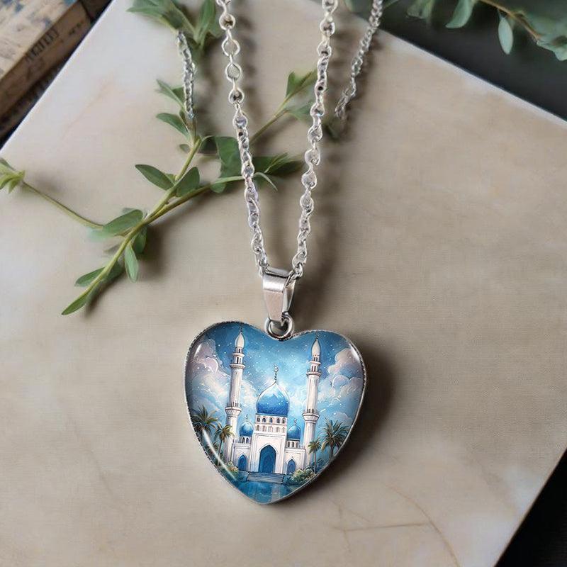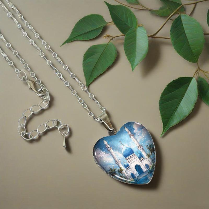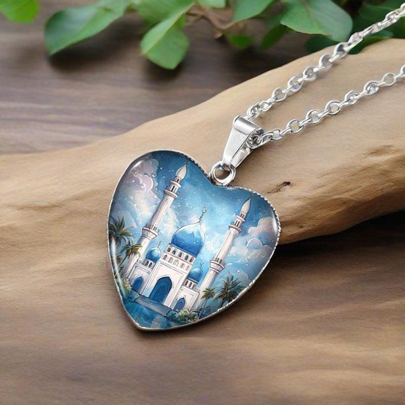 This exquisite pendant necklace features a dreamy mosque design crafted in glass, perfect for adding a touch of elegance to your attire.