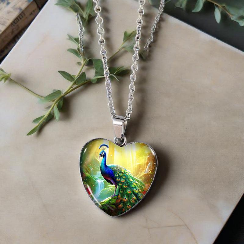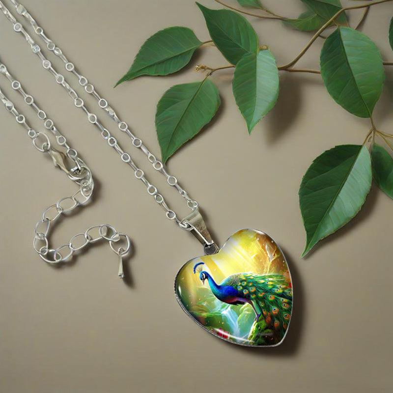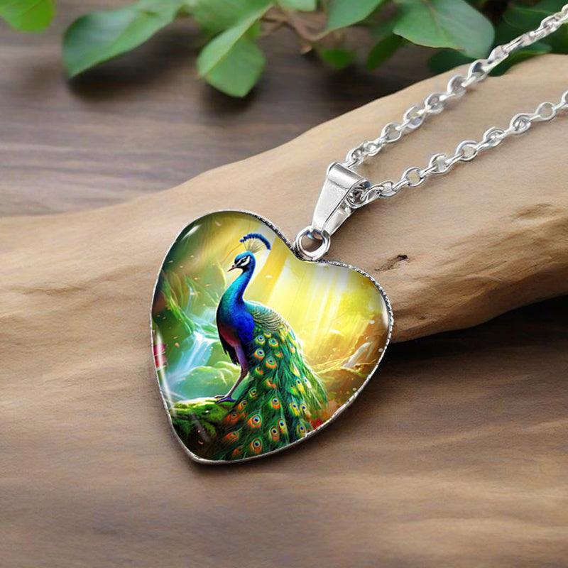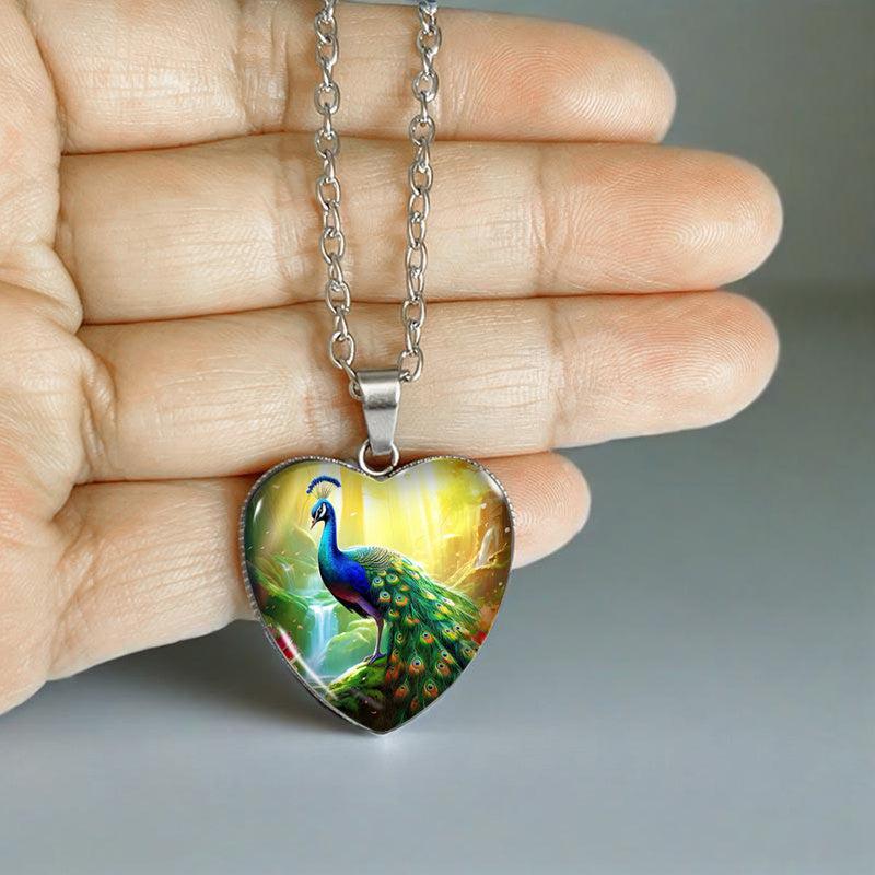 This exquisite pendant necklace features a heart-shaped glass pendant with a stunning mountain peacock design. It's a perfect accessory for men looking to add a touch of style to their outfits.