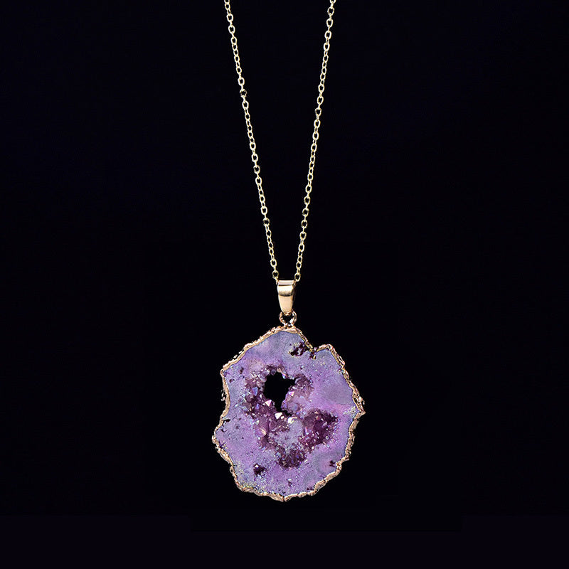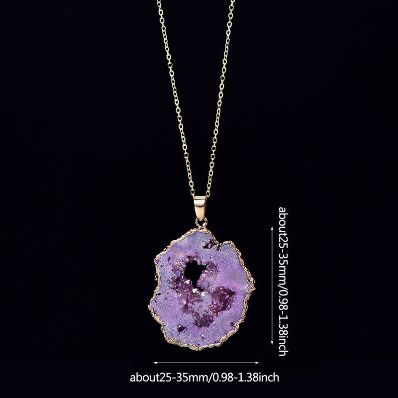 Enhance your style with this stunning pendant necklace featuring a natural agate quartz geode slice with crystal amethyst inlay and plated edge. The irregular hollow design adds a unique touch.