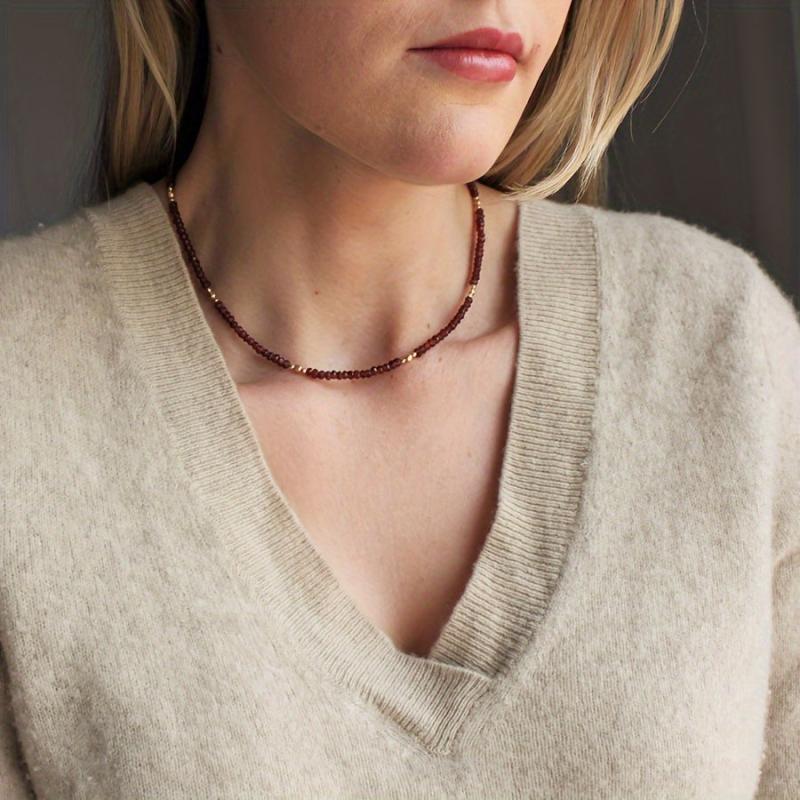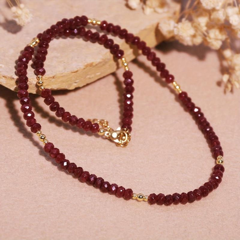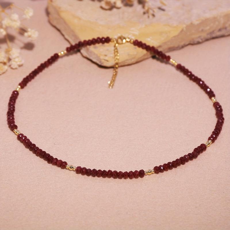 Elegant garnet stone necklace with deep red gemstone set in golden tone metal. Perfect for women who love unique jewelry pieces.