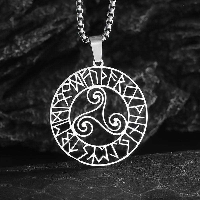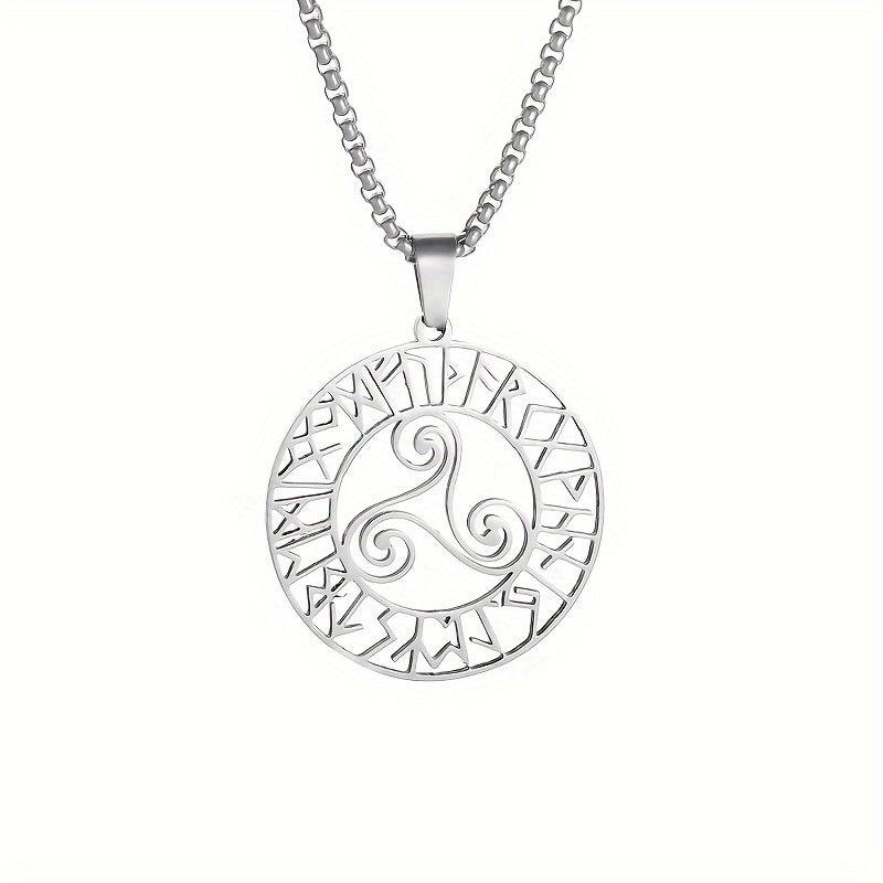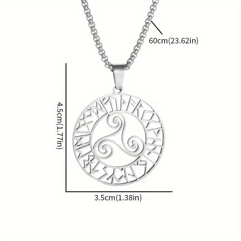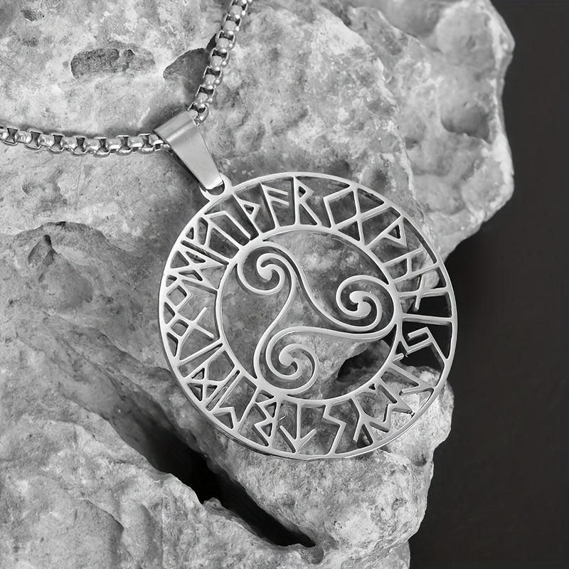 This pendant necklace features intricate rune engravings inspired by Nordic mythology. It is made of durable stainless steel, perfect for everyday wear. A great gift for anyone who appreciates geometric designs and mythology.
