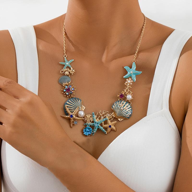 Elevate your look with this stunning Ocean Breeze Necklace featuring a stylish zinc alloy chain adorned with sparkling rhinestones, delicate seashell, starfish, and coral charms. Perfect for adding a touch of seaside elegance to any outfit.