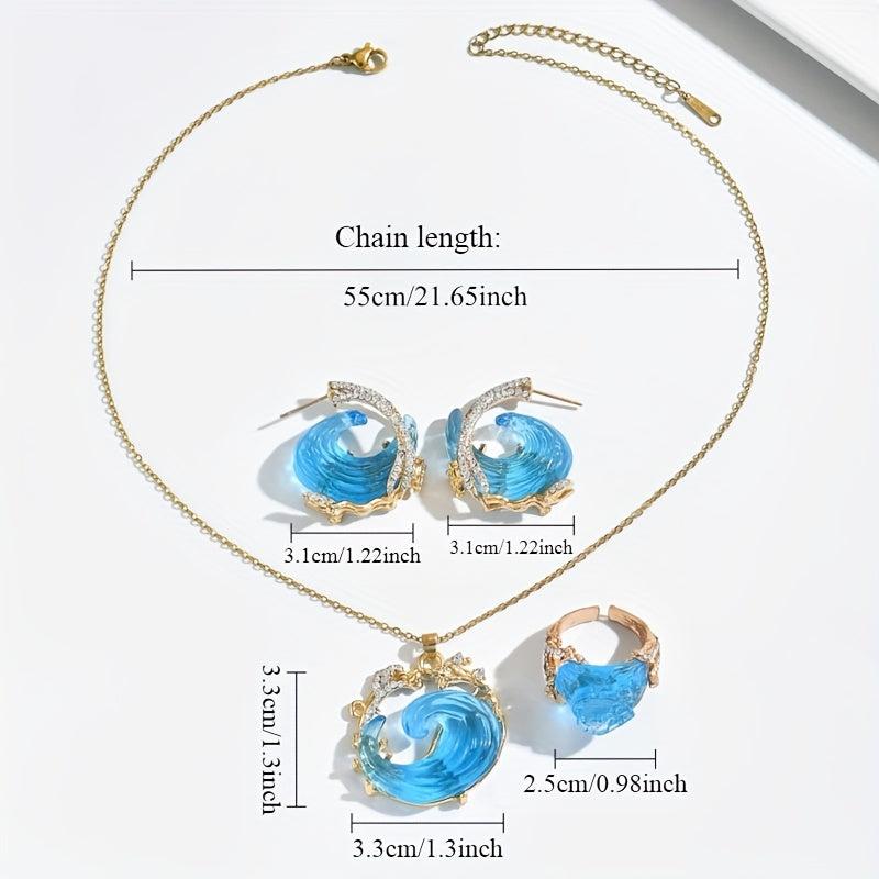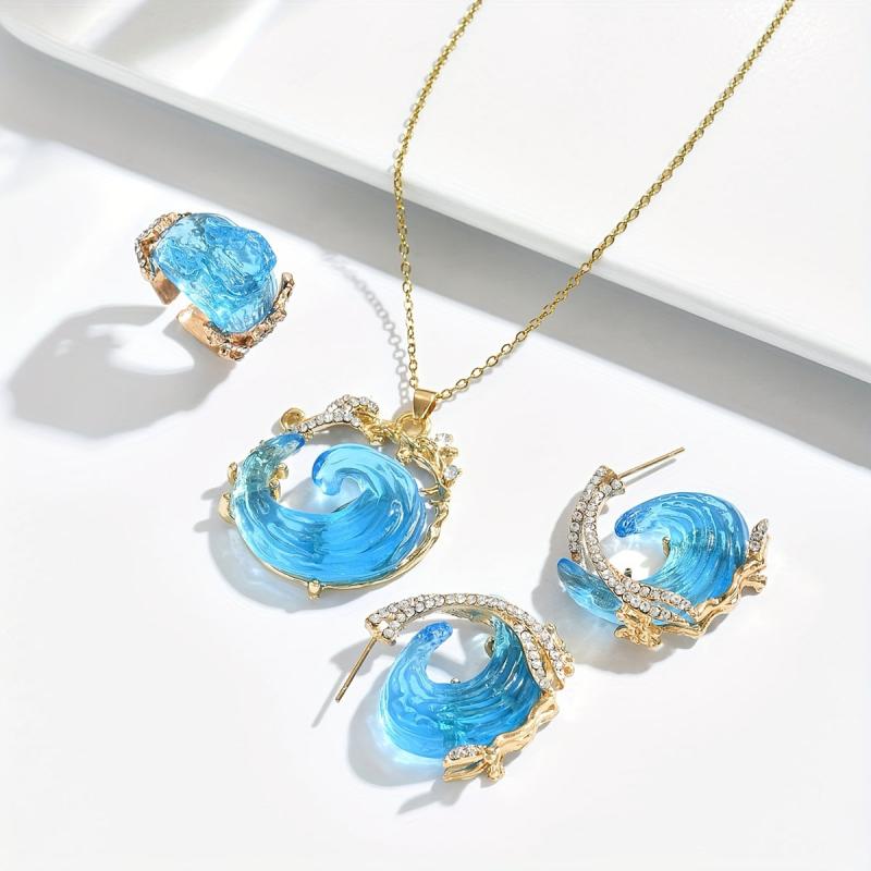 Embrace the beauty of the ocean with this creative jewelry set featuring a sky resin necklace pendant, earrings, and ring. Perfect accessories for any occasion.