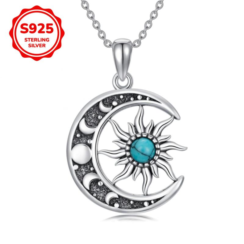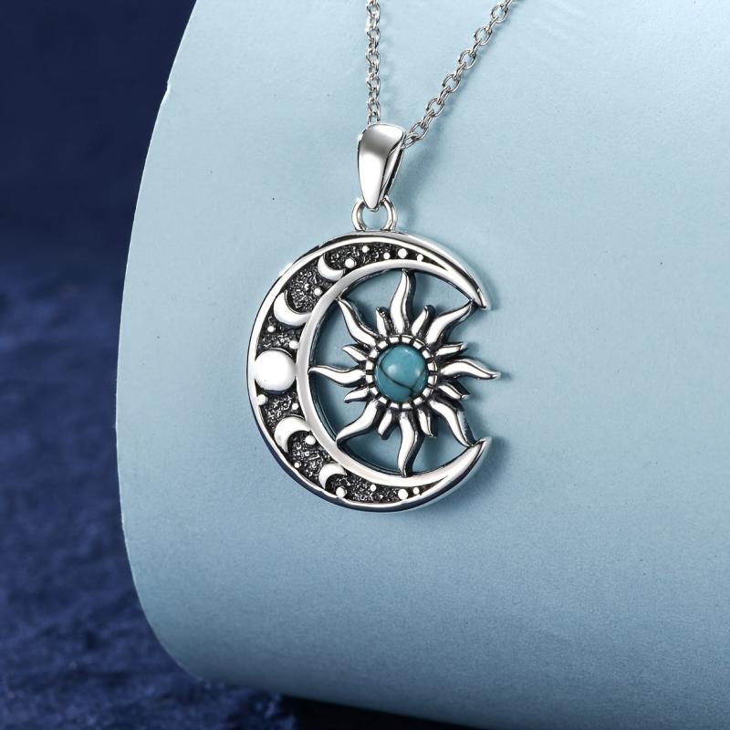Elegant vintage bohemian necklace featuring moon and sun design with turquoise inlay. Hypoallergenic and suitable for daily wear, gatherings, and parties.