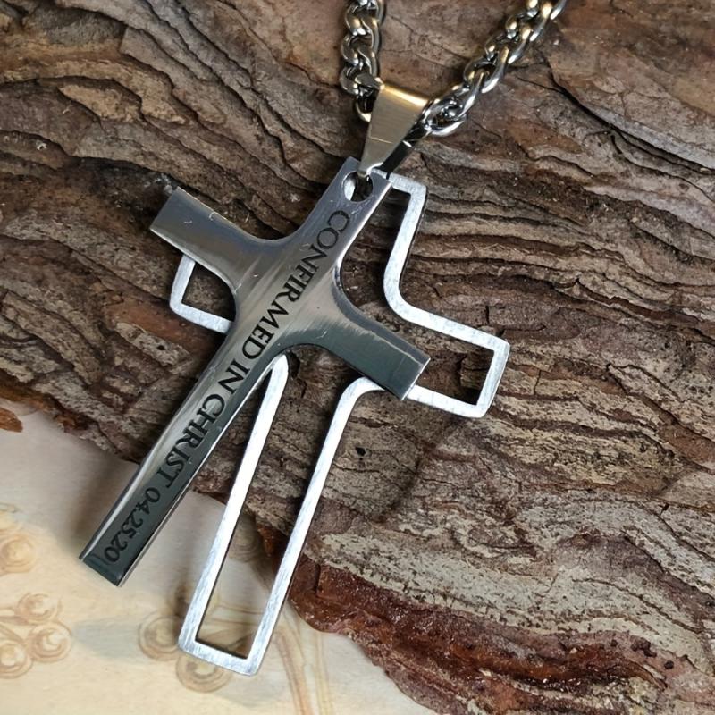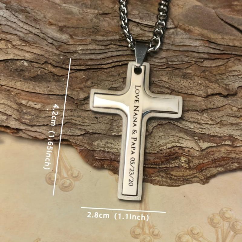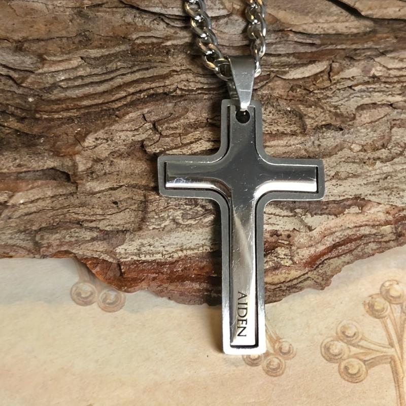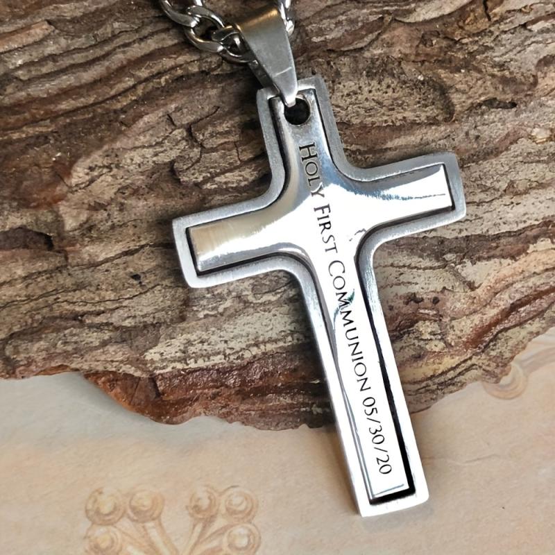 This sleek stainless steel cross pendant necklace can be customized with a name for a special touch. Perfect for First Communion or casual wear.