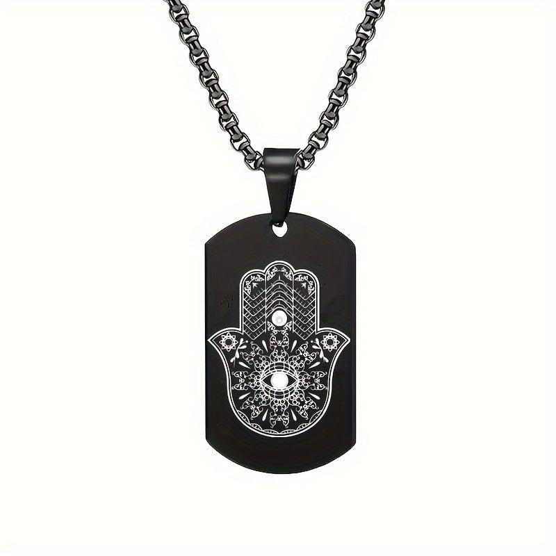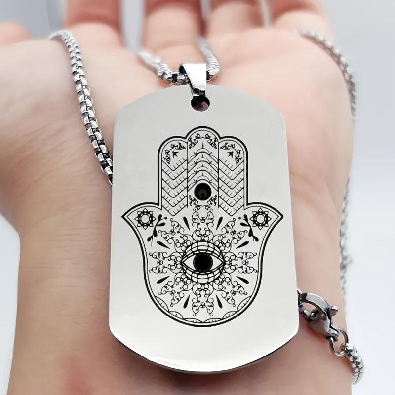 This unique necklace features a Fatima Hand pendant customized with your name, date, Bible verse, or prayer. A beautiful Middle Eastern Arabic lucky hand design.
