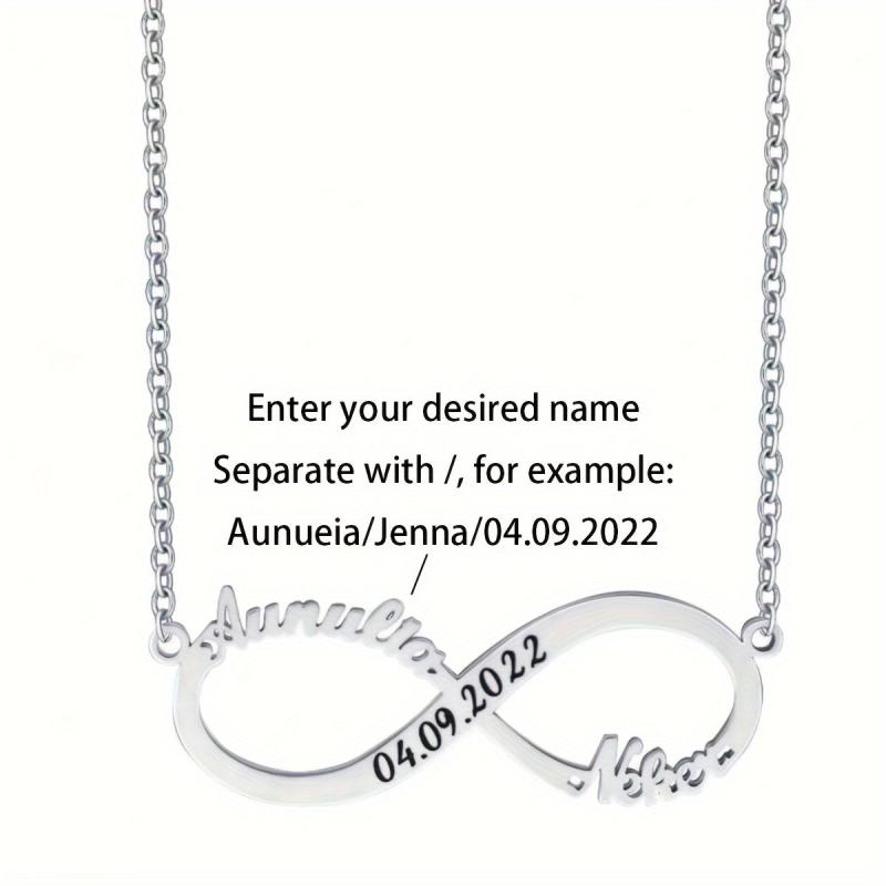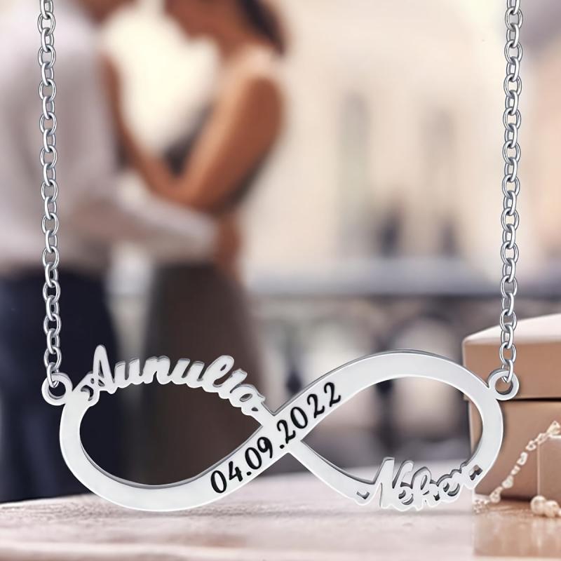 This stylish pendant necklace features an infinity heart design with custom names and date. Made of 304 stainless steel and perfect for daily wear. A thoughtful gift for women.
