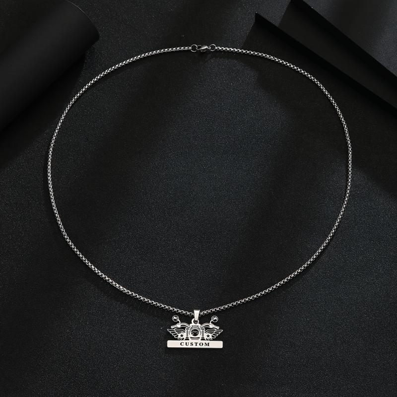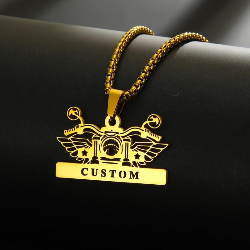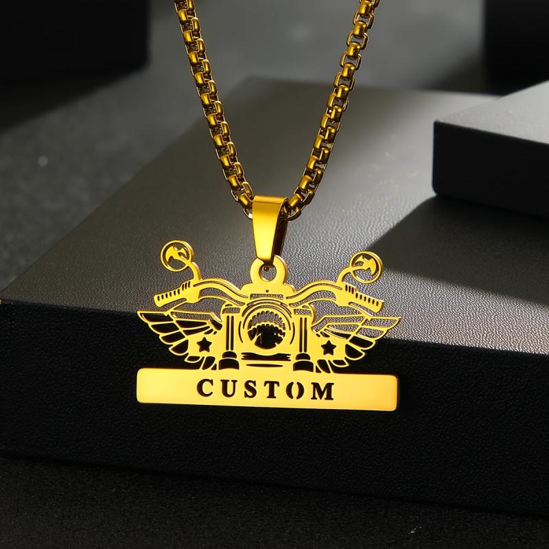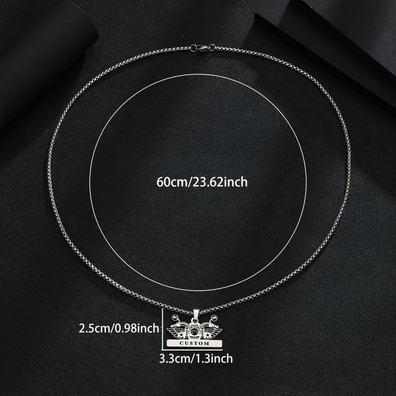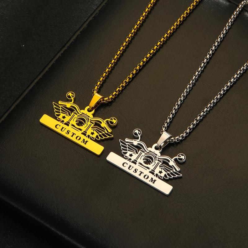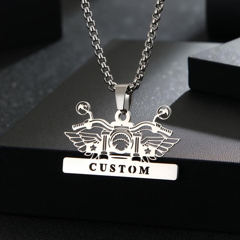 Get this durable stainless steel pendant necklace as a perfect gift for motorcycle enthusiasts. Custom name option available. Ideal for Father's Day, graduation, or special occasions.