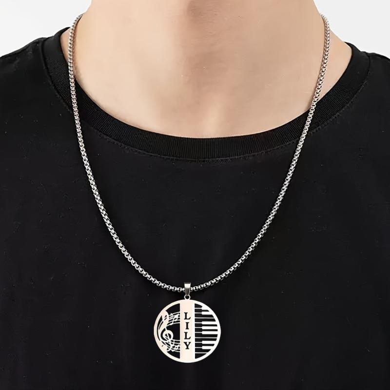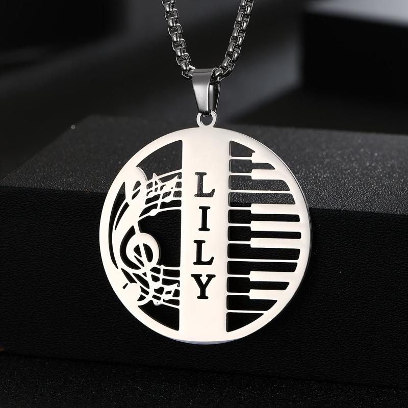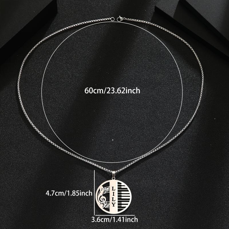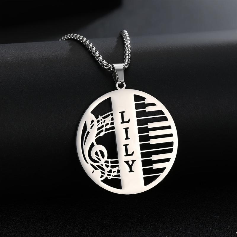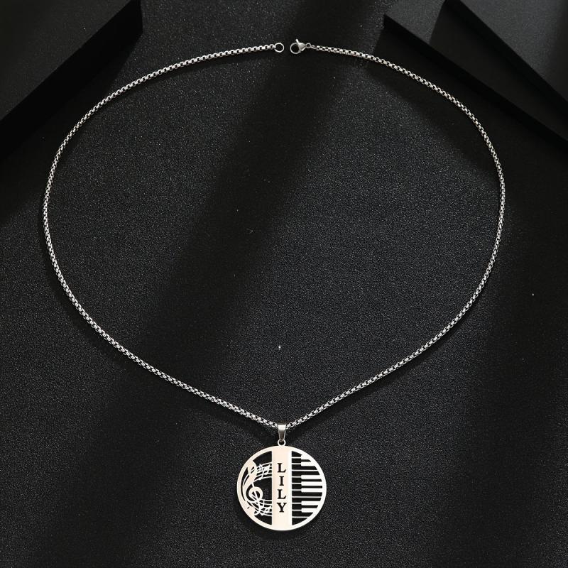 This stainless steel necklace features a piano keyboard pendant with the option to personalize it with a name engraving. It makes an ideal gift for music lovers, pianists, and anyone who appreciates unique jewelry.