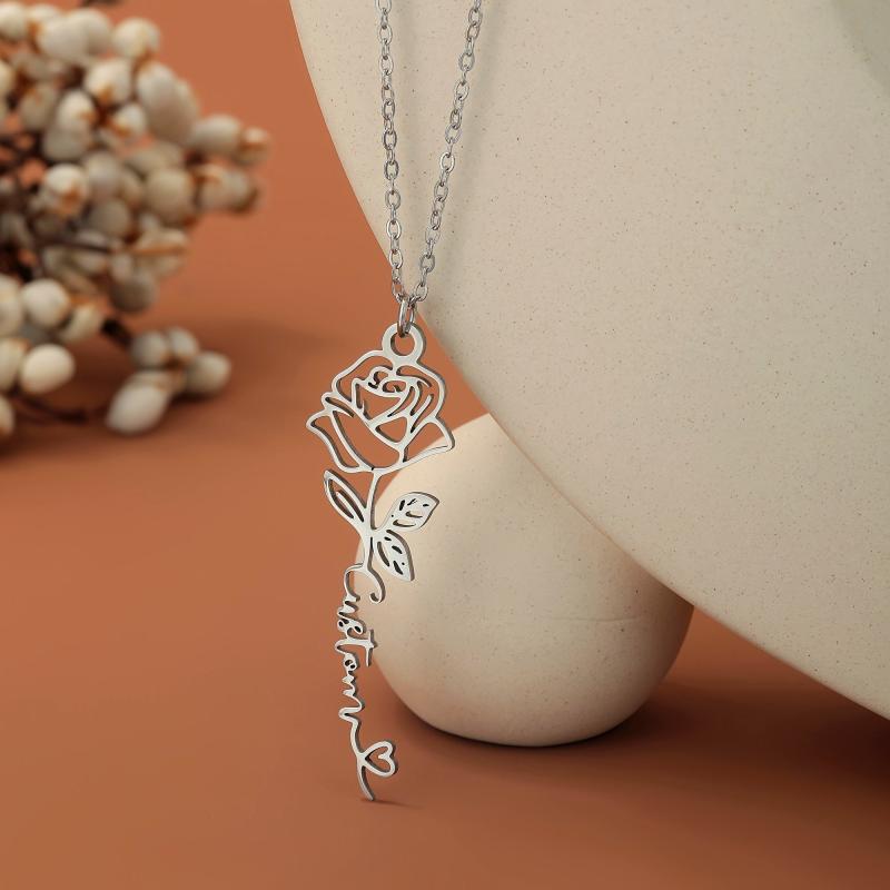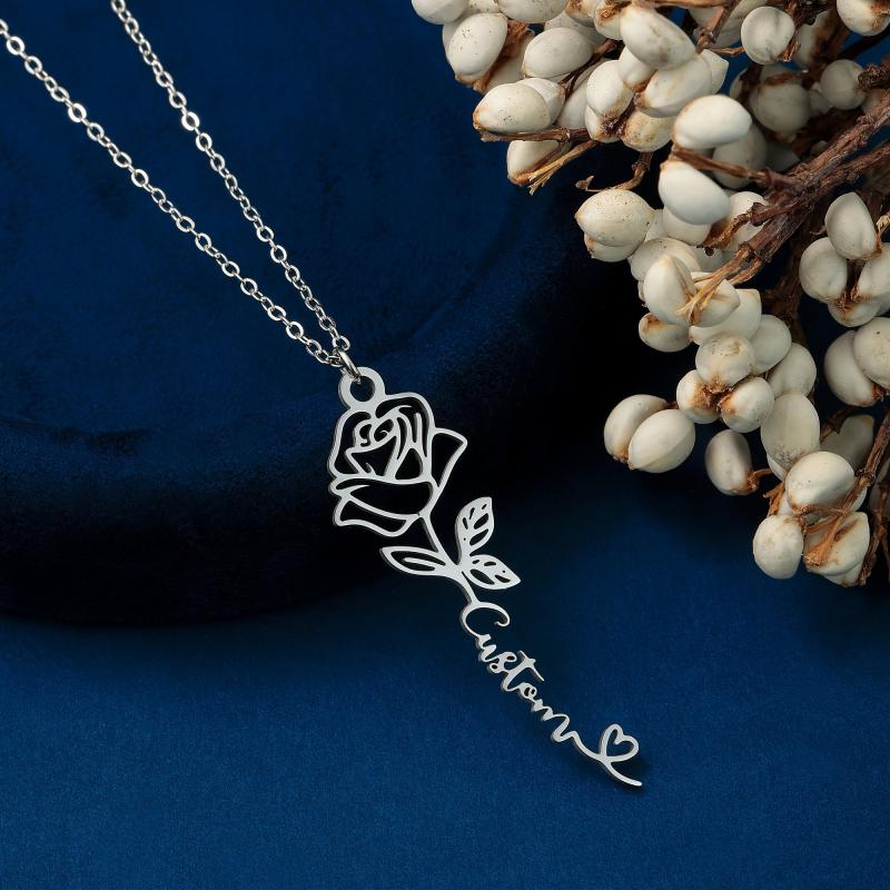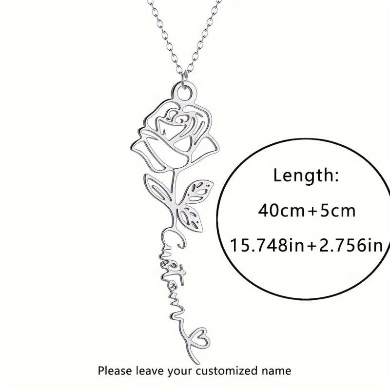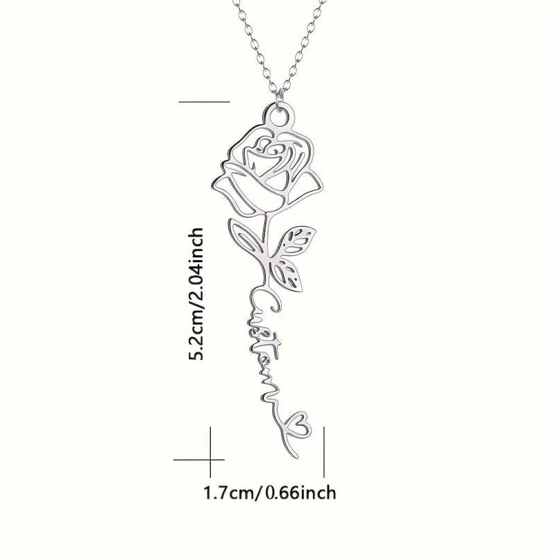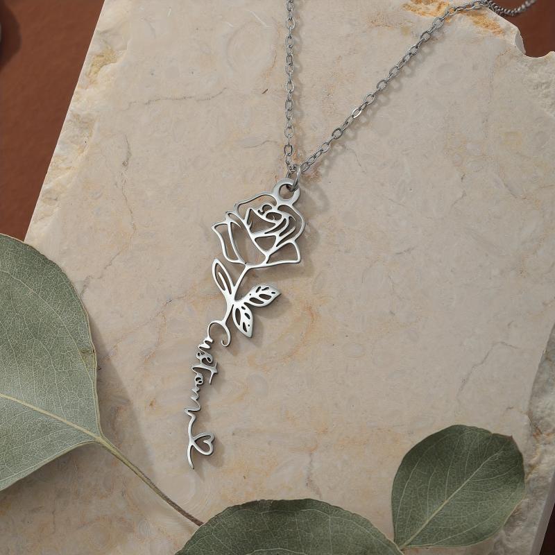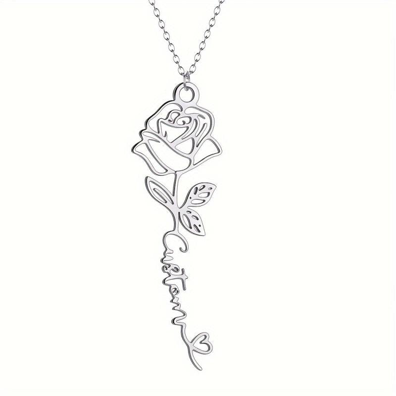 This beautiful stainless steel necklace features a rose design along with a custom name pendant. It makes a perfect gift for a loved one or yourself.