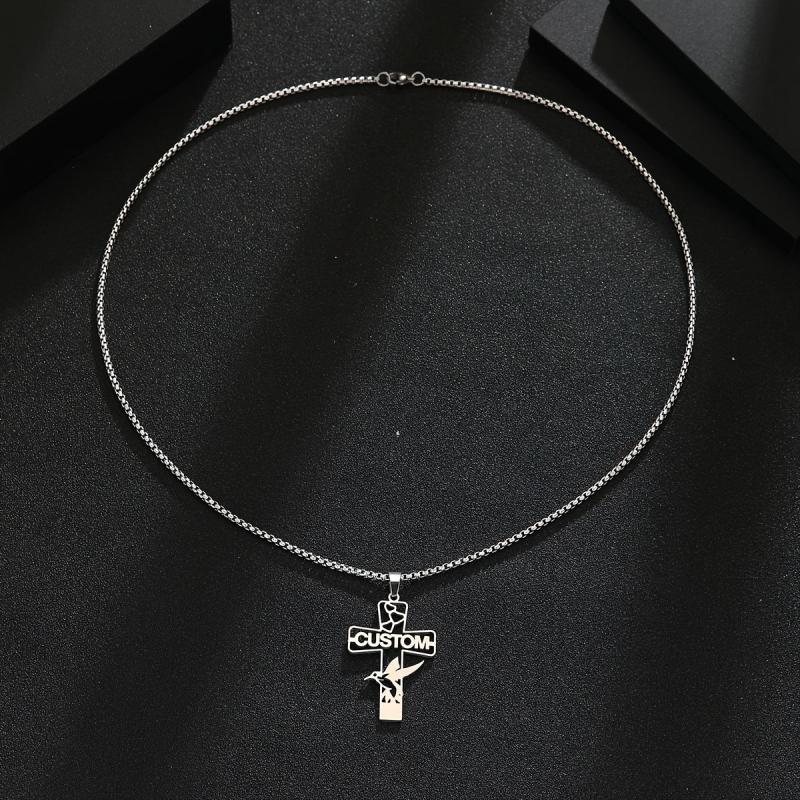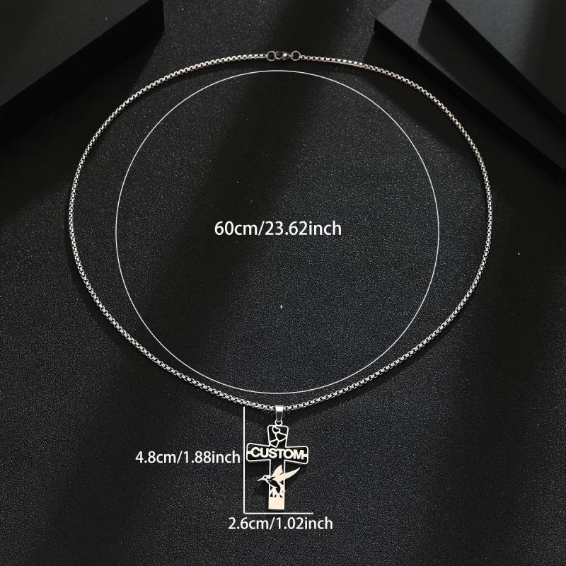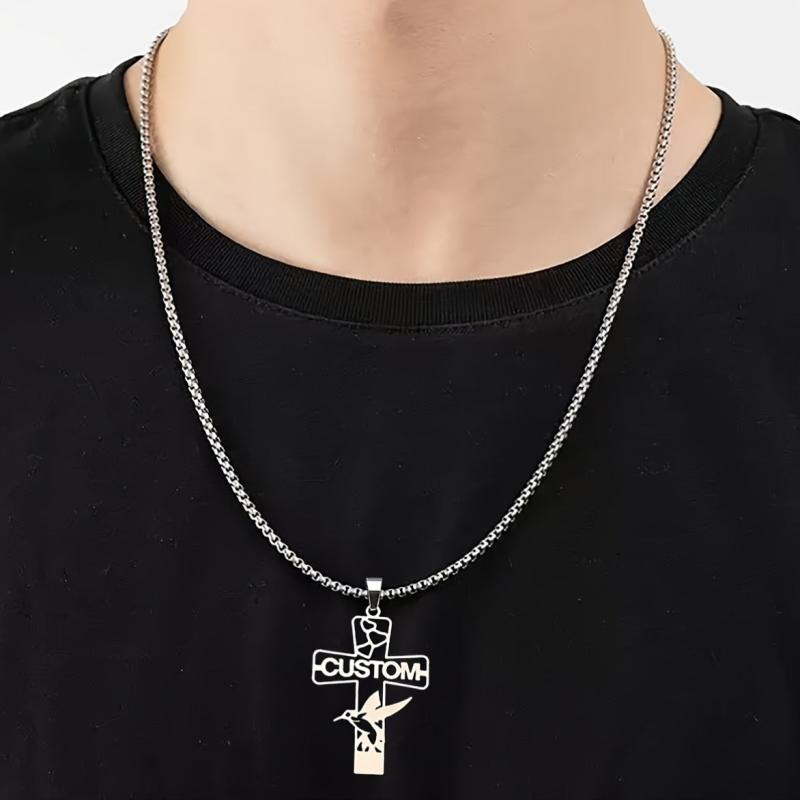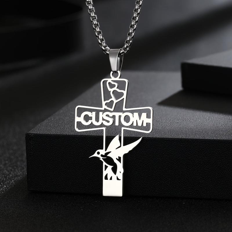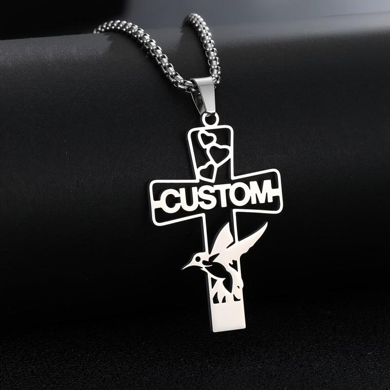 This custom engraved stainless steel cross pendant necklace features a love bird design and can be personalized with a name. It's a perfect gift for men and women on Valentine's Day or any special occasion.