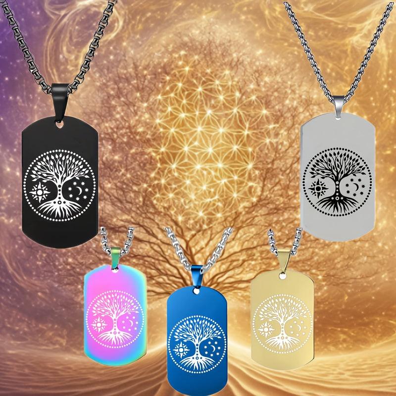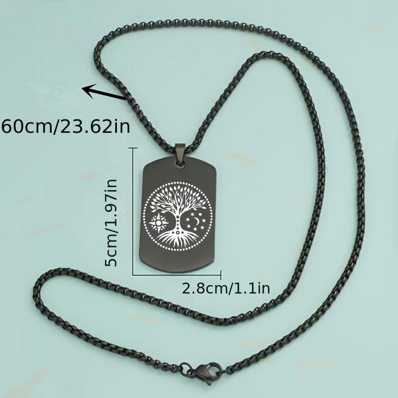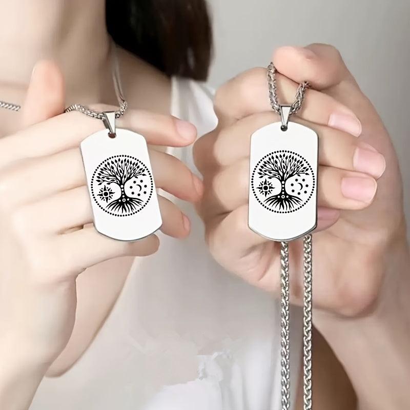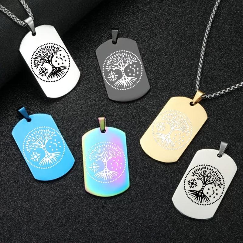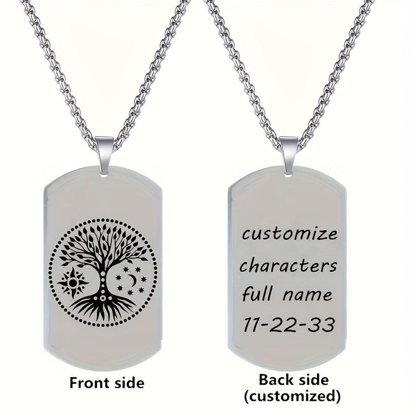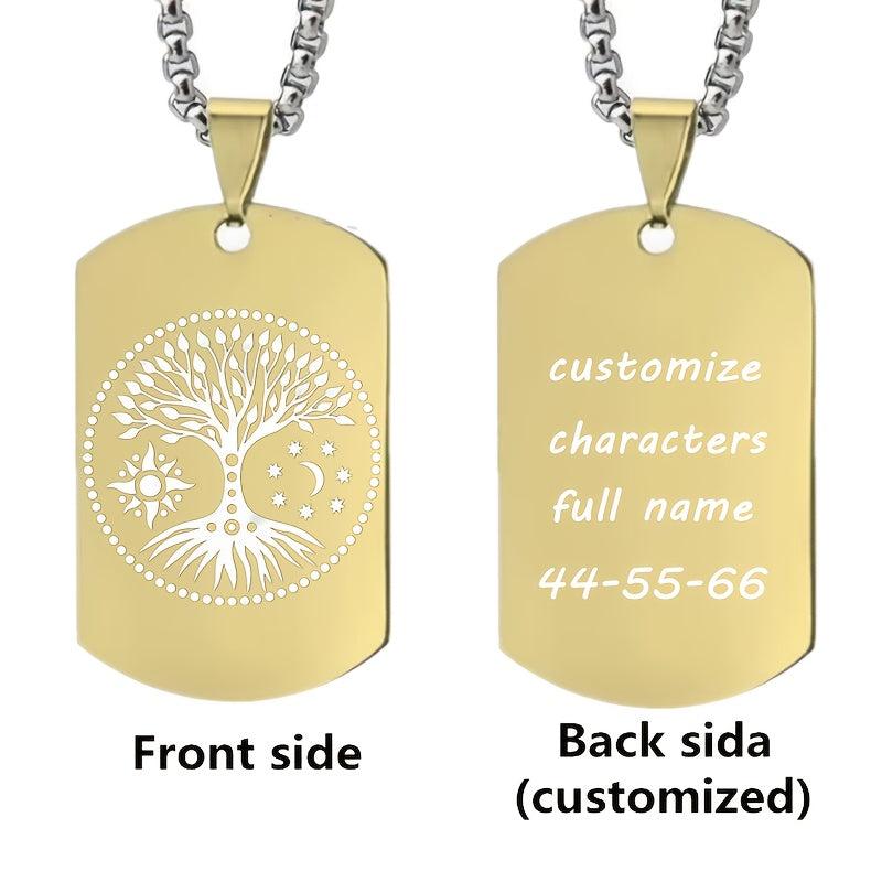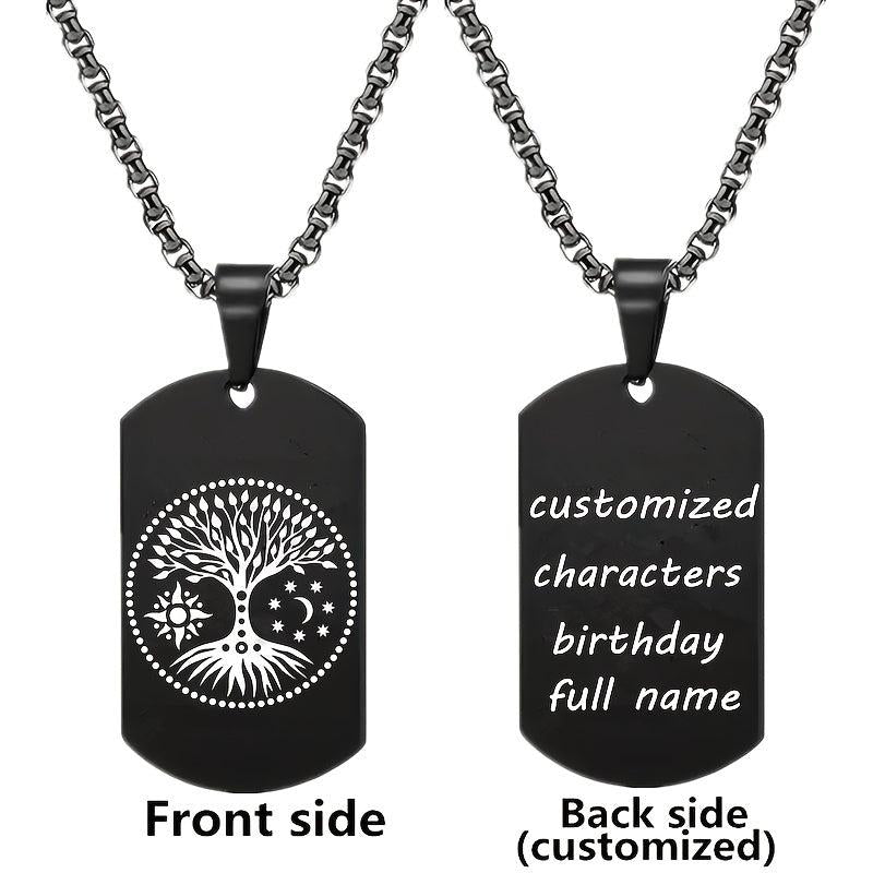 This custom engraved stainless steel necklace features a Tree of Life design with a Sun and Moon charm. It makes an ideal gift for Father's, Mother's, Halloween, Christmas, and more.