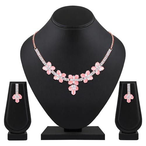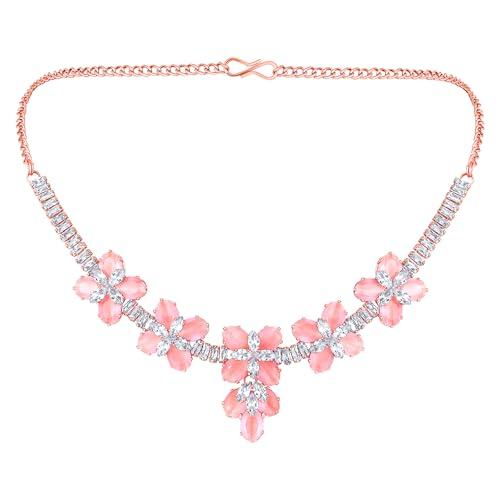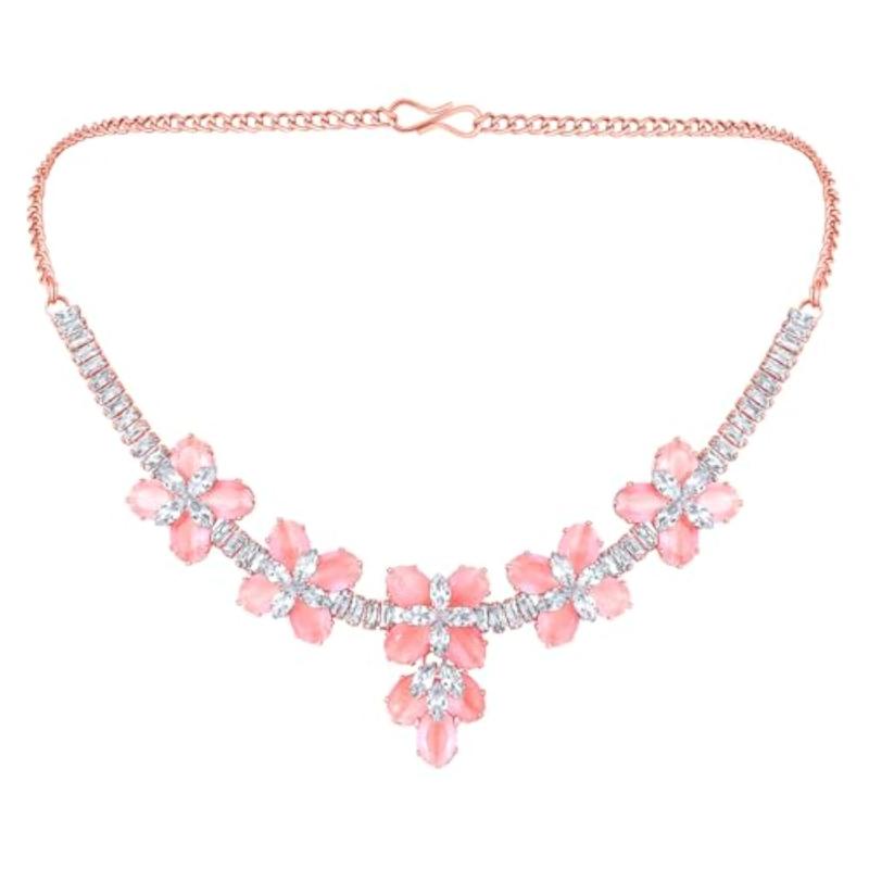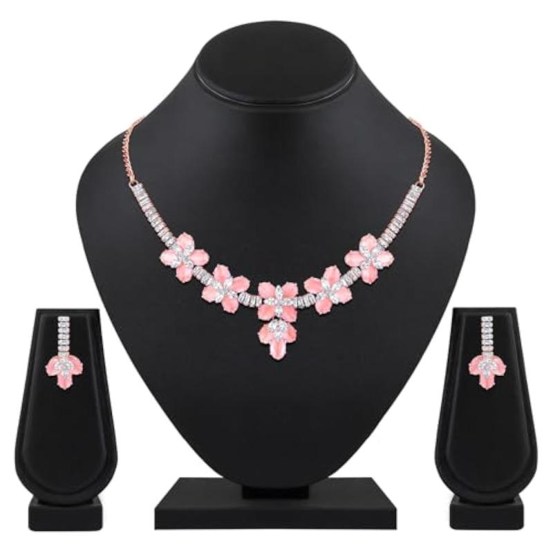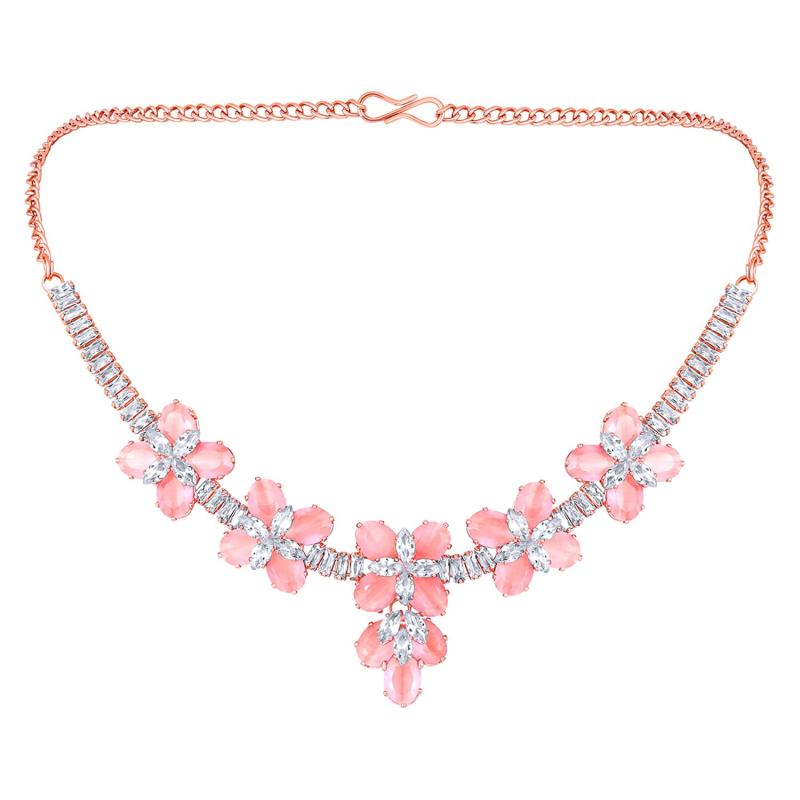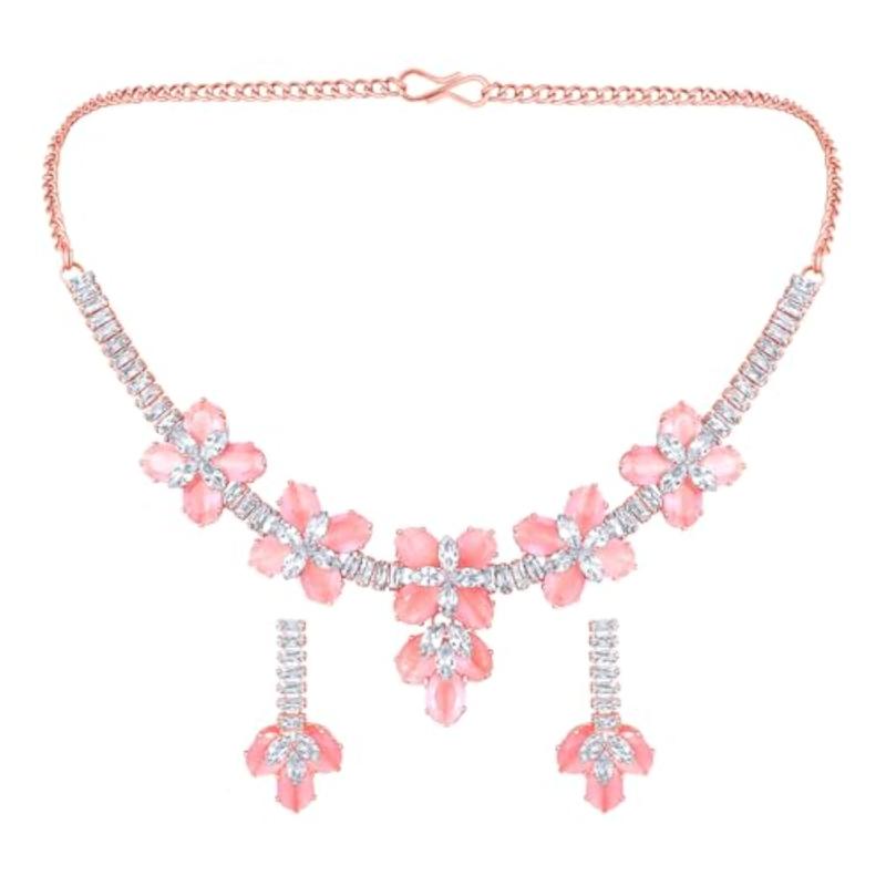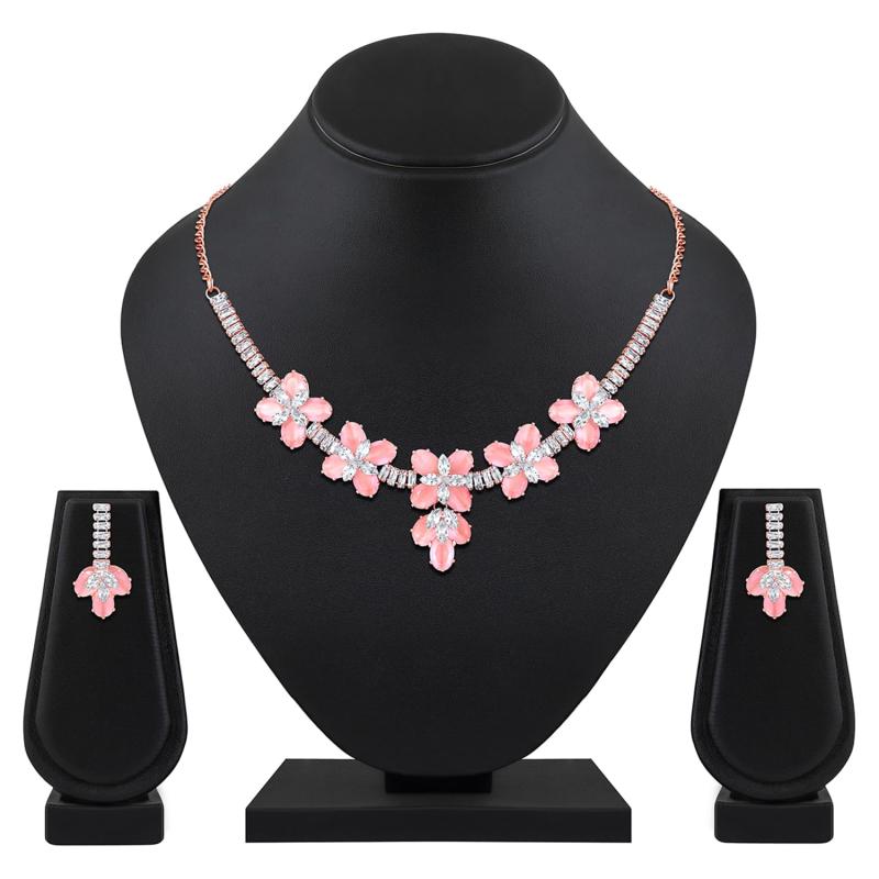 Elegant necklace set featuring pink CZ stones in a floral design. Rose plated for a feminine touch.