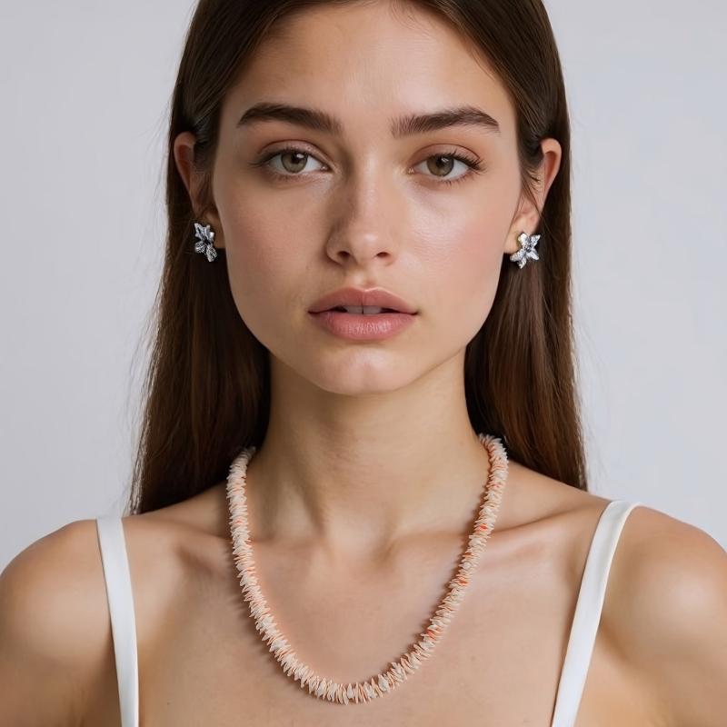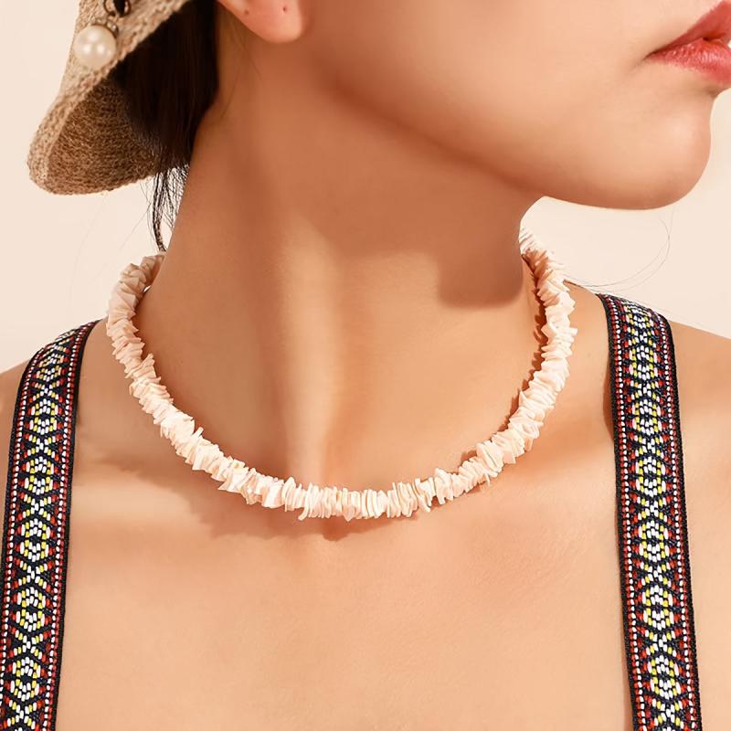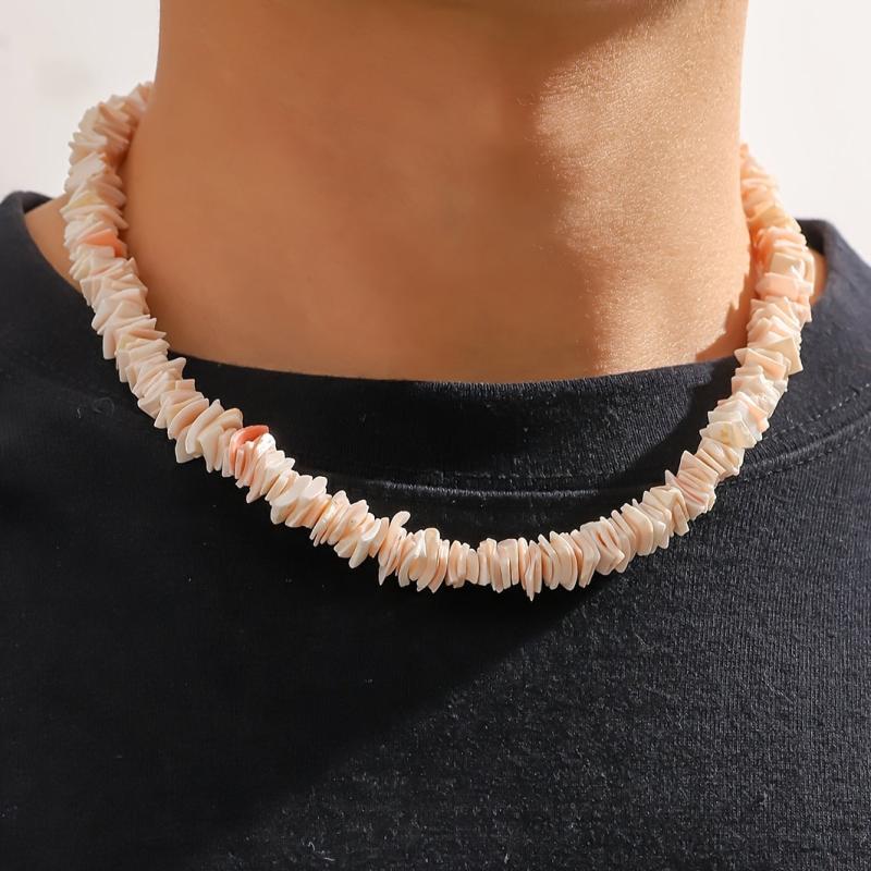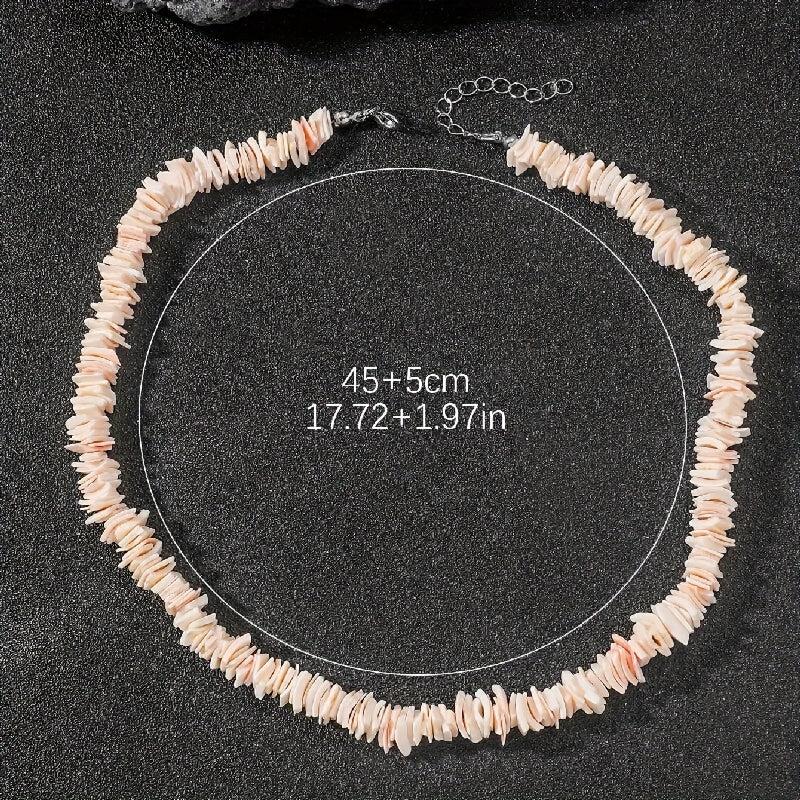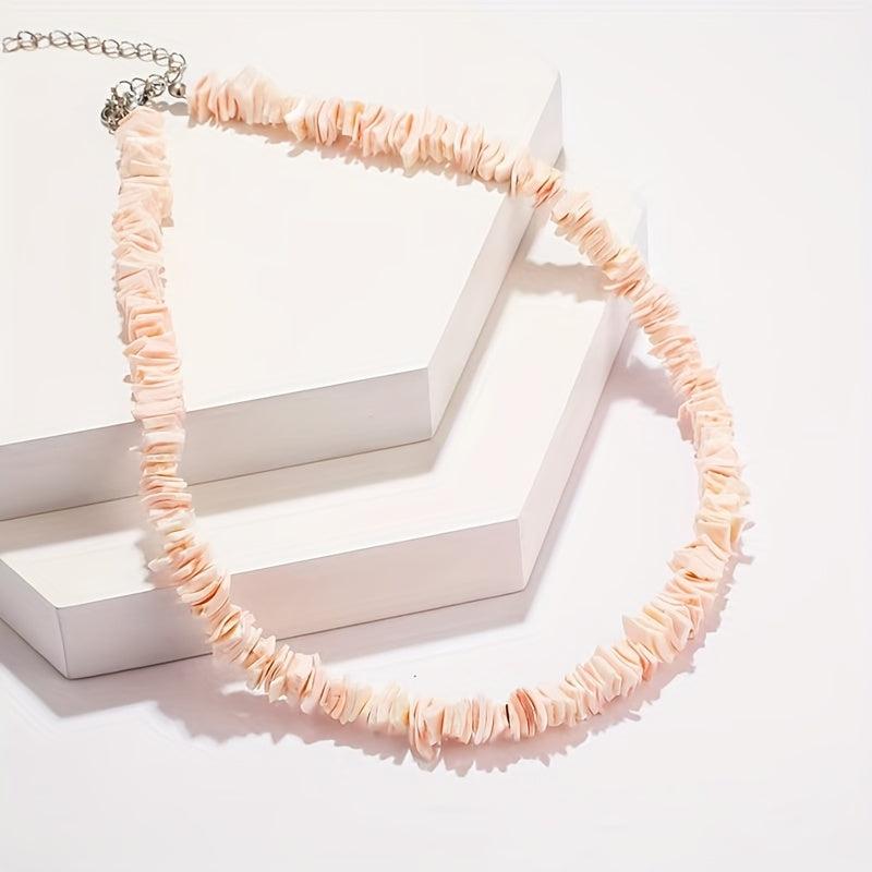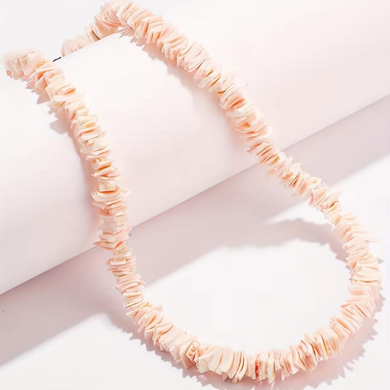 Enhance your casual attire and summer vacation outfits with this lightweight pink shell bead necklace. Made from natural materials, this bohemian necklace features peachy pink tones that add a touch of charm to your look. Perfect for those with a January birthstone.