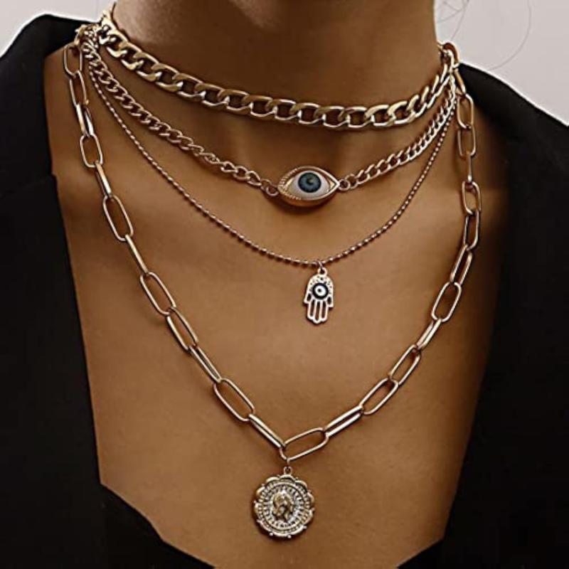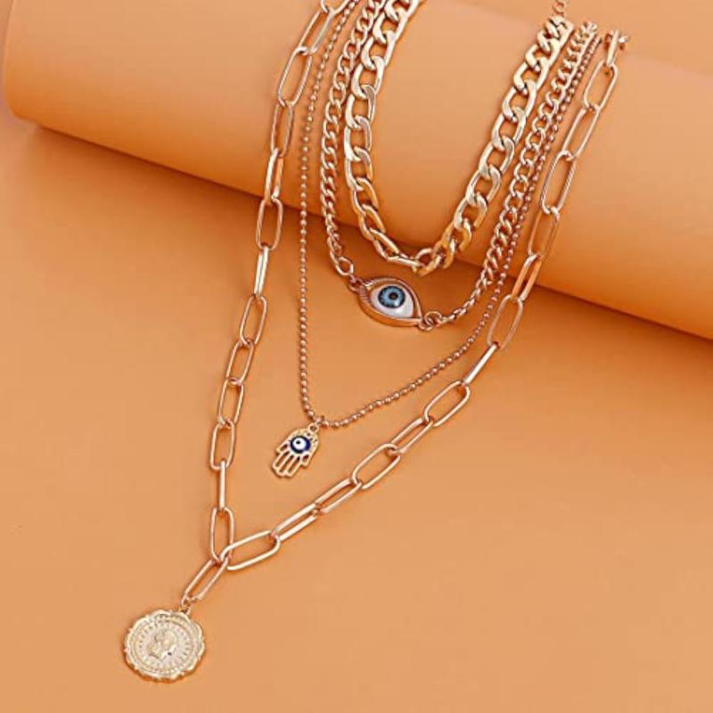 Elegant plated-toned necklace with evil eye and Buddha hand pendant. A beautiful accessory for a stylish look.