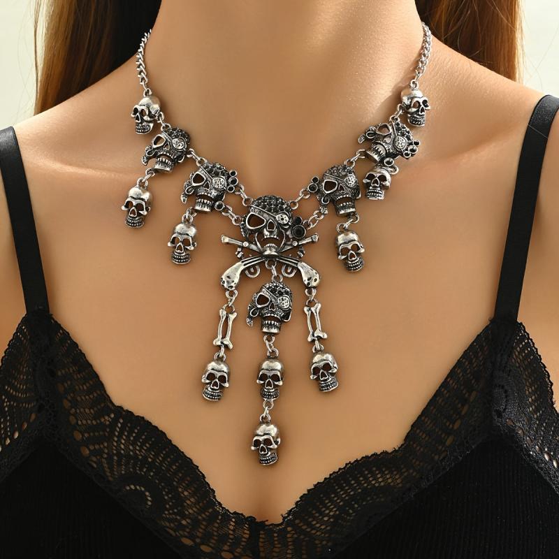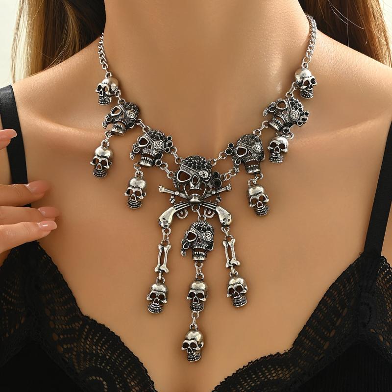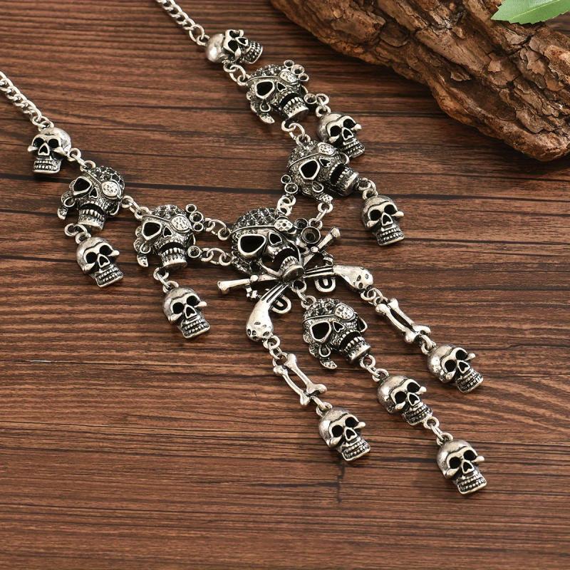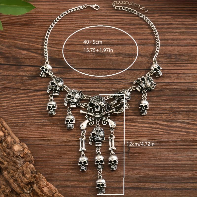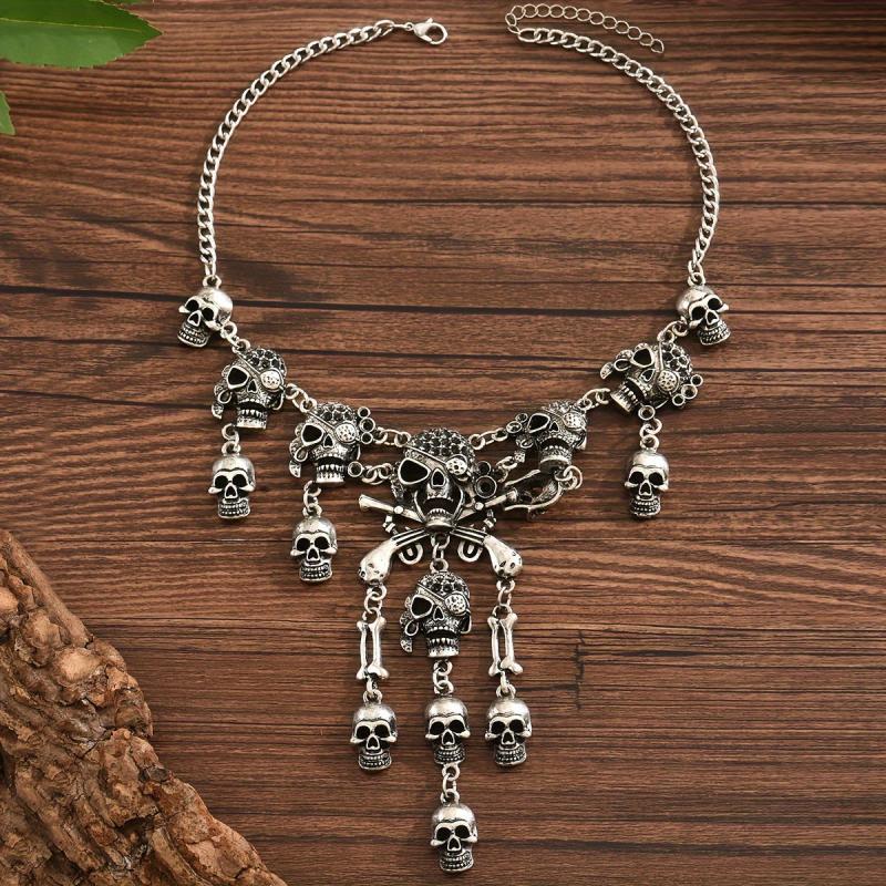 Add a touch of edgy style to your outfit with this Punk Gothic Skull Necklace. Perfect for Halloween or everyday wear, this pirate-inspired pendant features intricate chain detailing.
