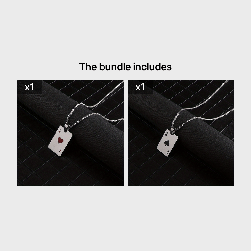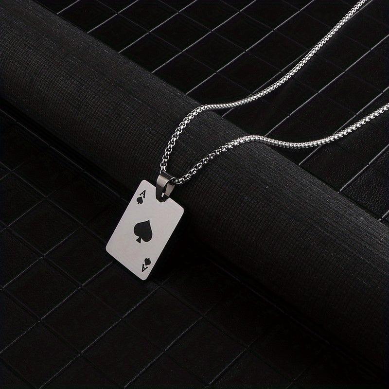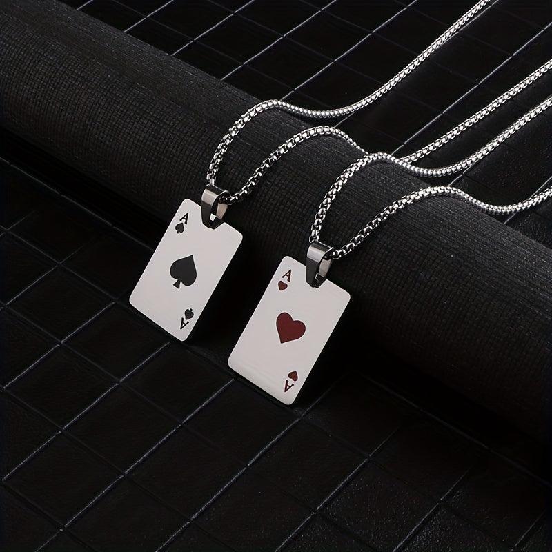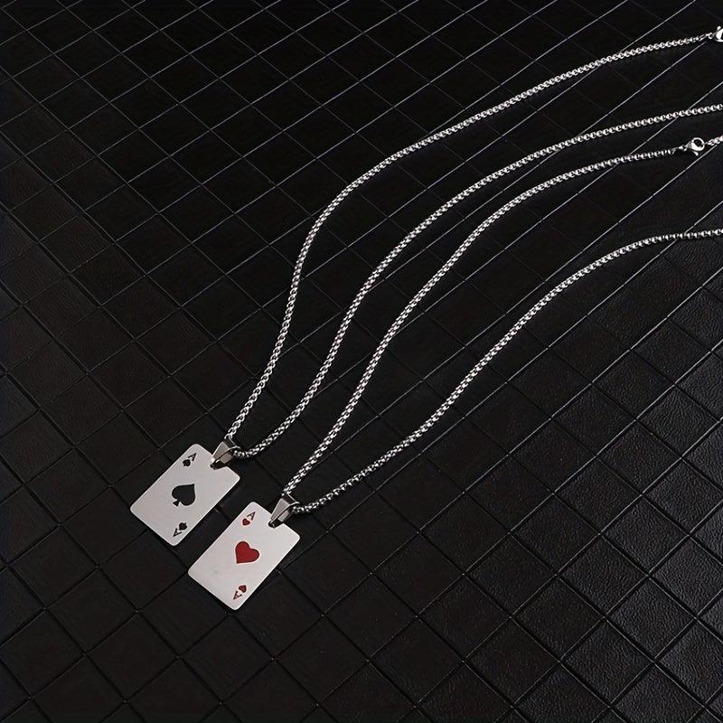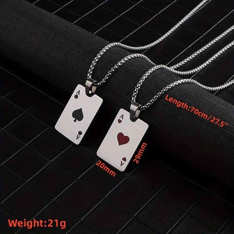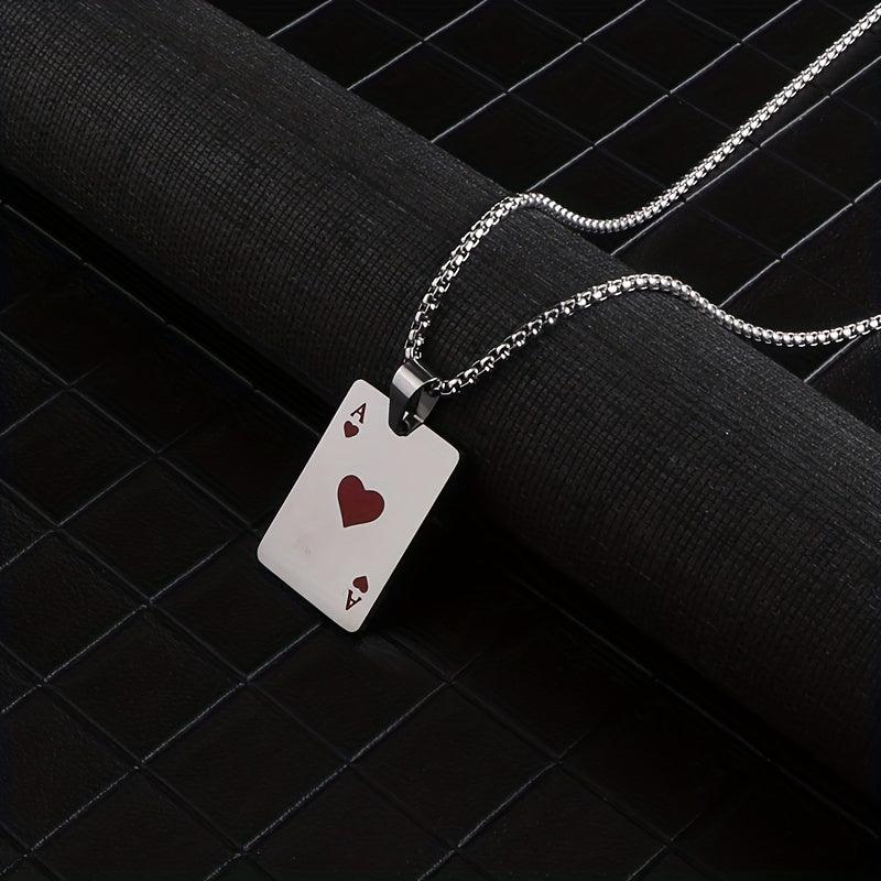 Stainless steel necklace with long chain featuring a lucky peach heart king card poker pendant. Rust-resistant and stylish design for men.