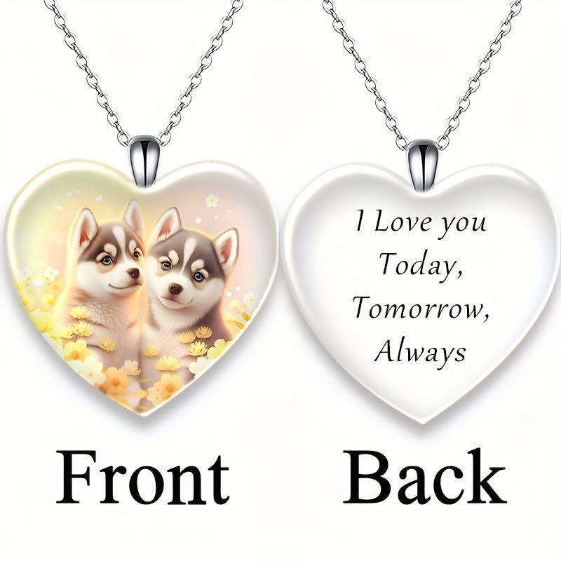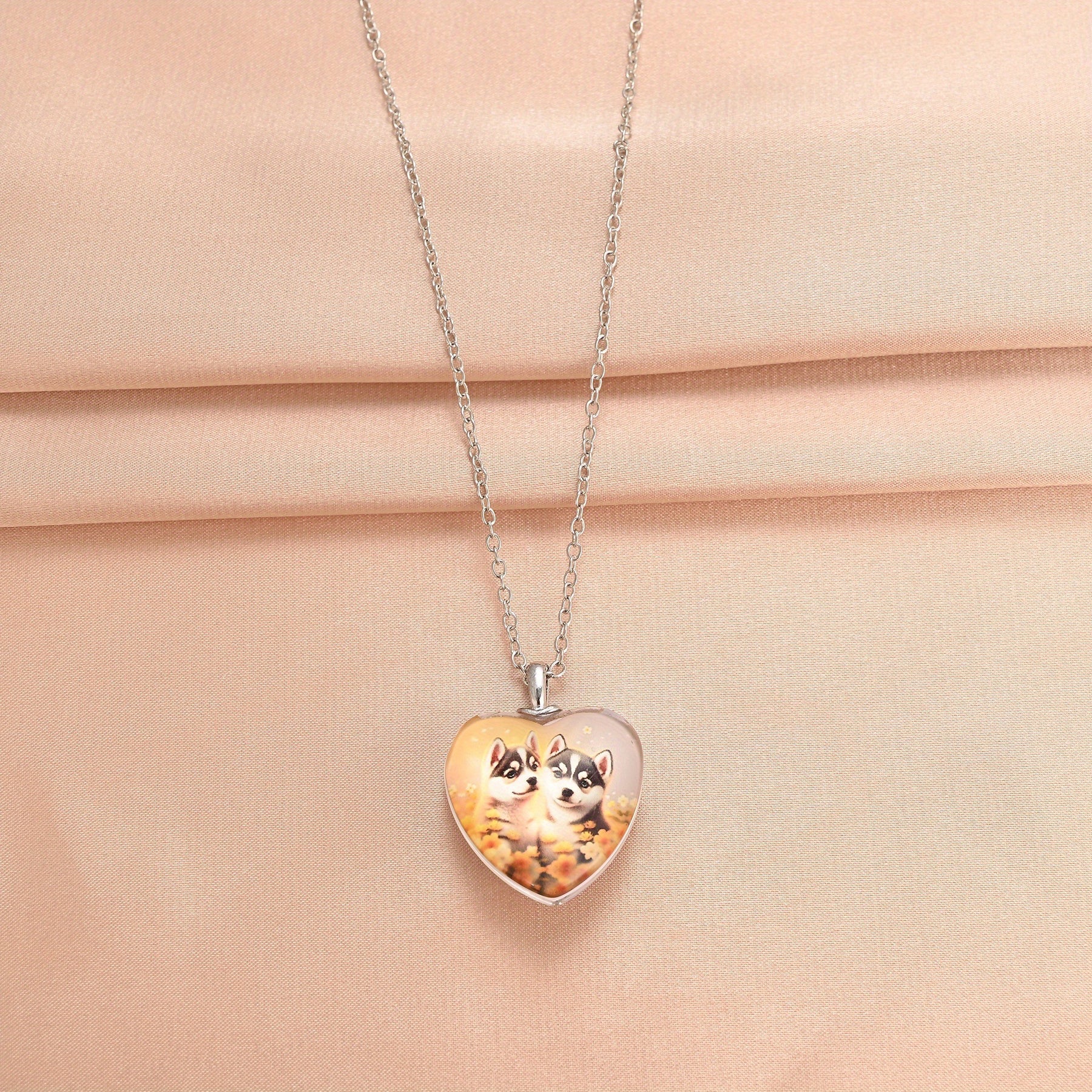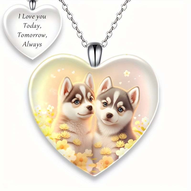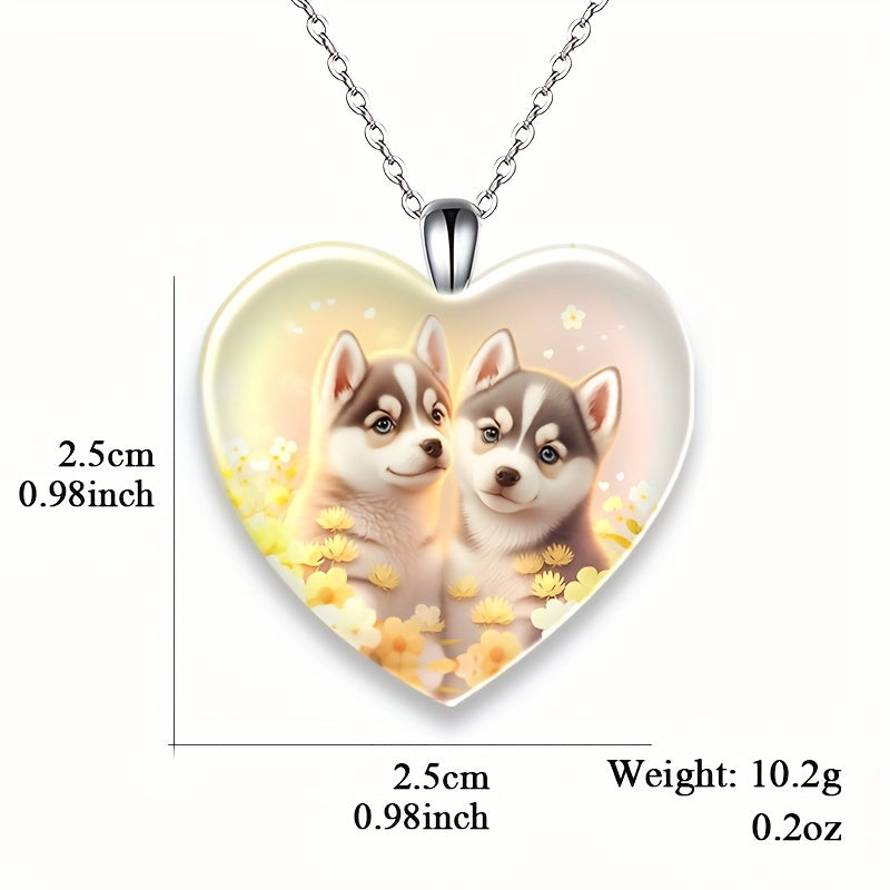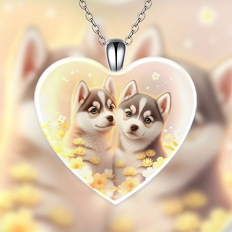 Adorable heart-shaped pendant necklace featuring a puppy pattern, perfect for dog lovers. Ideal for holiday parties or as a birthday gift for dog enthusiasts.