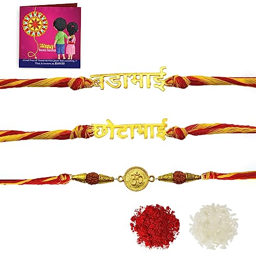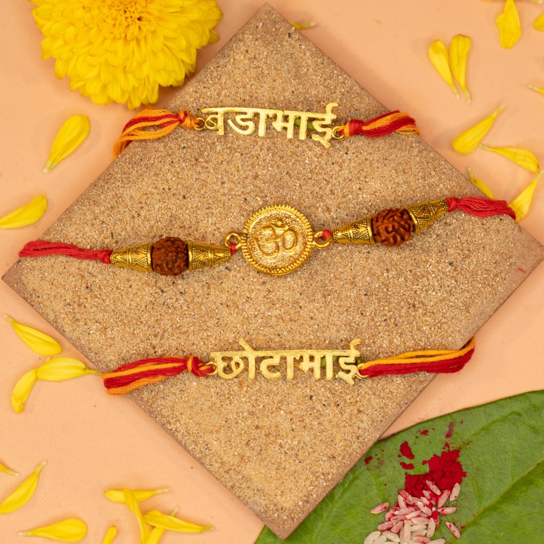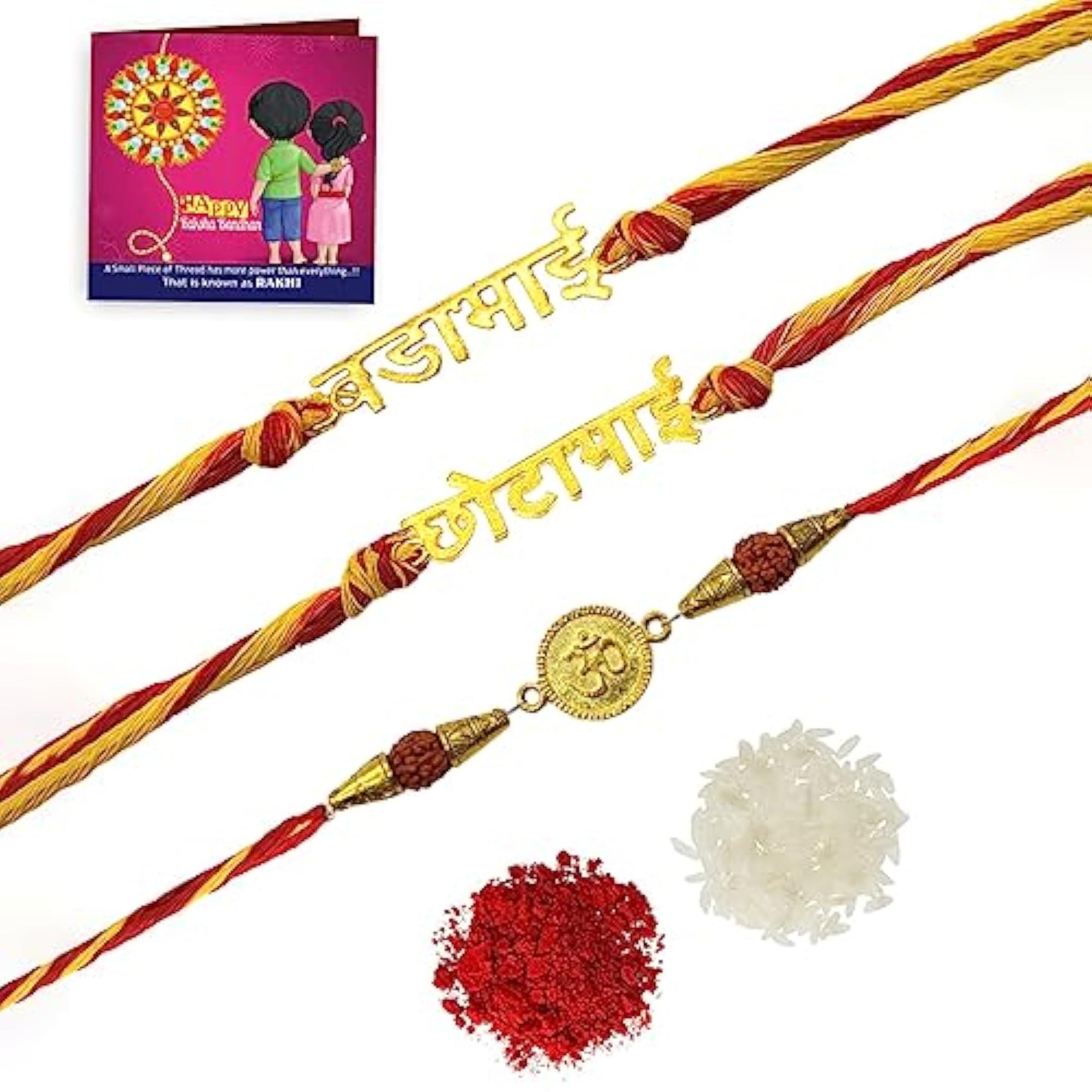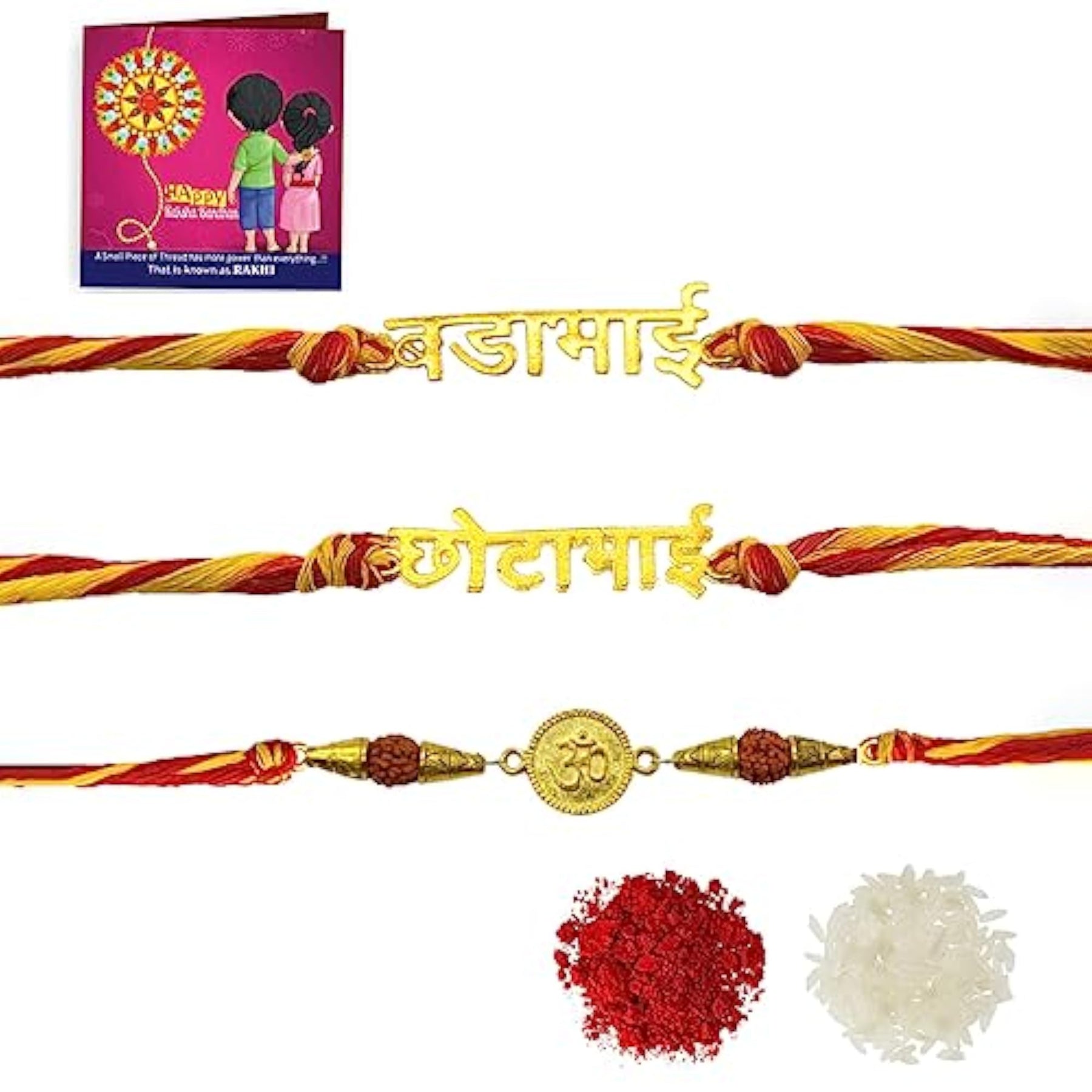 Celebrate Raksha Bandhan with this beautiful combo of 3 traditional plated rakhis for brothers and rakhi for sister. Comes with roli, chawal, and a greeting card.