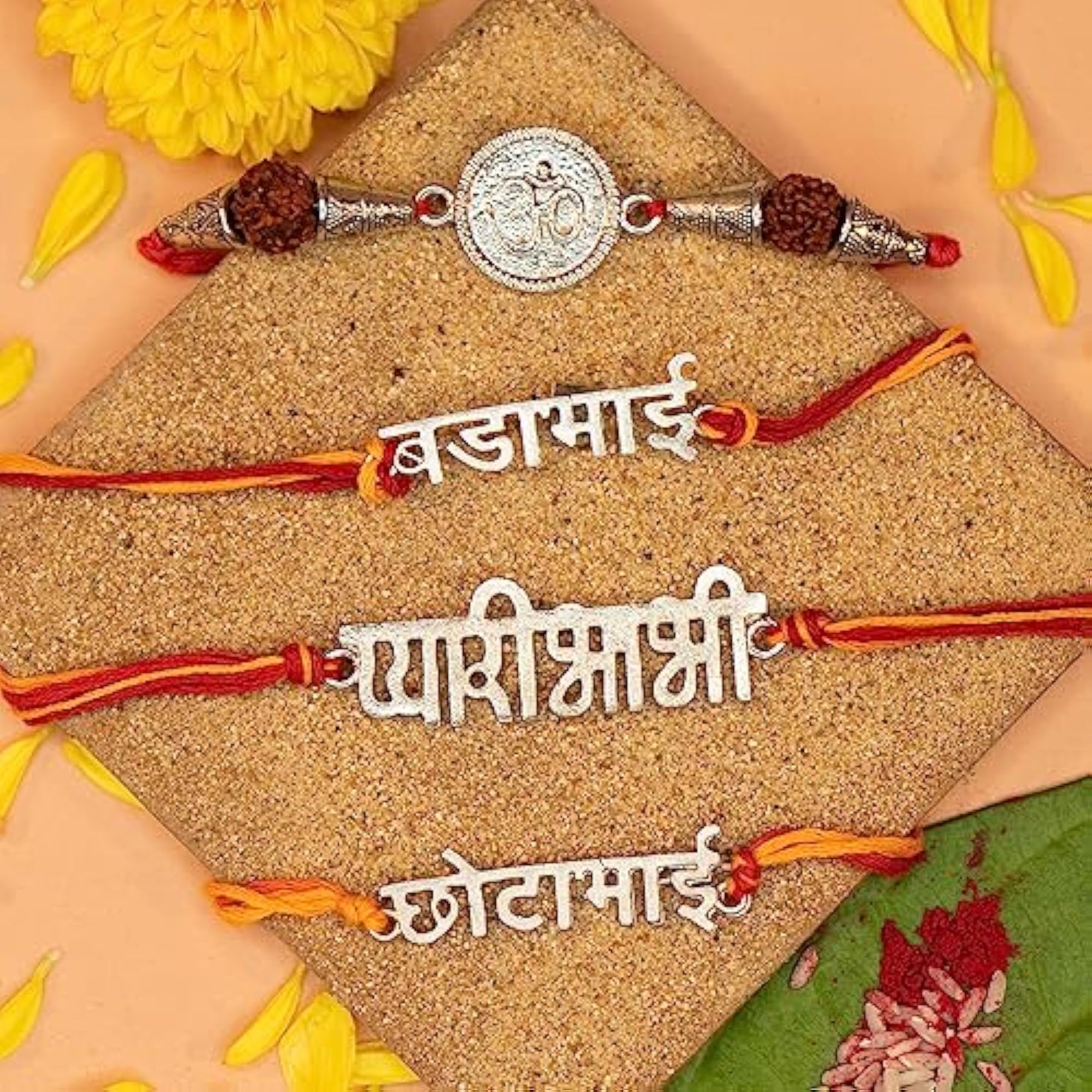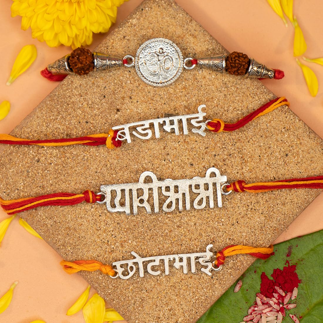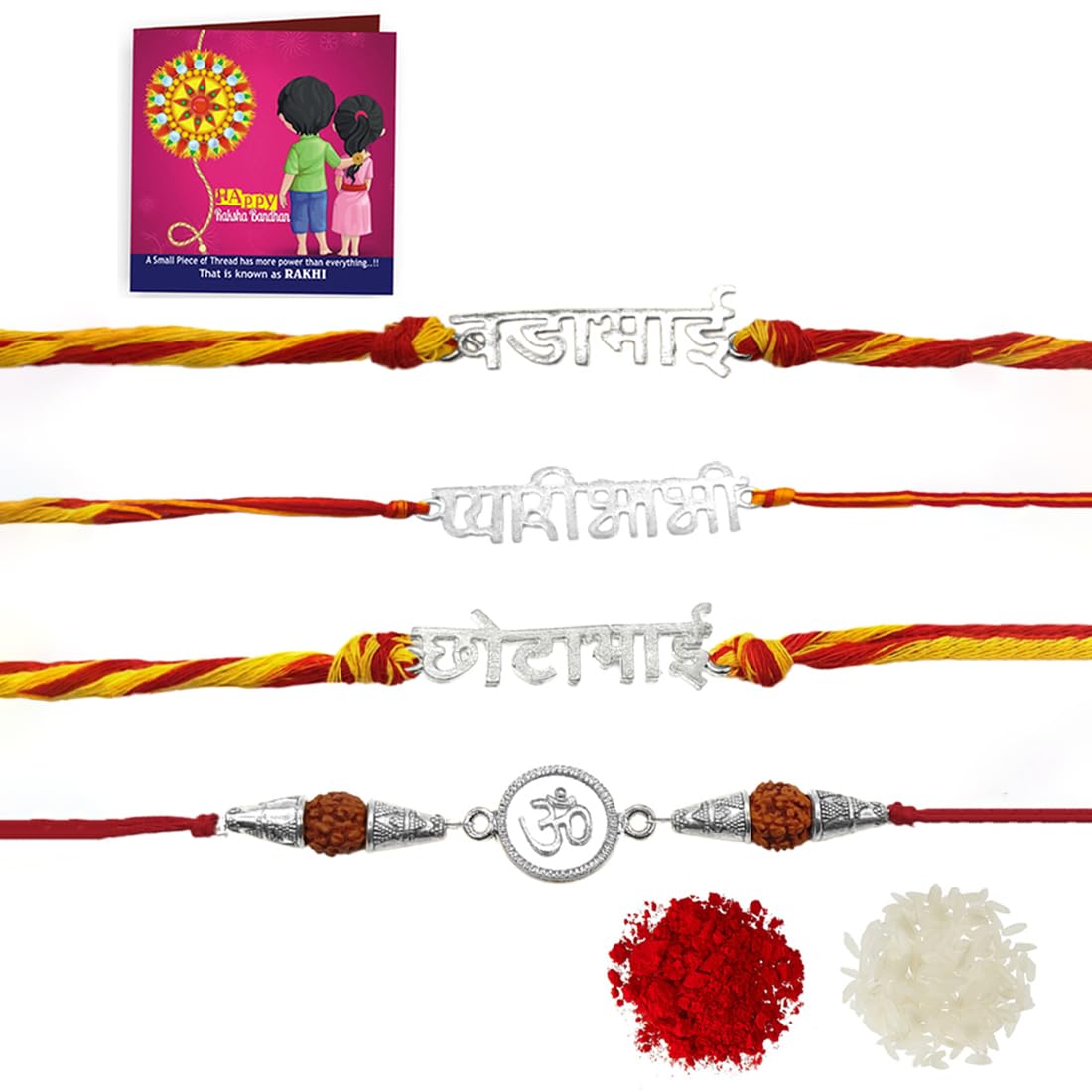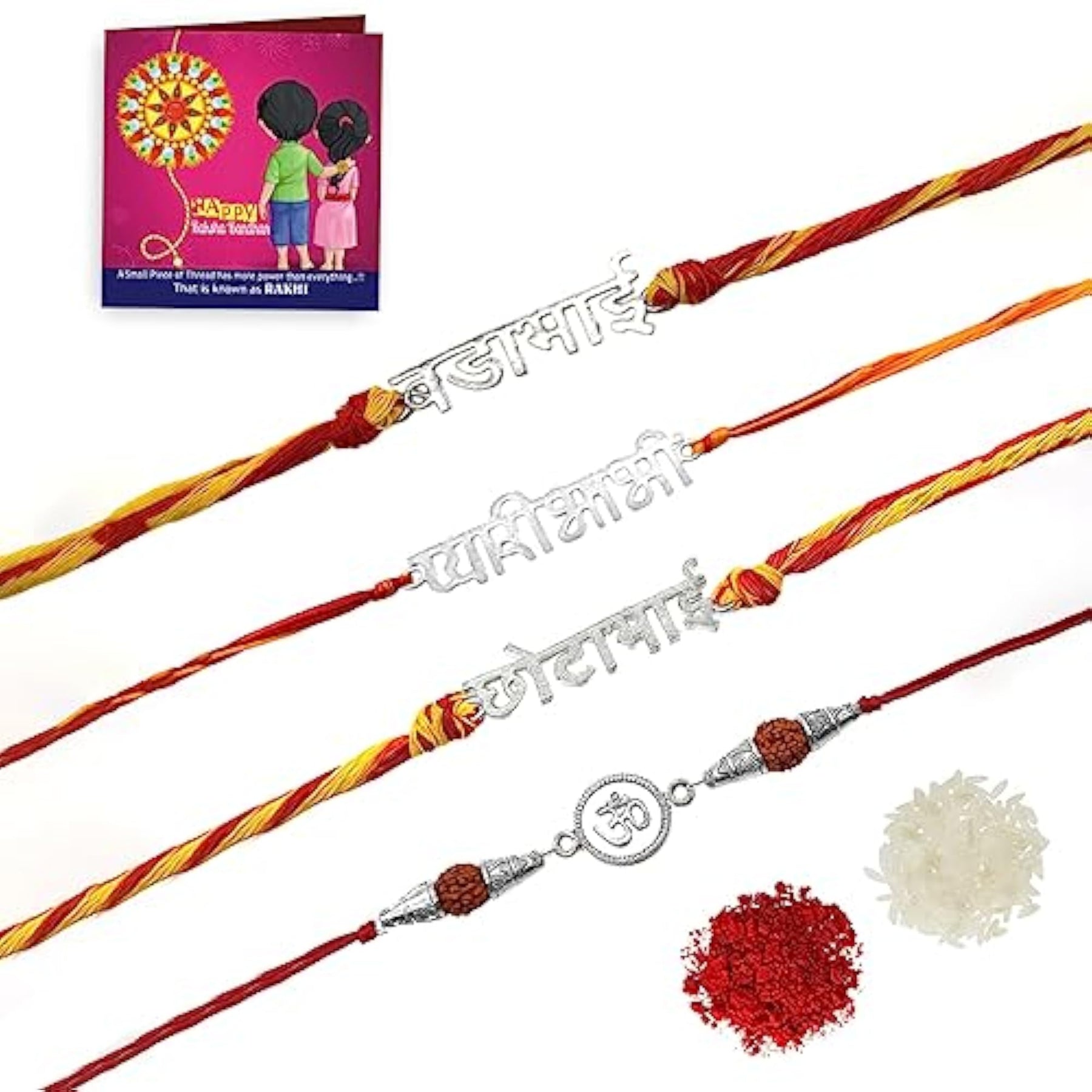 Celebrate Raksha Bandhan with this beautiful combo set of 4 traditional silver-plated rakhis for brothers and sisters. Includes Roli, Chawal and a Greeting Card.