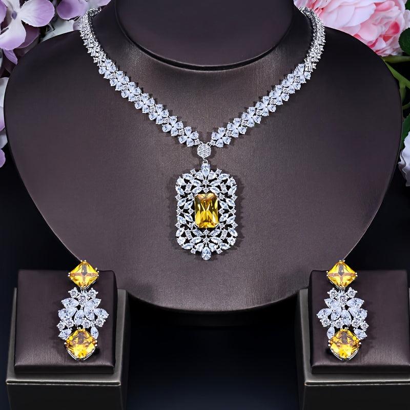 Red Big Pendant Necklace Earring Set with Zirconia - Bridal Accessories