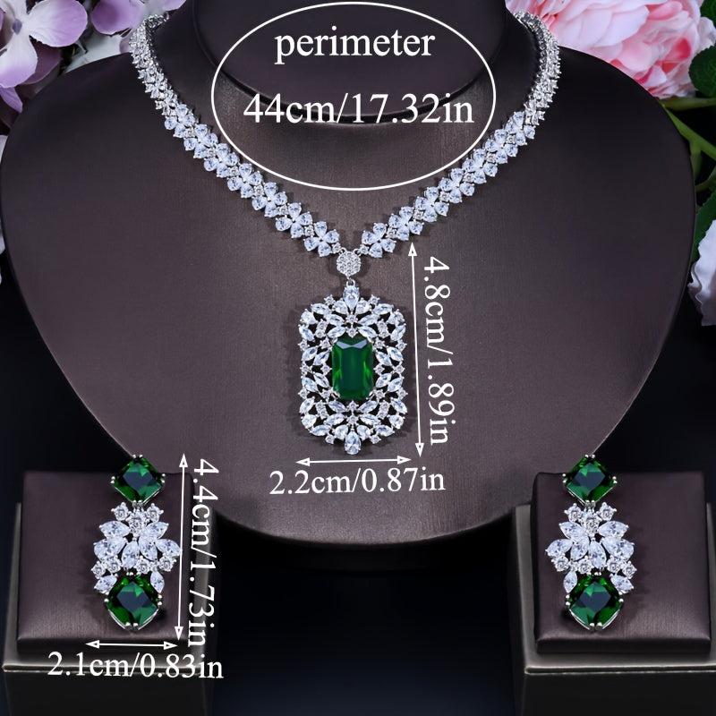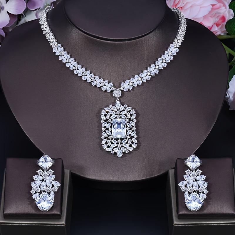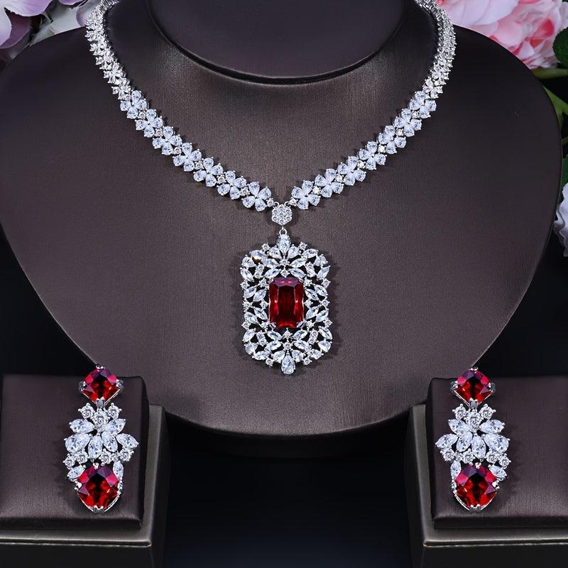 Elegant set featuring a red pendant necklace and dangle earrings with synthetic zirconia in a silvery setting. Perfect for weddings, dinners, and formal occasions.
