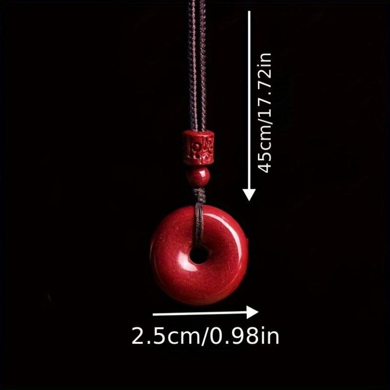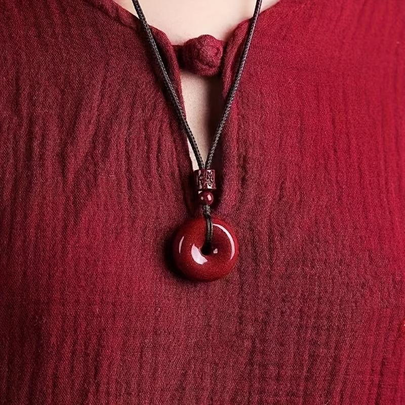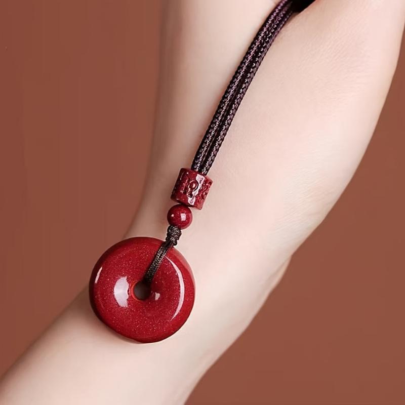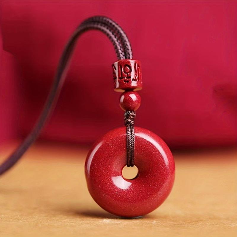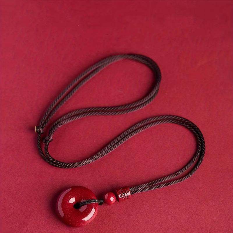 This Bohemian Red Cinnabar pendant necklace features a braided cord and a Chinese prosperity charm, making it a versatile talisman for good luck. Suitable for both men and women.