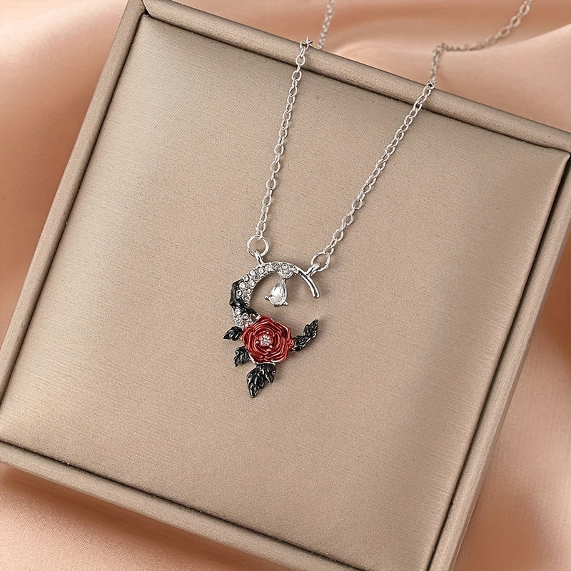 Add a touch of style with this unique crescent pendant featuring a red flower design and small rhinestones. Perfect for men who appreciate intricate details in their accessories.