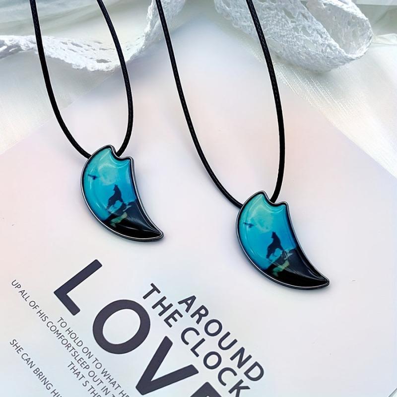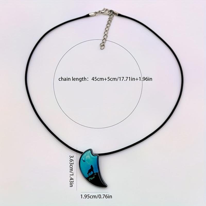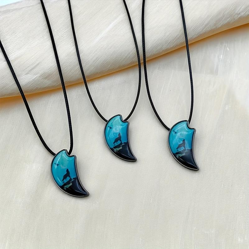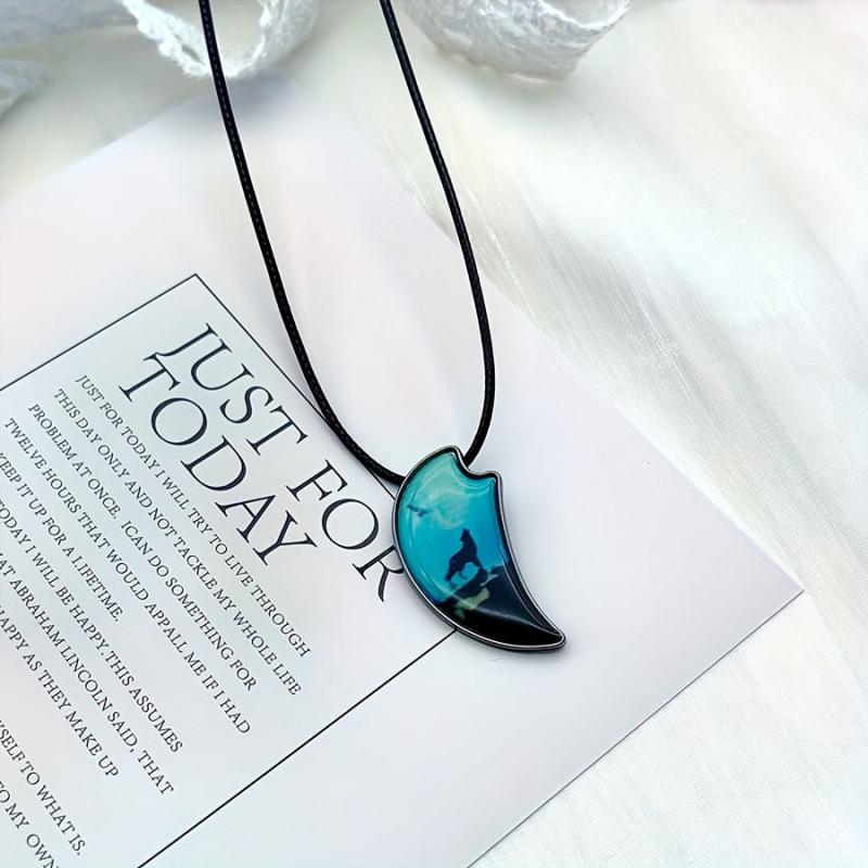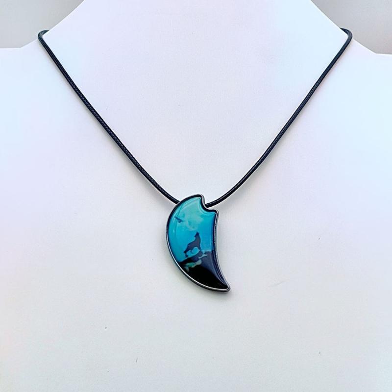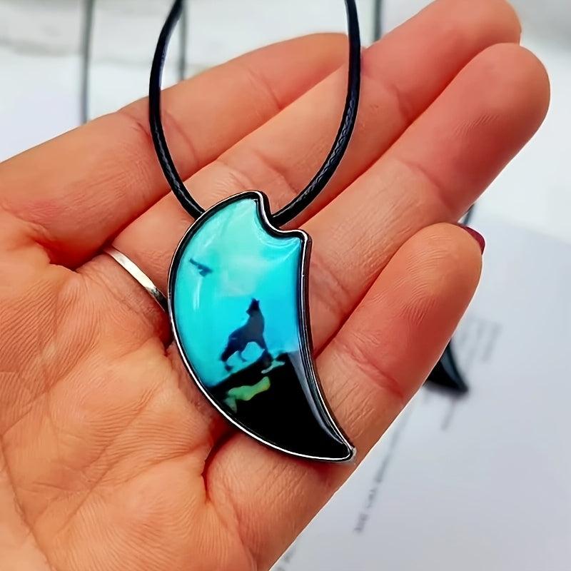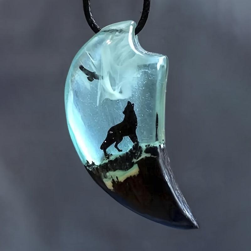 This resin pendant necklace features a transparent wolf head with leather teardrop on a braided leather cord. Modern men's jewelry for everyday wear.