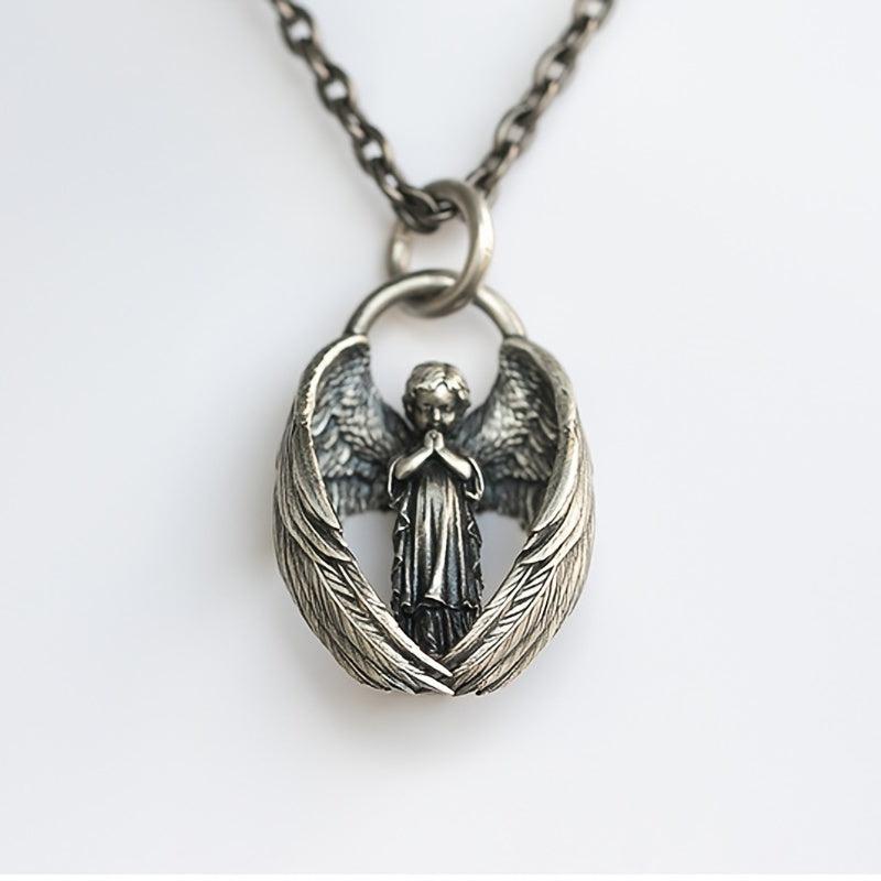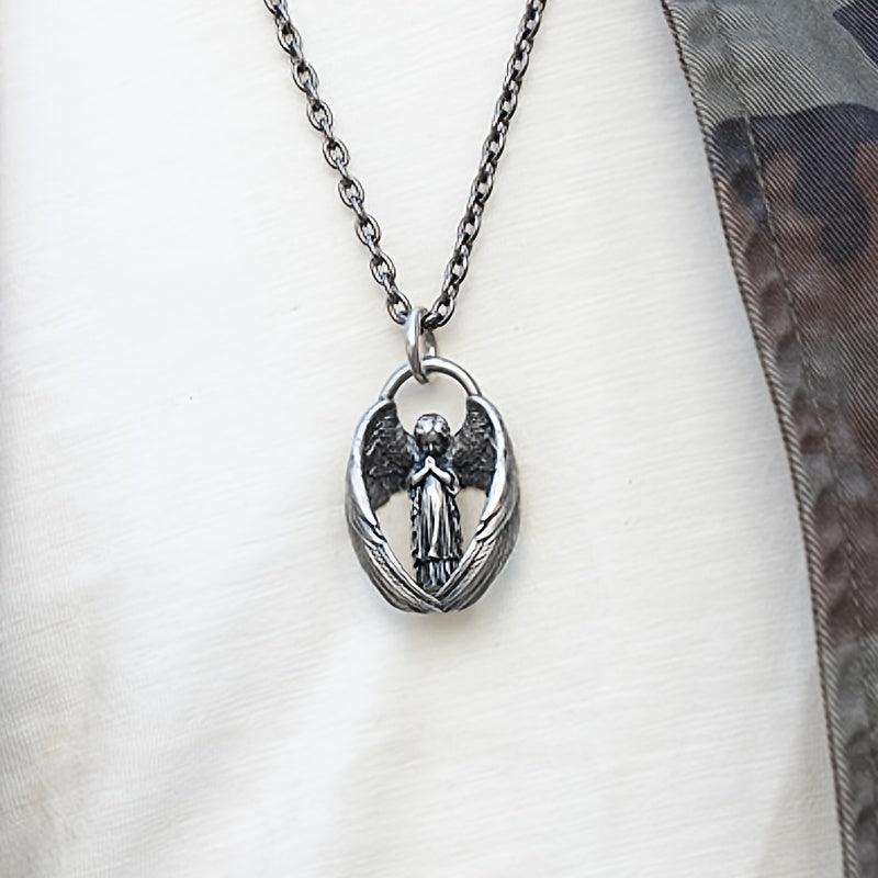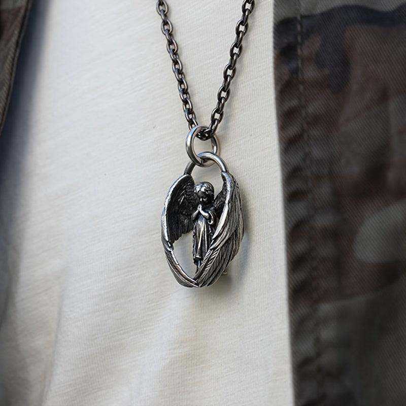 This pendant necklace features retro angel wings design, suitable for both men and women. It carries a blessing of protection and style.