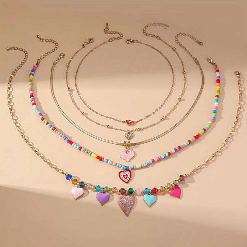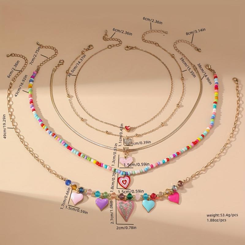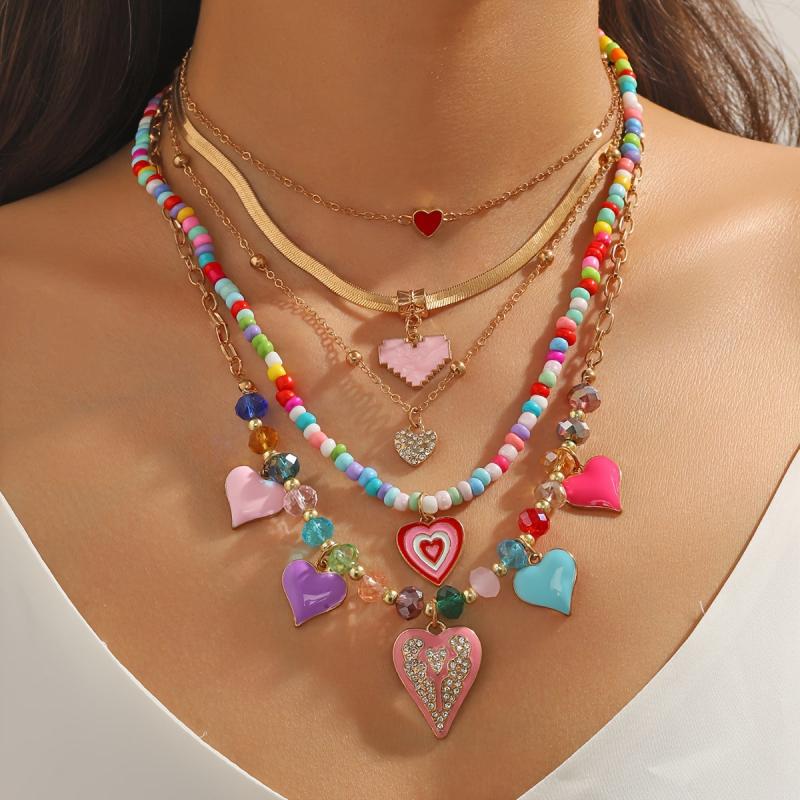 Add a touch of nostalgia with this set of 5pcs retro niche end Y2K sweet colorful heart shaped pendant necklace. Featuring layered beaded rice beads for a chic stacked look, perfect for Women's style.