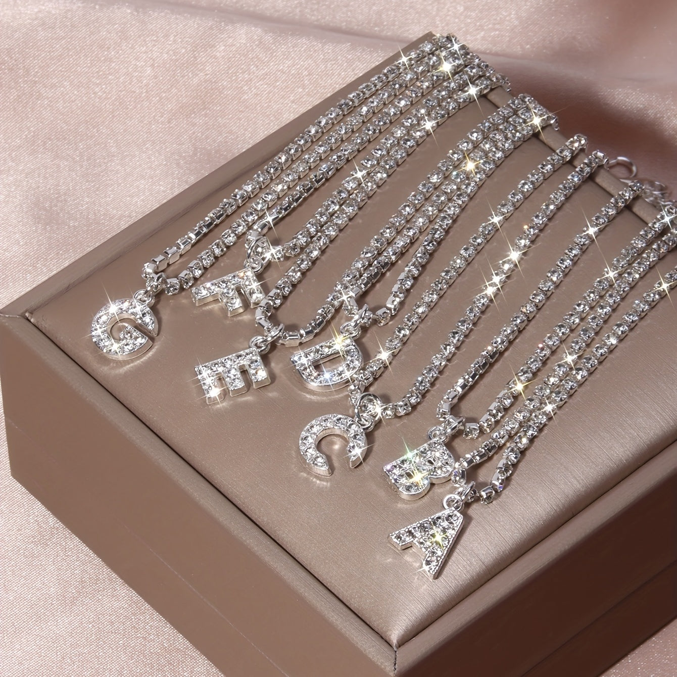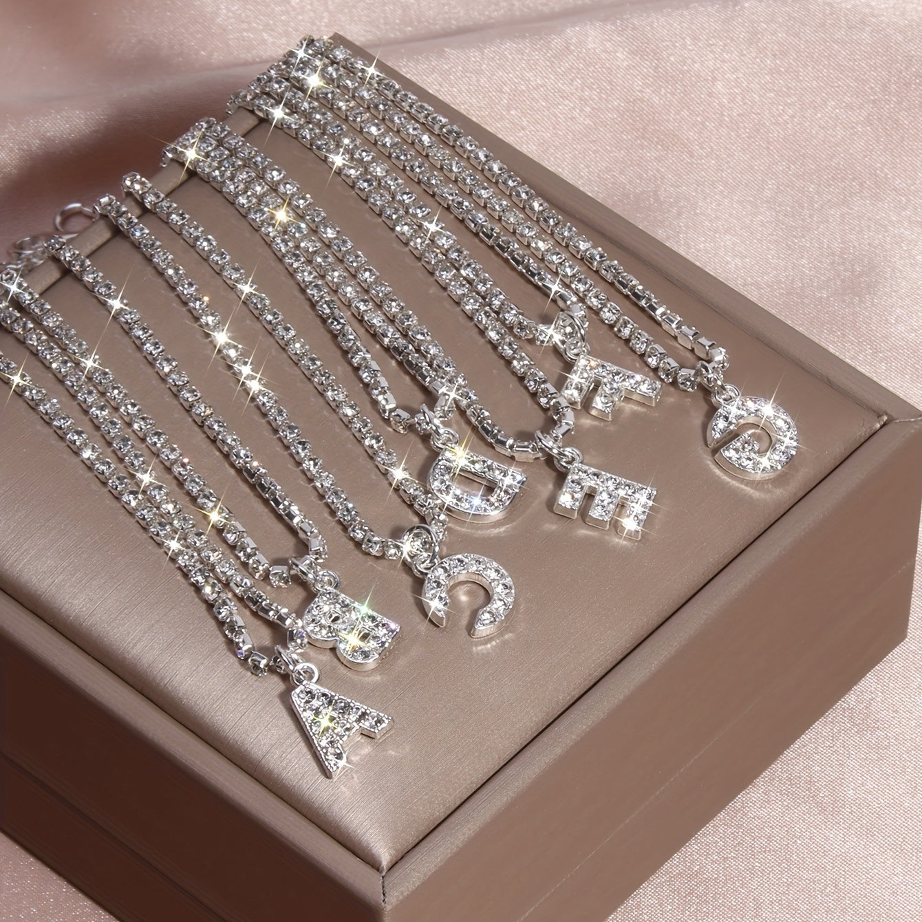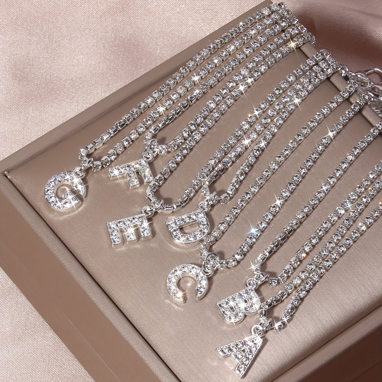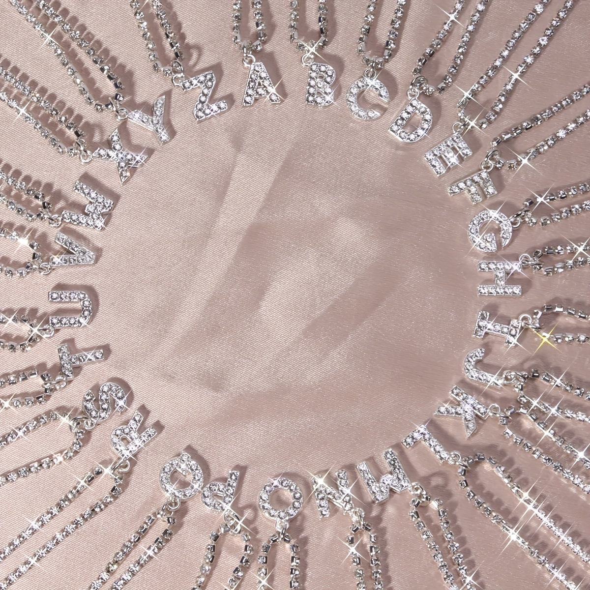 Sparkling rhinestone initial letters necklace on a silver plated chain, perfect for birthdays or special occasions.