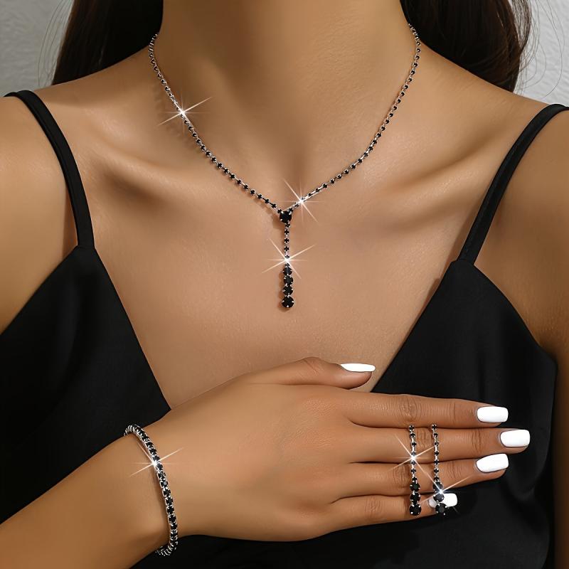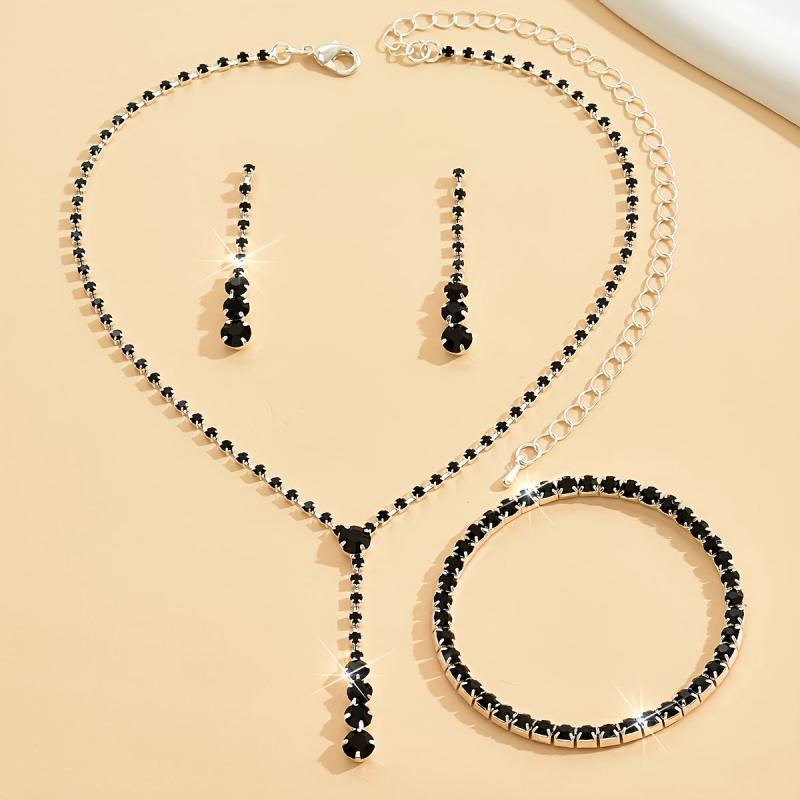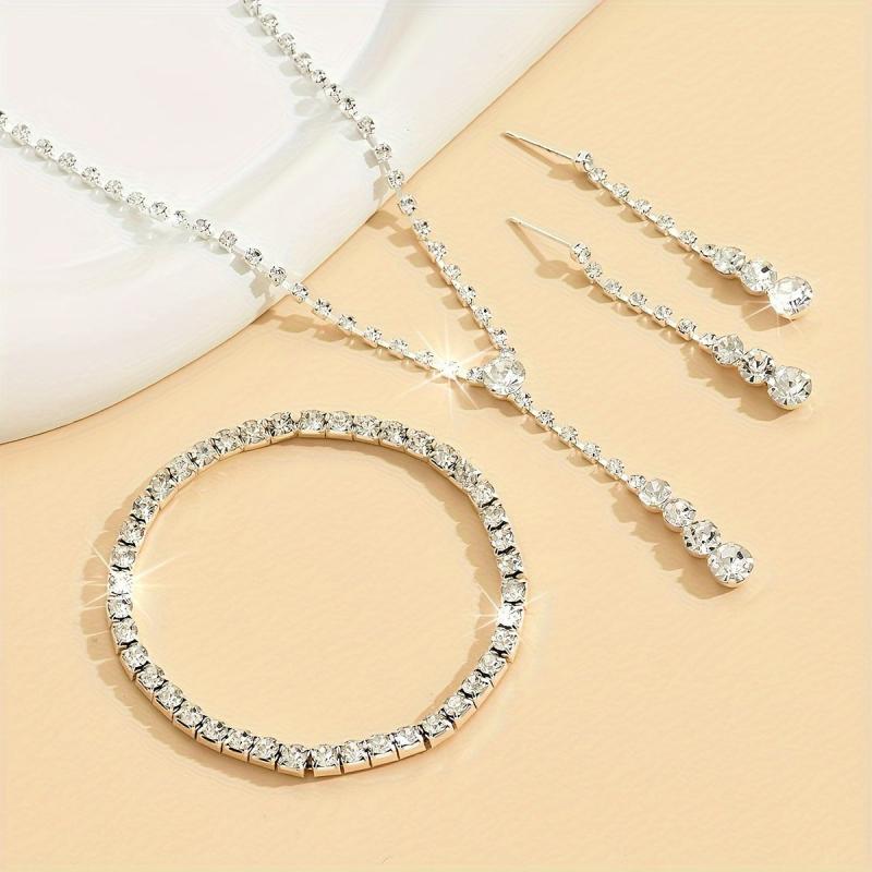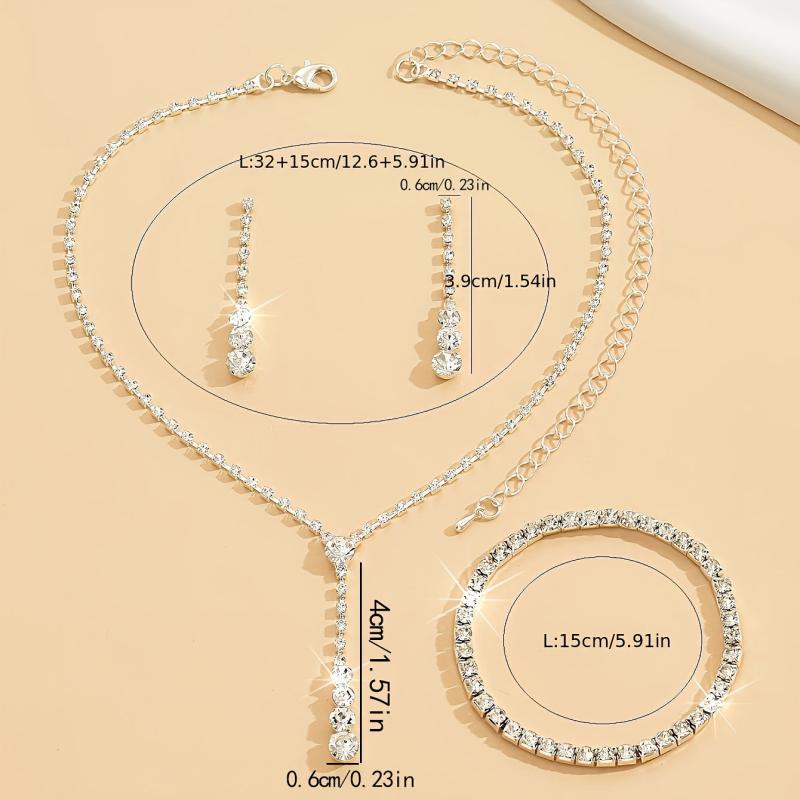 Complete your wedding ensemble with this elegant jewelry set featuring a pair of earrings, a necklace, and a bracelet. Each piece is inlaid with shining rhinestones for added sparkle.