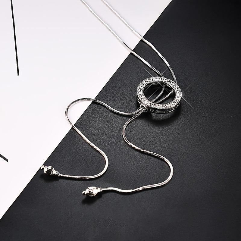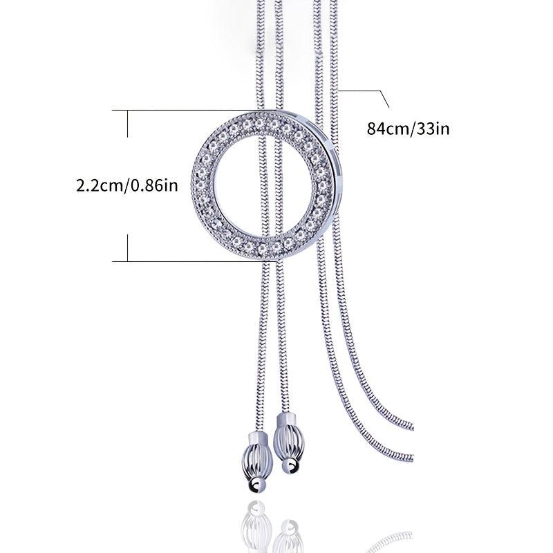 This long necklace features a fresh rhinestone round pendant that adds elegance to your outfit. It is a stylish clothing accessory that complements various looks.