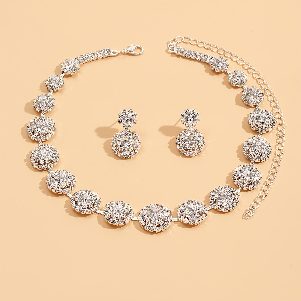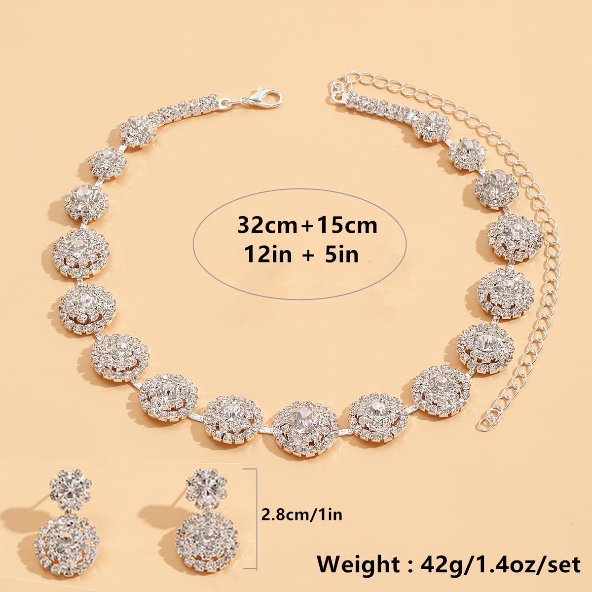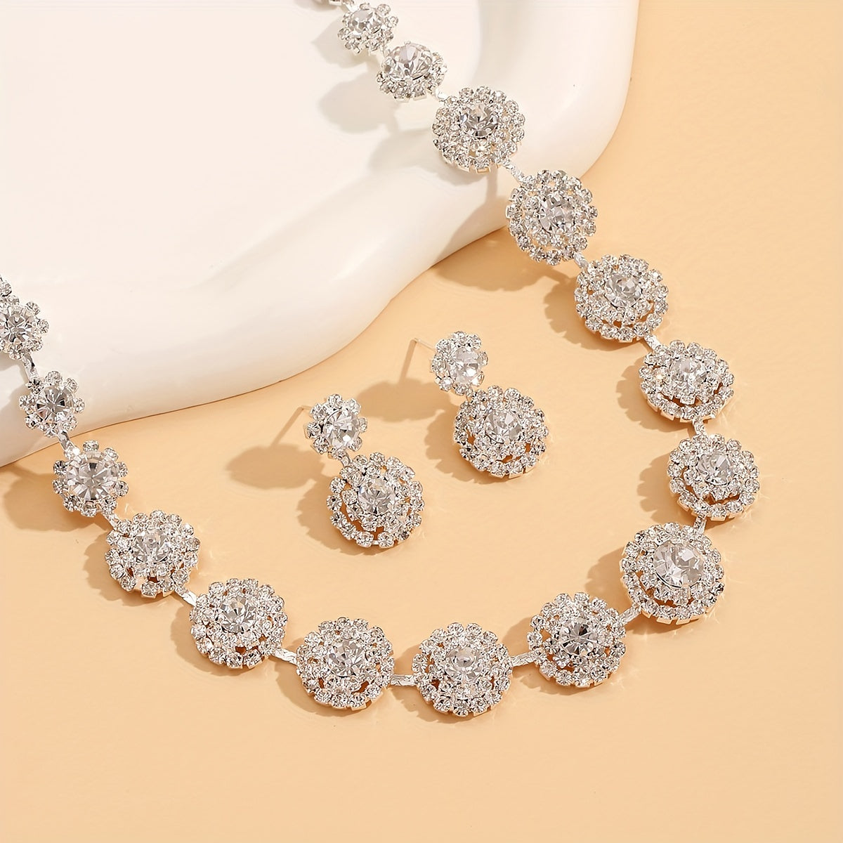 Complete your bridal look with this elegant jewelry set featuring silver plated earrings and necklace with inlaid rhinestones. Perfect for engagement, wedding, evening party, and cocktail party.