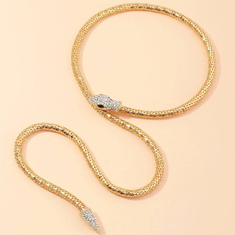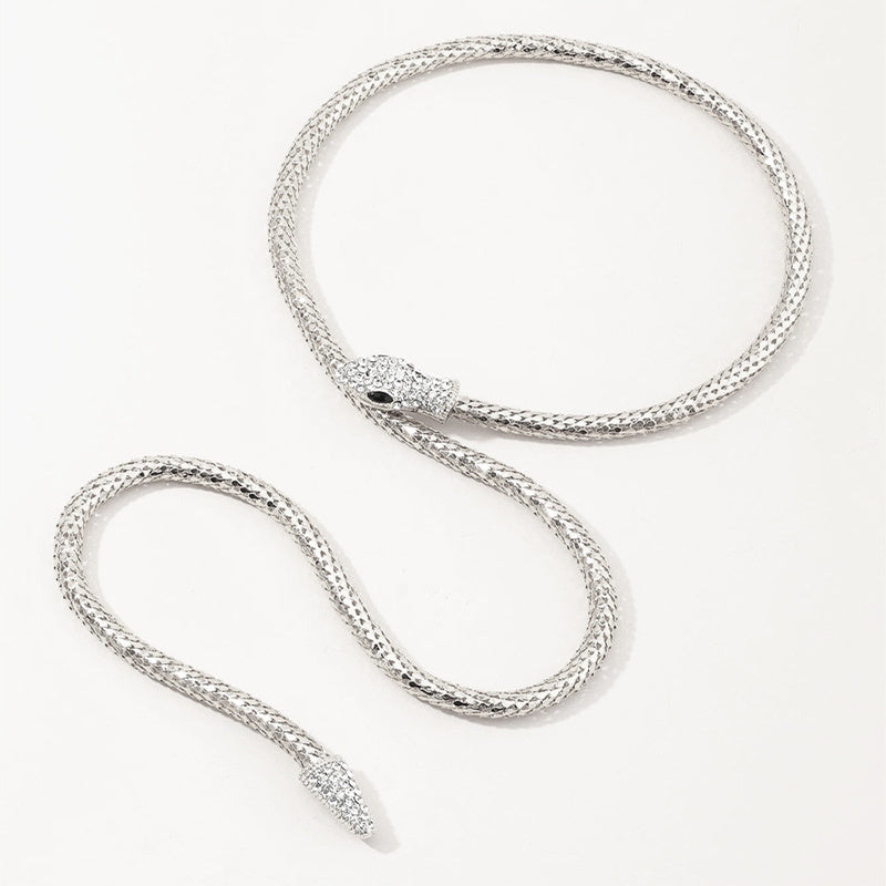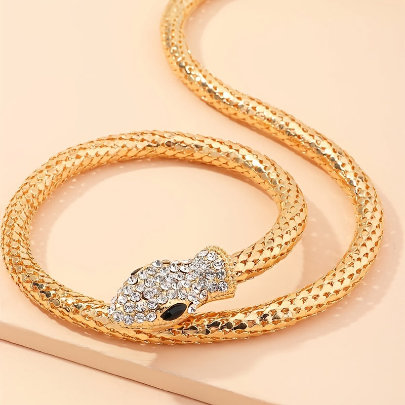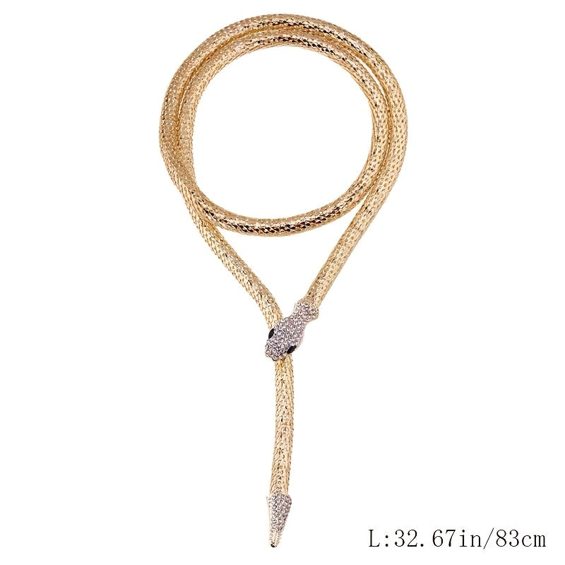 Elegant and sparkly long snake necklace with rhinestones for a glamorous look.