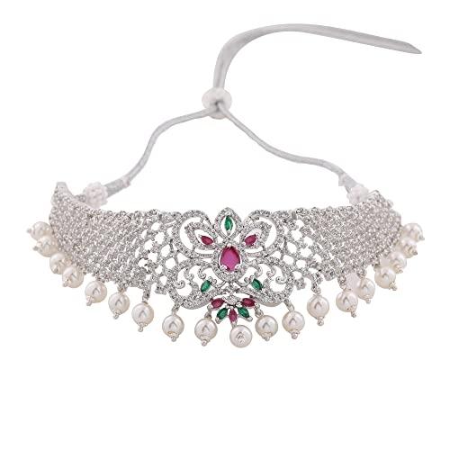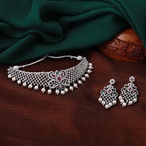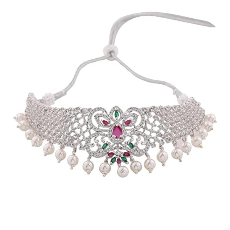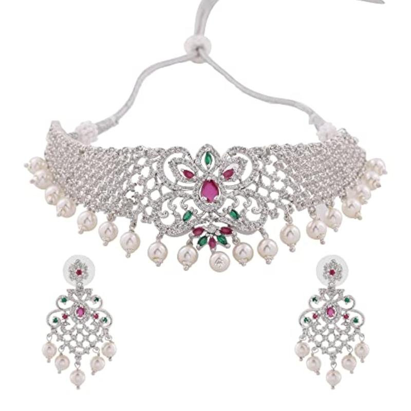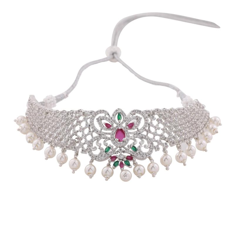 Elegant choker necklace set with CZ stones and pearls, perfect for bridal wear.