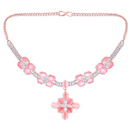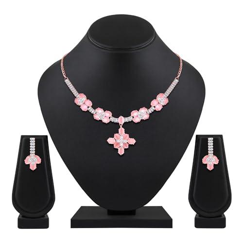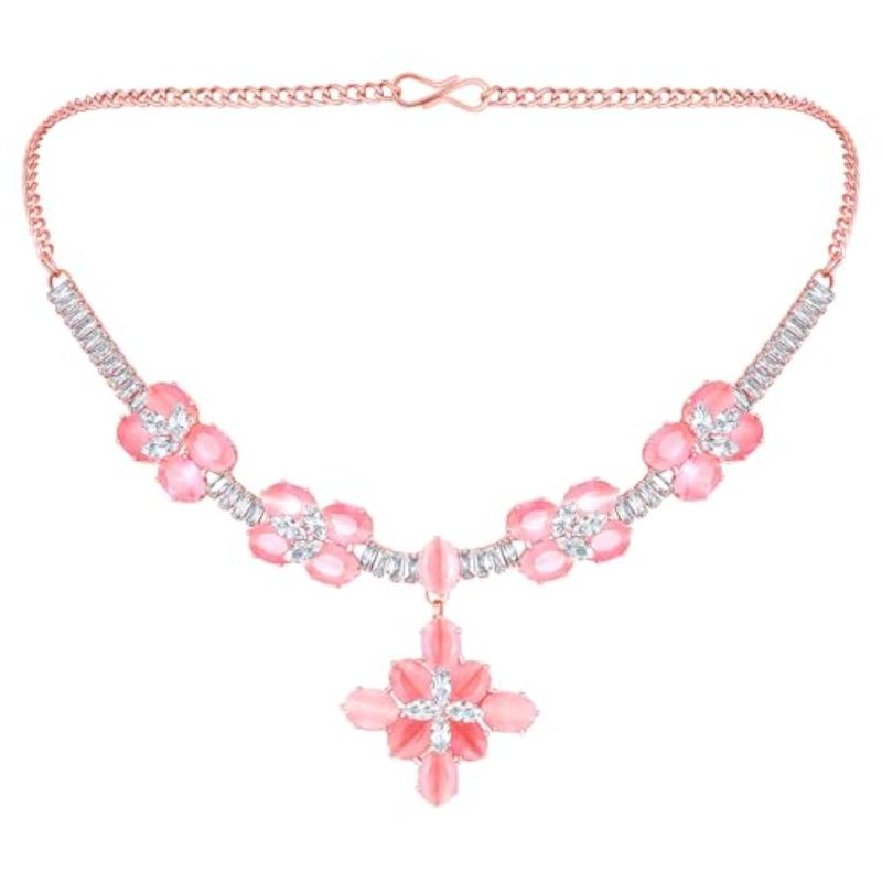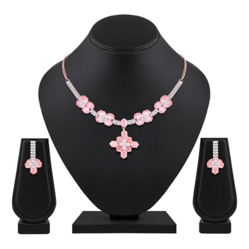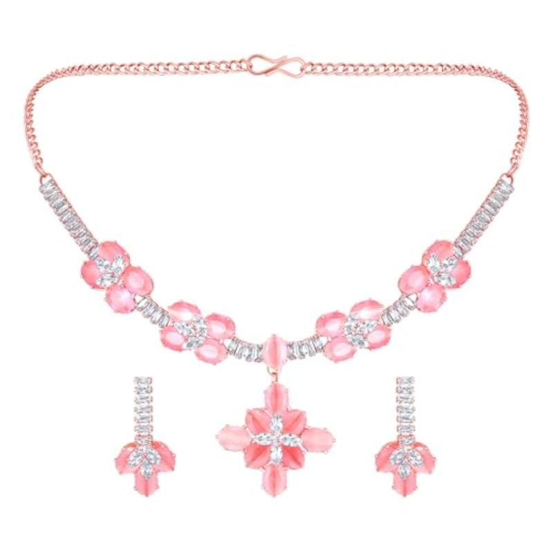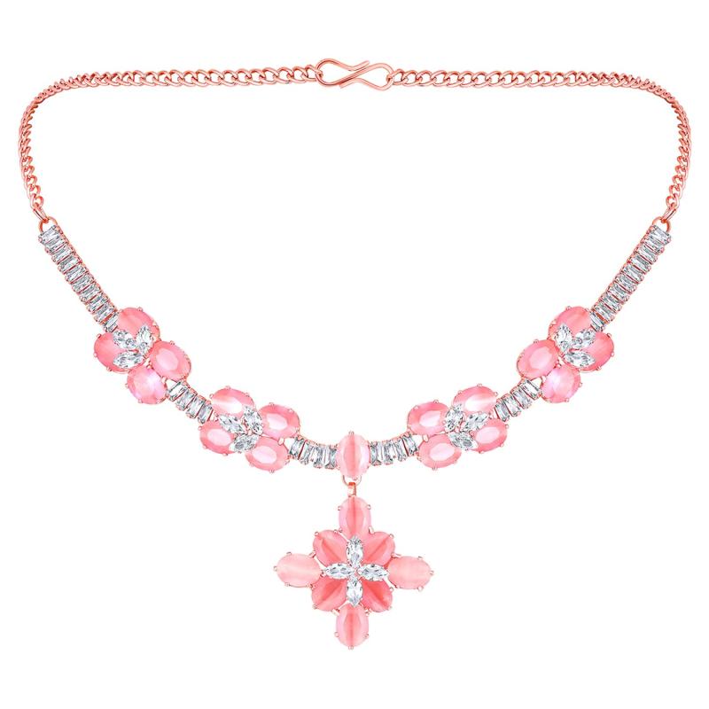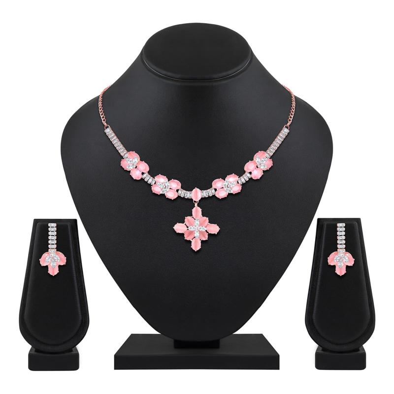 Elevate your look with this stunning rose gold plated necklace set featuring pink CZ stones in a floral design.