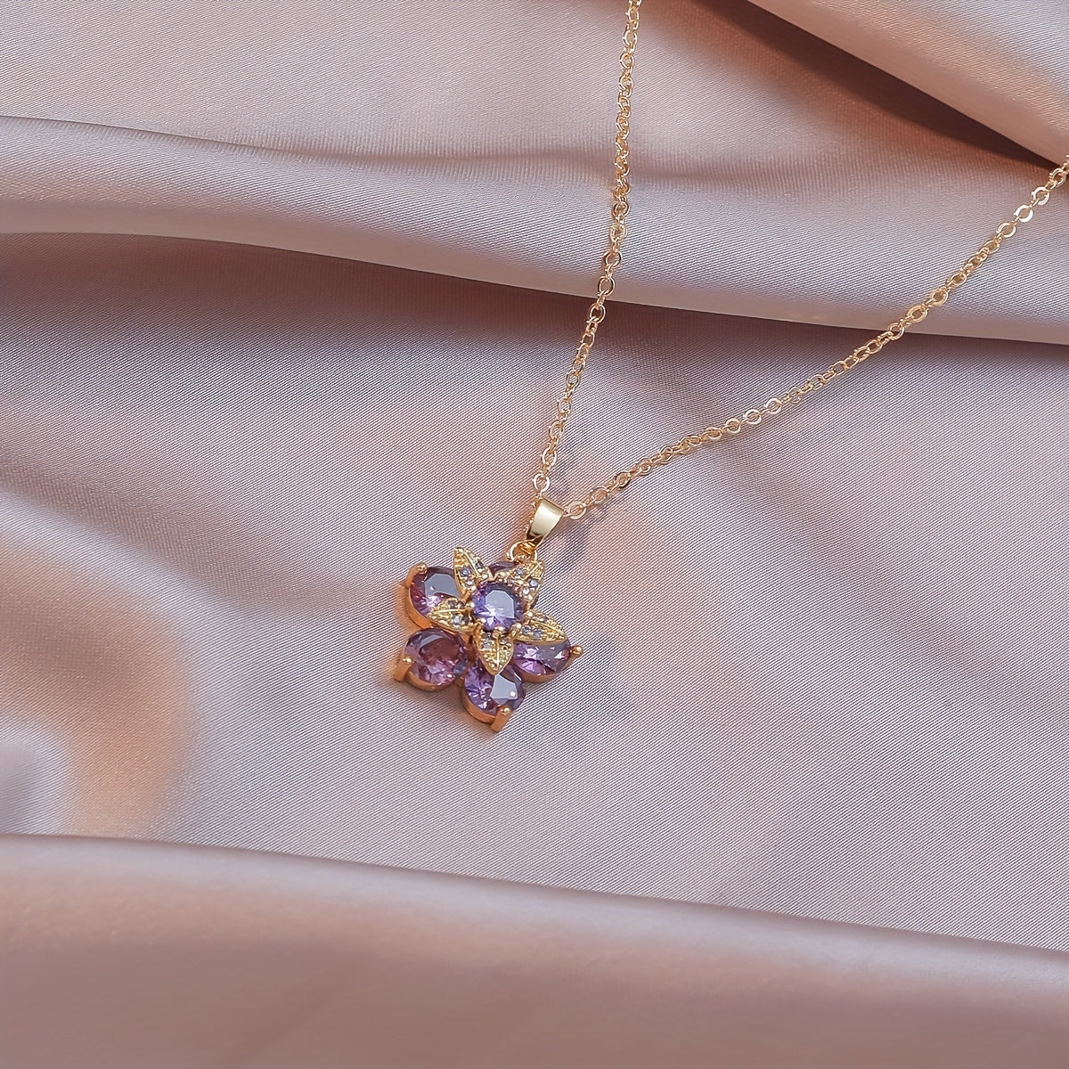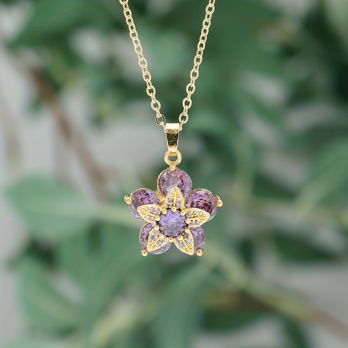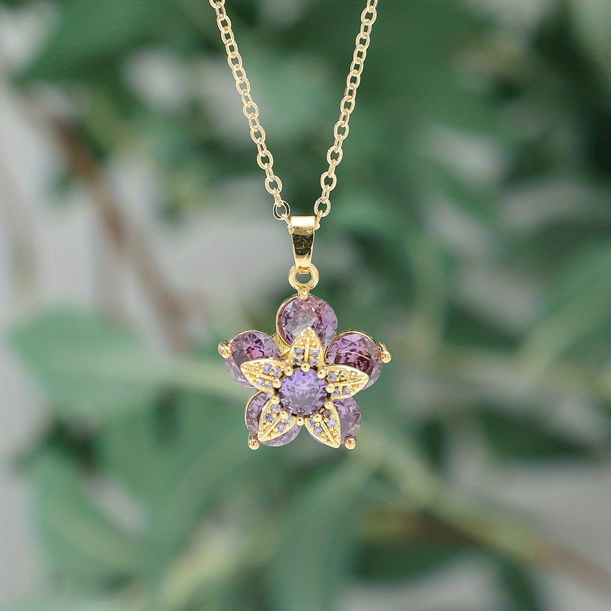 This stunning necklace features a rotating flower design with a purple zircon pendant. Made with 18K gold plating, it is a beautiful accessory for any outfit.