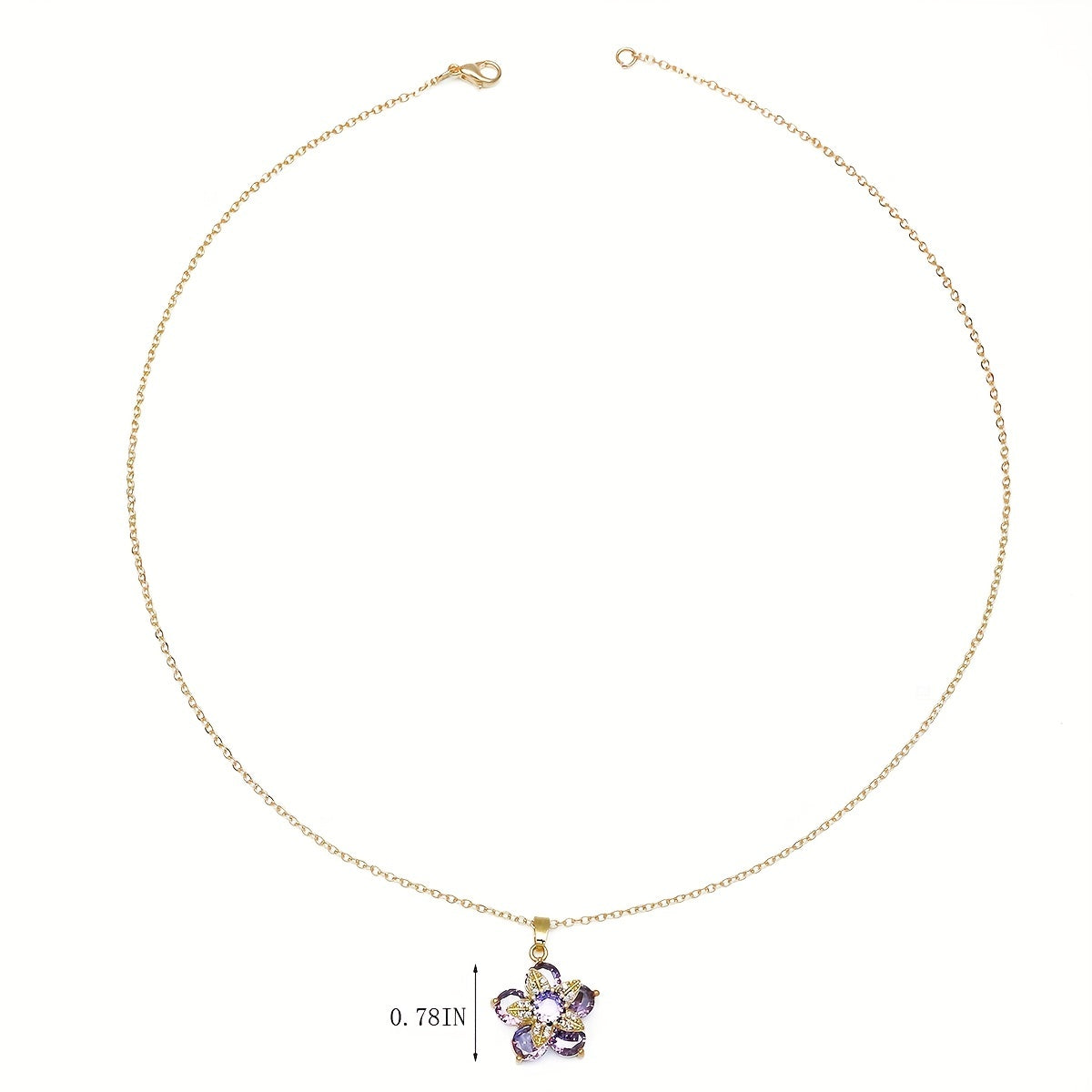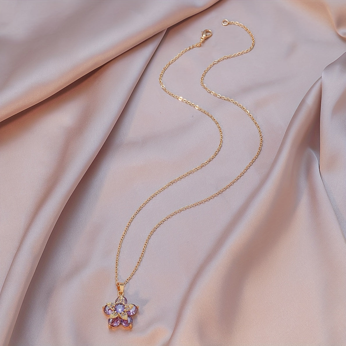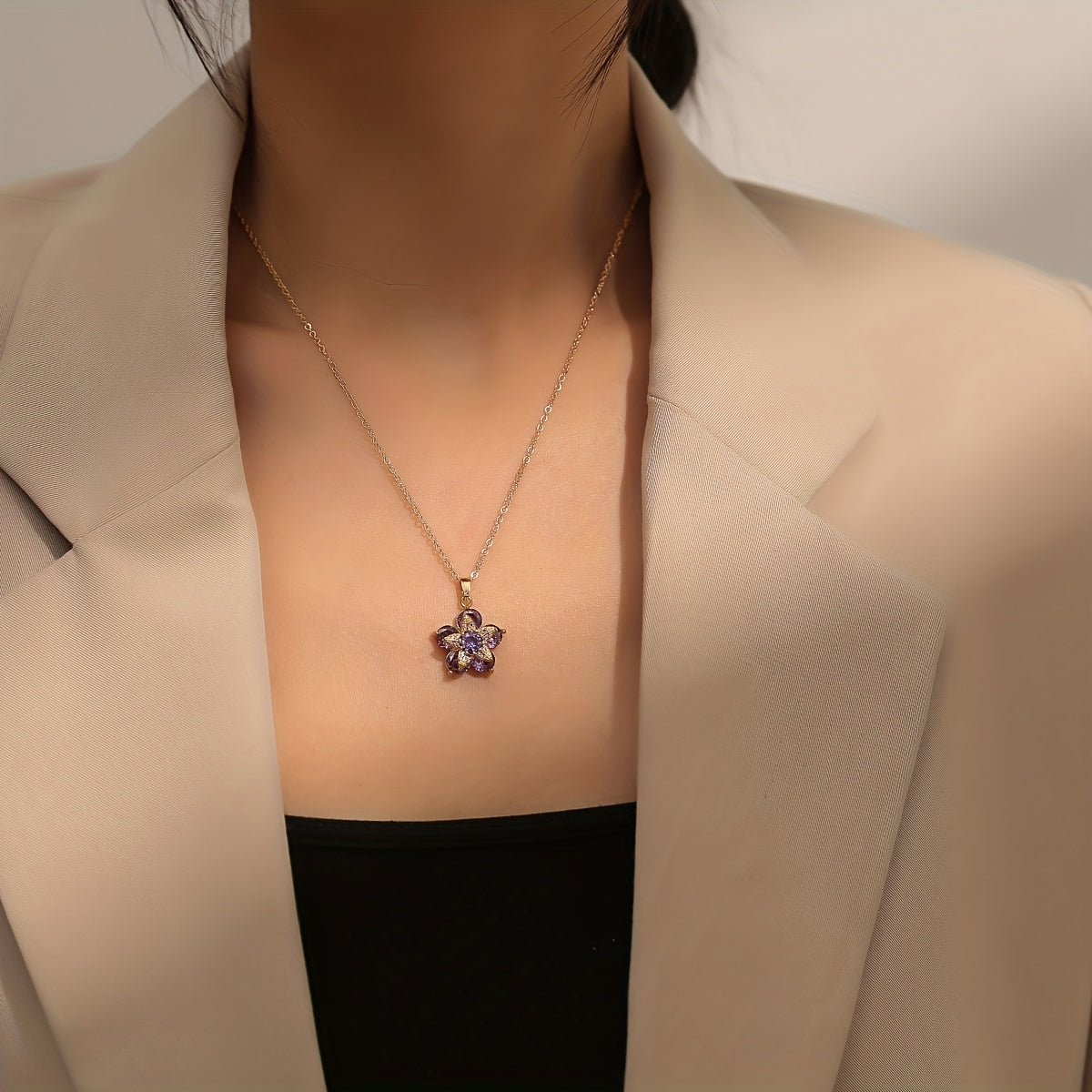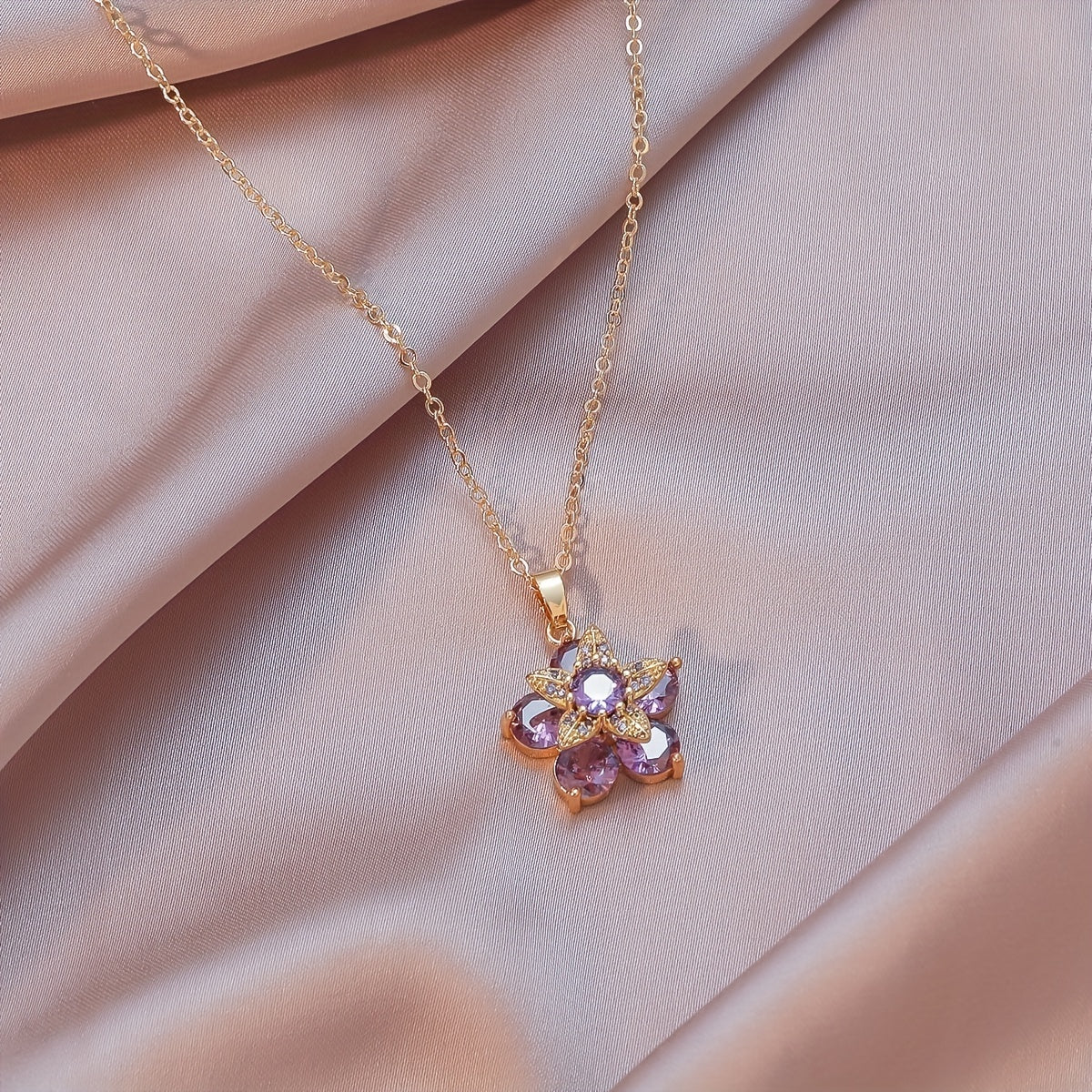 This stunning necklace features a rotating flower design with a purple zircon pendant. Made with 18K gold plating, it is a beautiful accessory for any outfit.