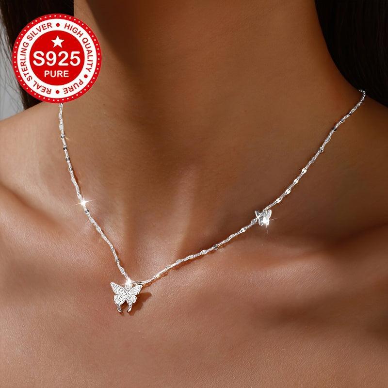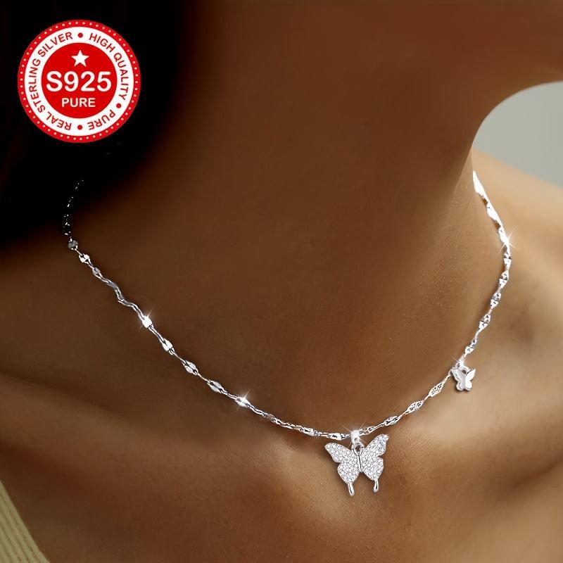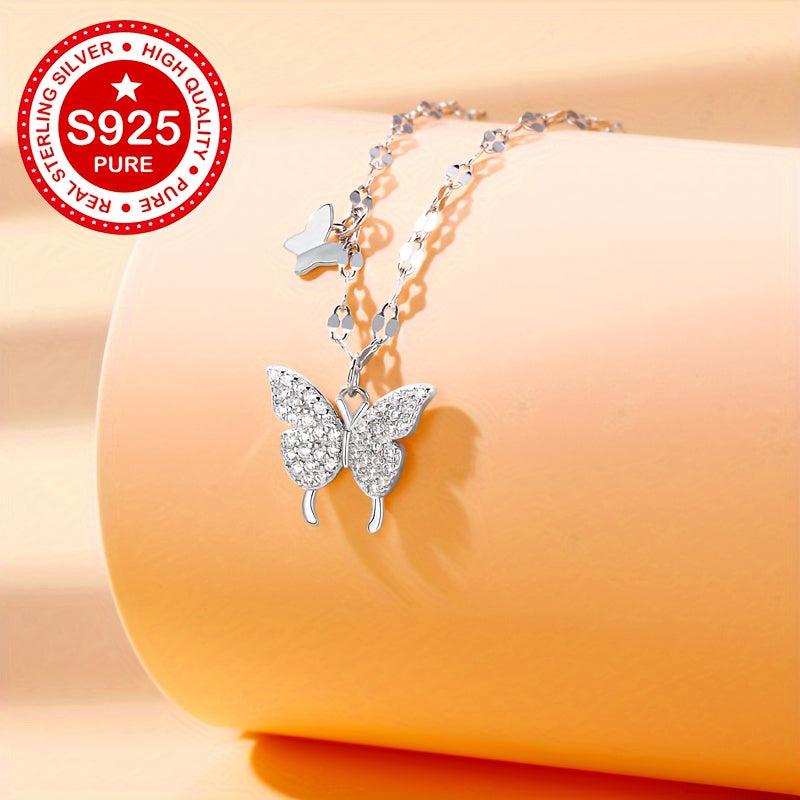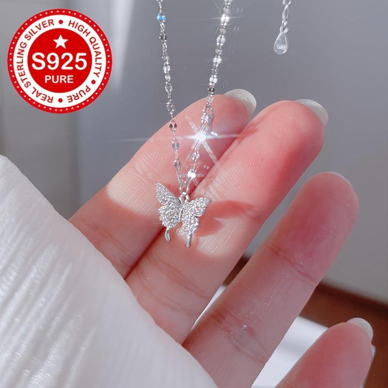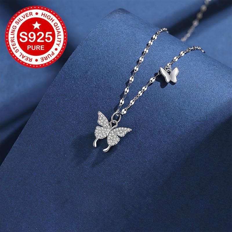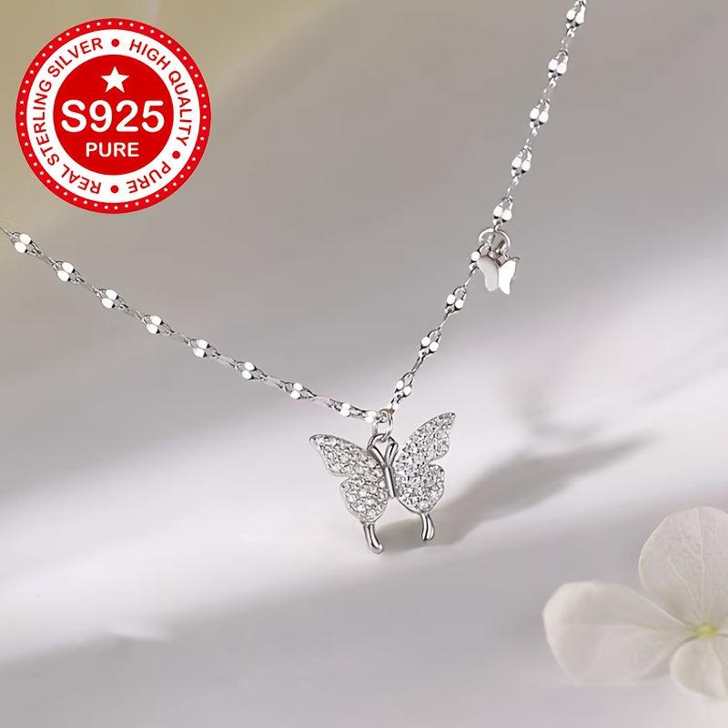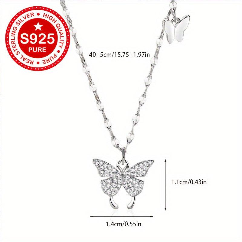 Stunning S925 silver necklace featuring a butterfly pendant with dazzling cubic zirconia. This lightweight and hypoallergenic necklace weighs only 1.98g, making it perfect for daily wear or special occasions. An ideal gift for women.