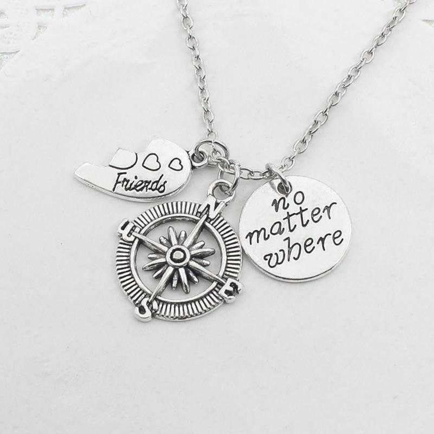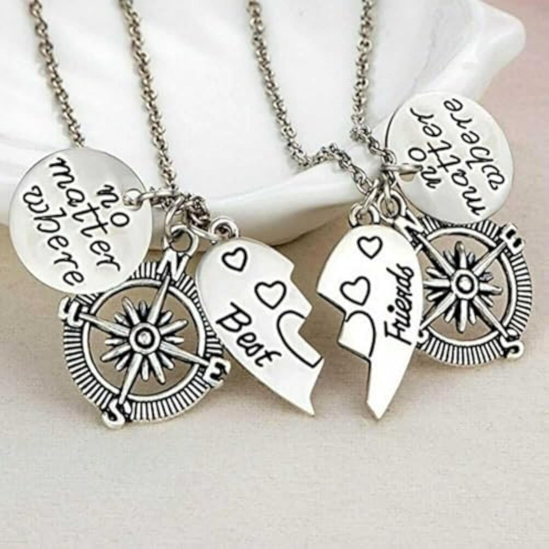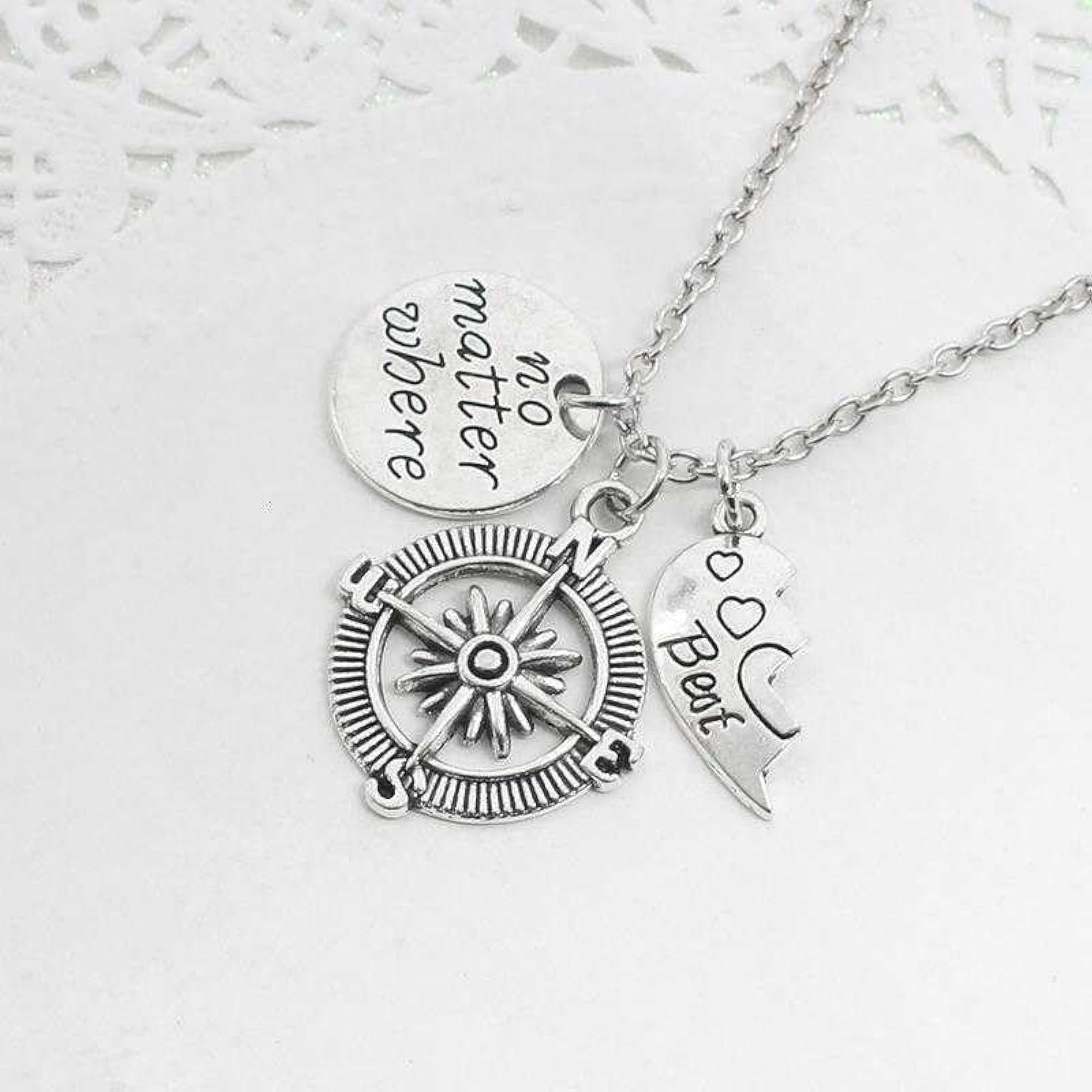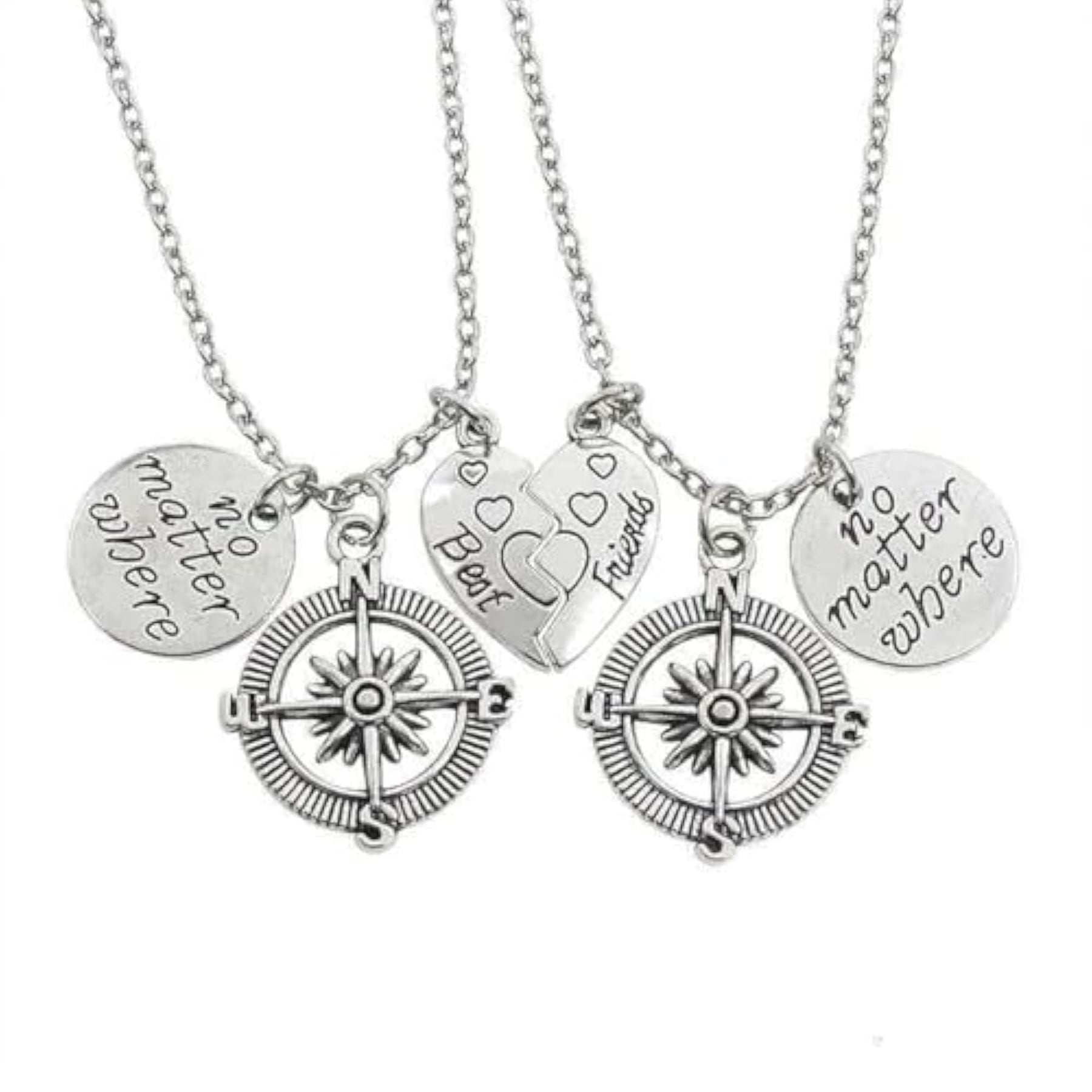 This matching necklace set is perfect for friends to share, featuring a split heart design with a compass pendant.