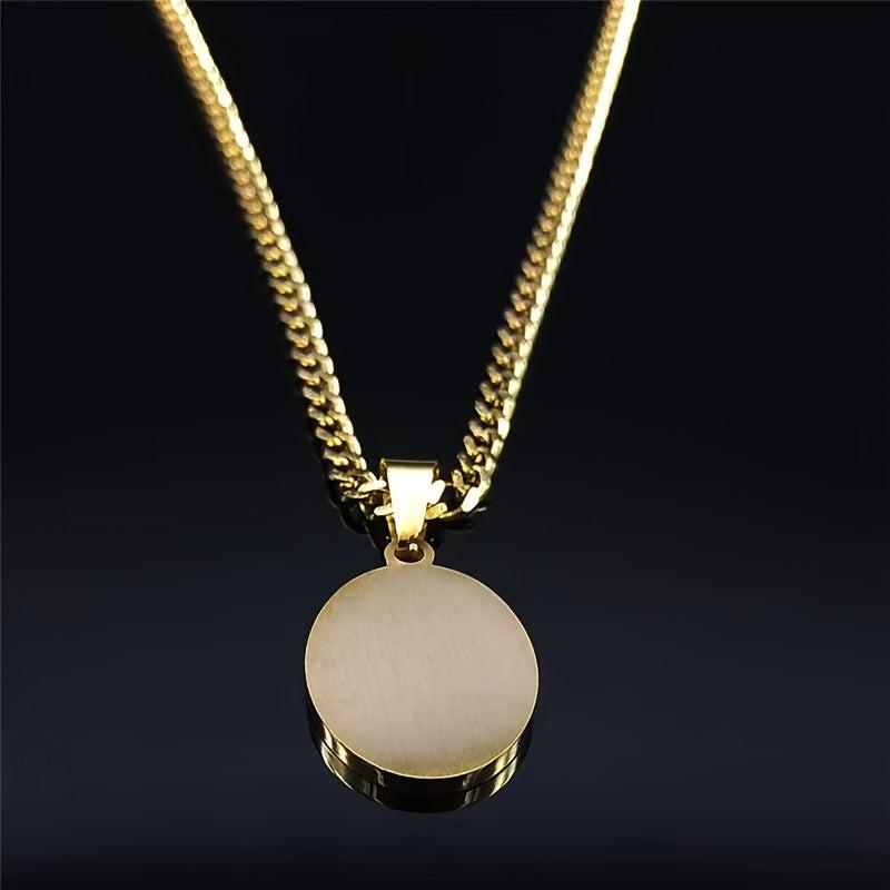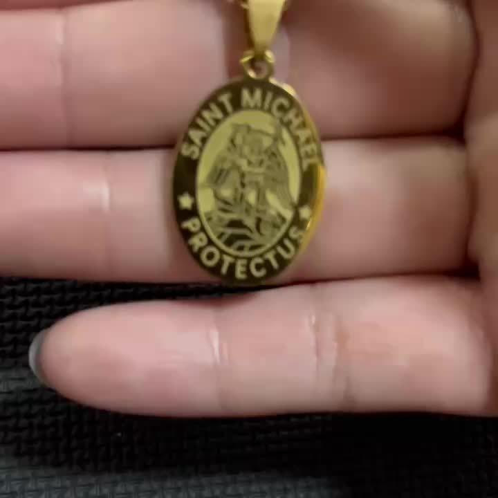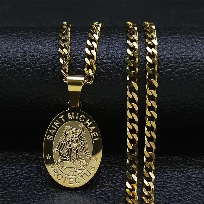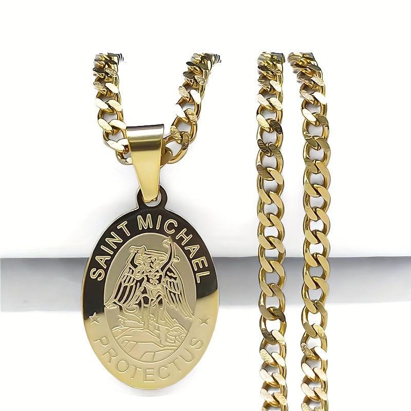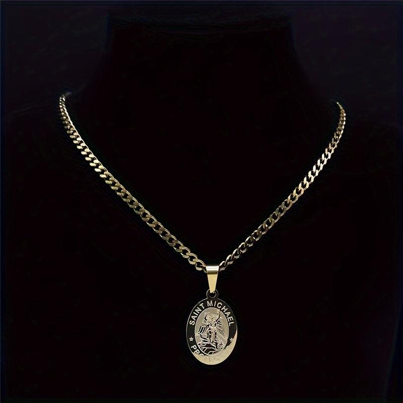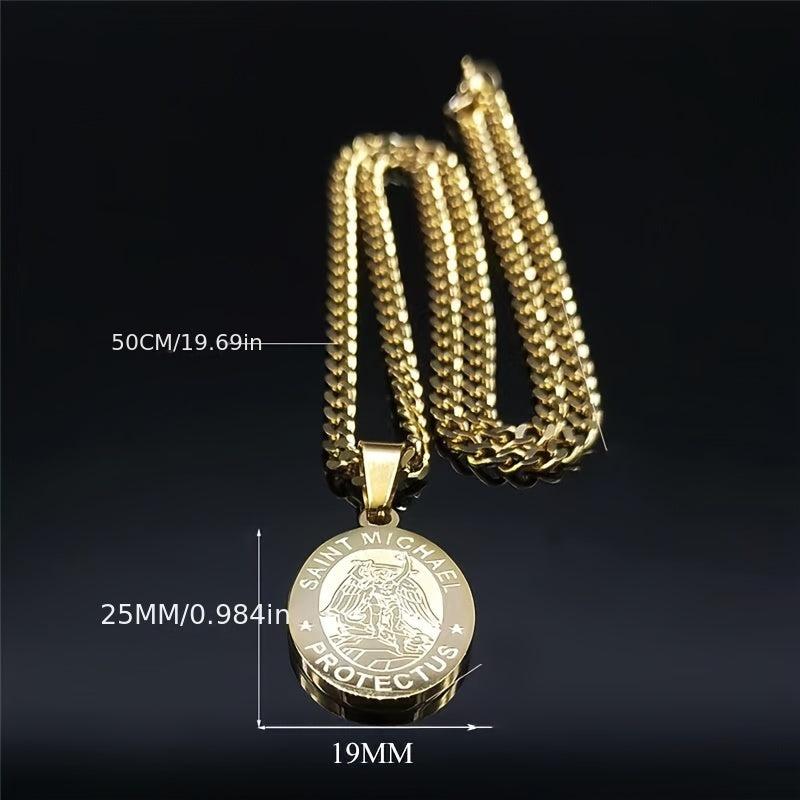 This pendant necklace features a St. Michael pattern design suitable for both men and women. It is a stylish accessory to add to your collection.