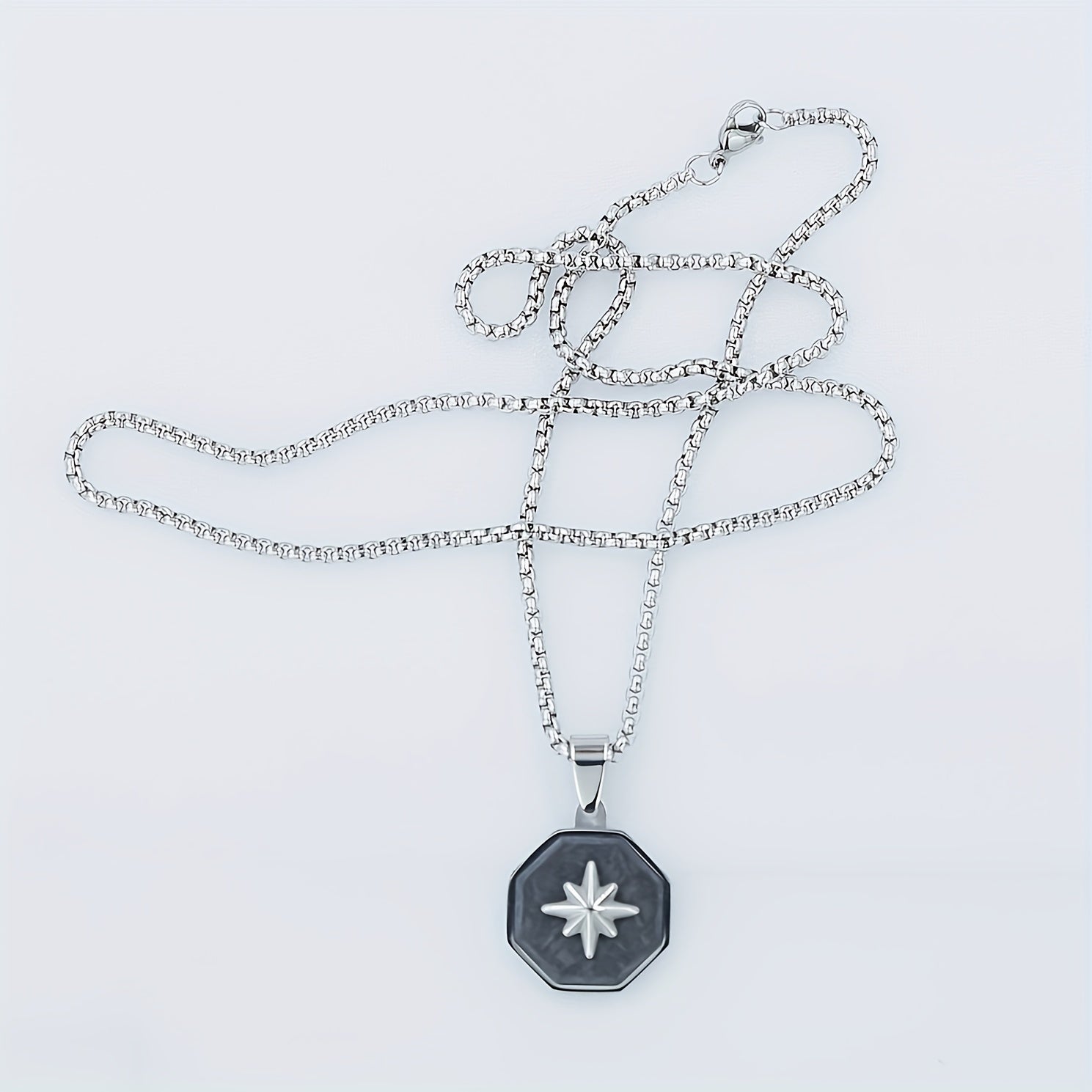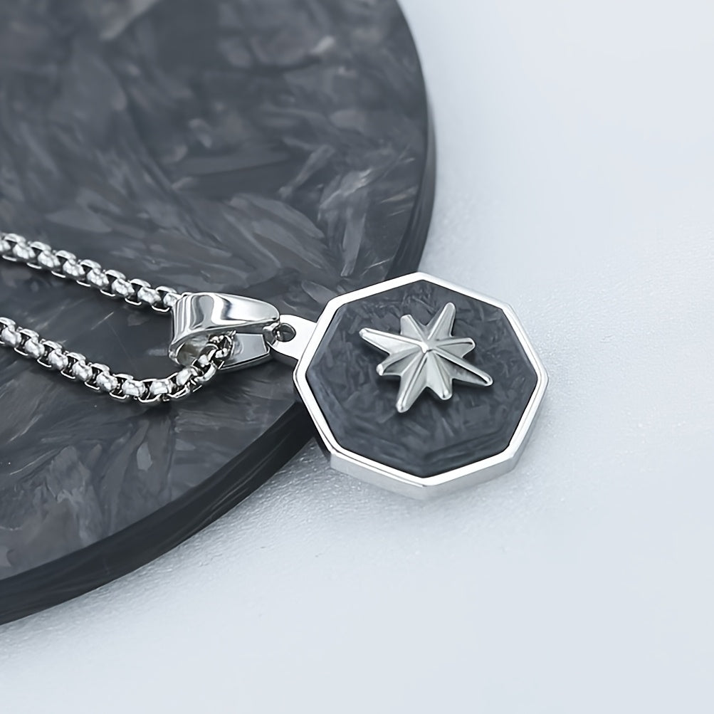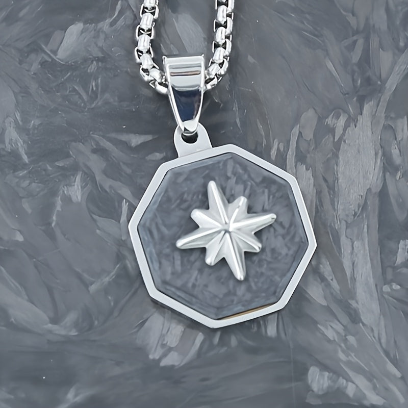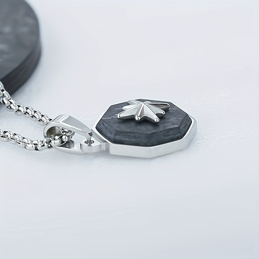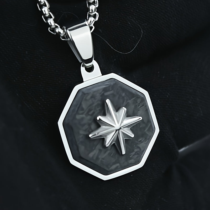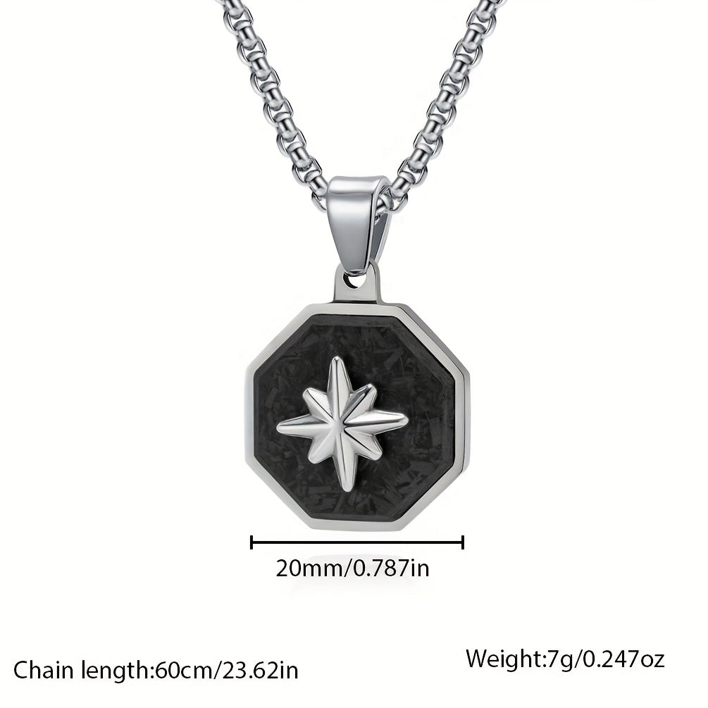 This stylish pendant features a forged octagonal star design with meteorite and carbon fiber accents, perfect for men.