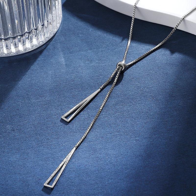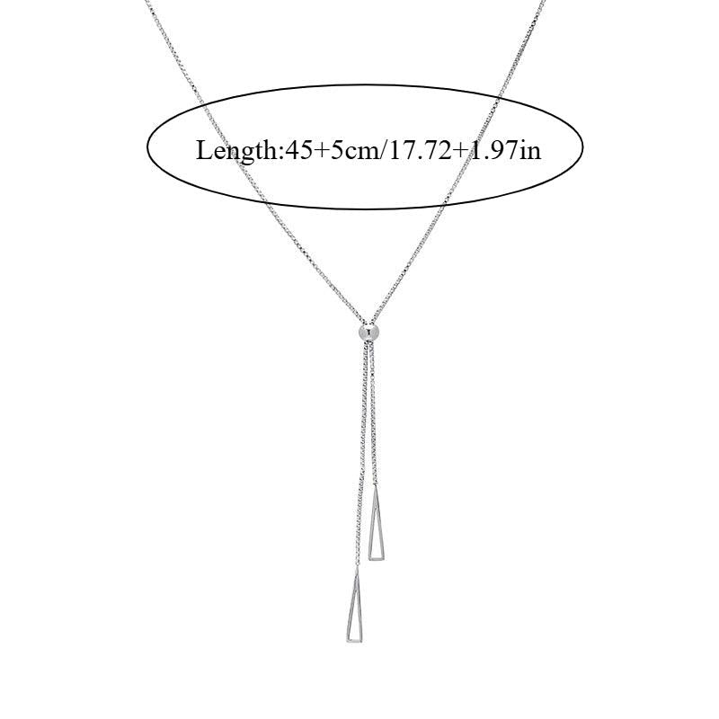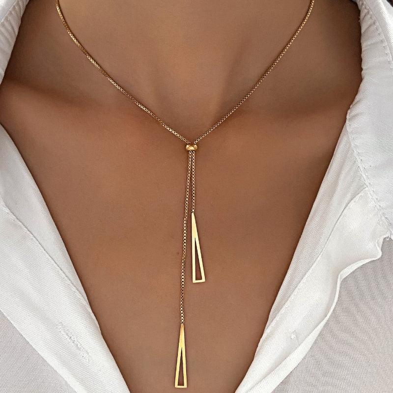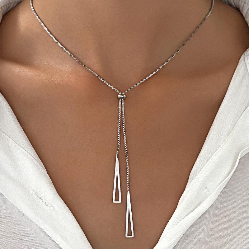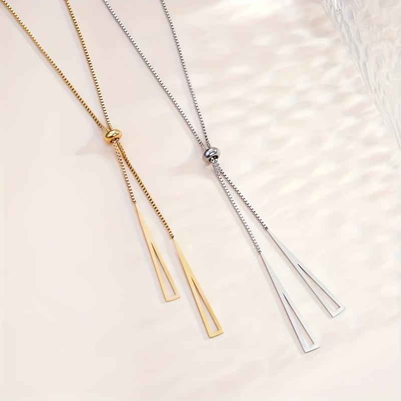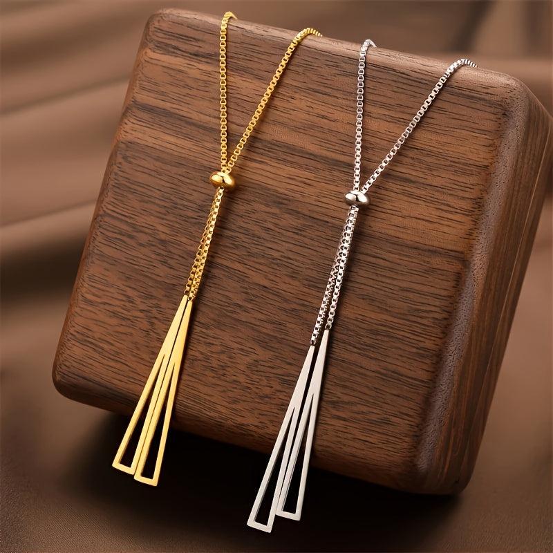 Elegant stainless steel necklace with triangle pendant and tassel design. Adjustable length chain for casual or gifting. Vintage fashion.