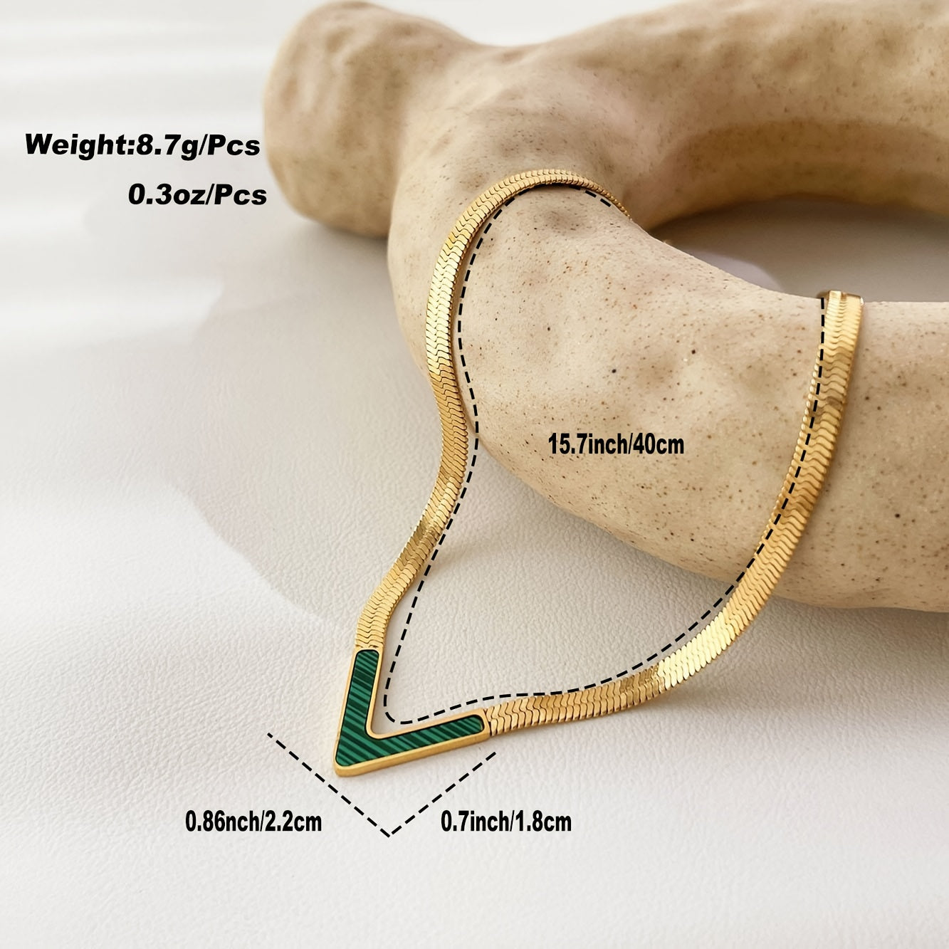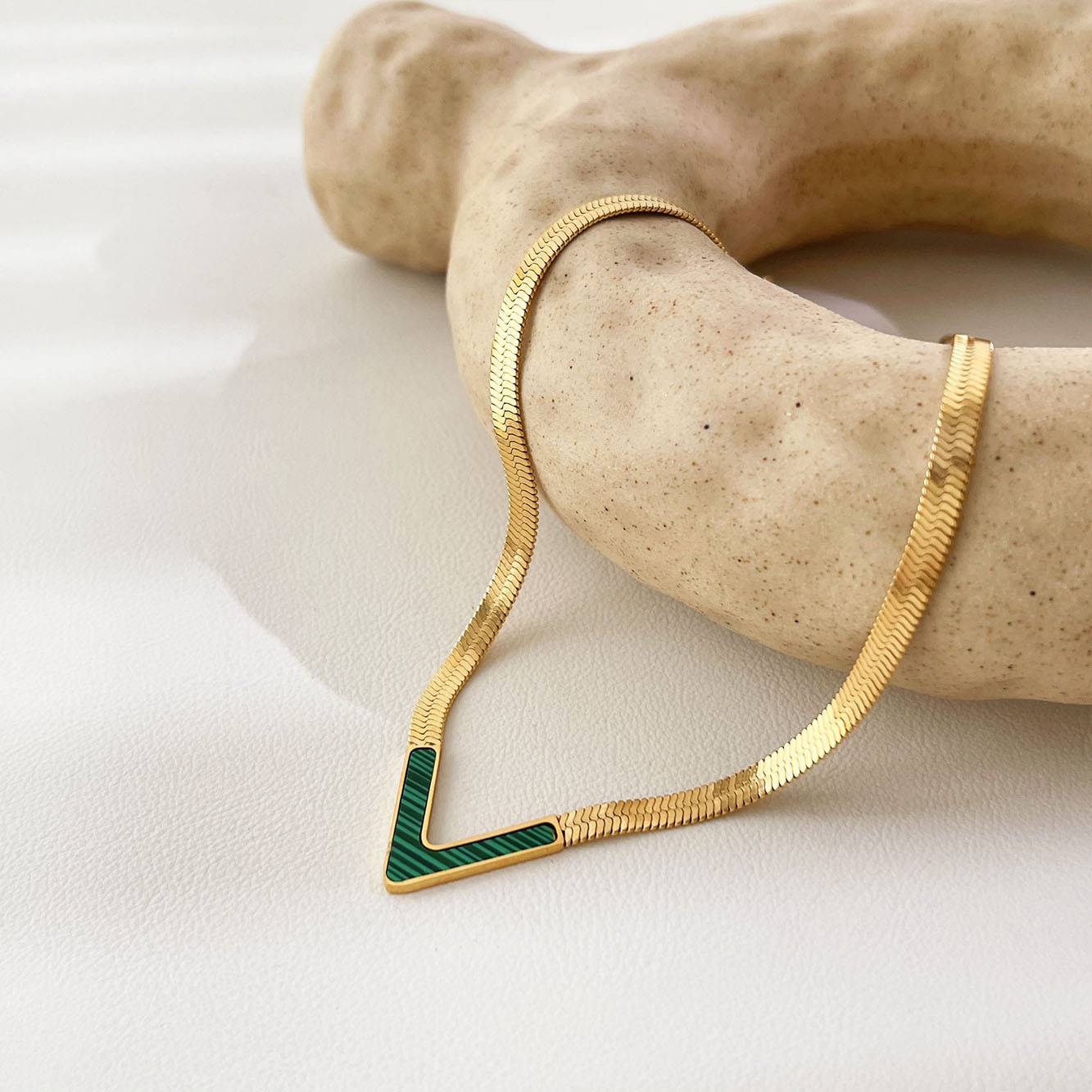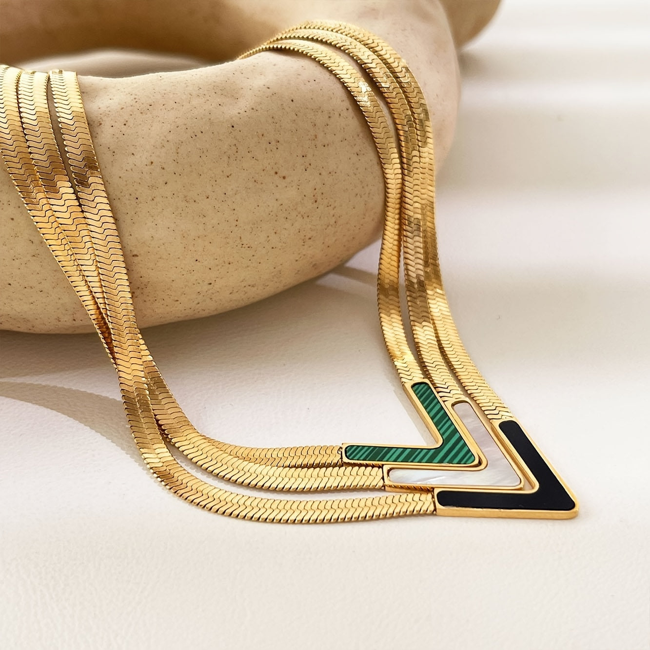 Elegantly designed high-end V-neck flat collarbone chain for girls. Stainless steel 18K plated snake bone chain suitable for daily wear.